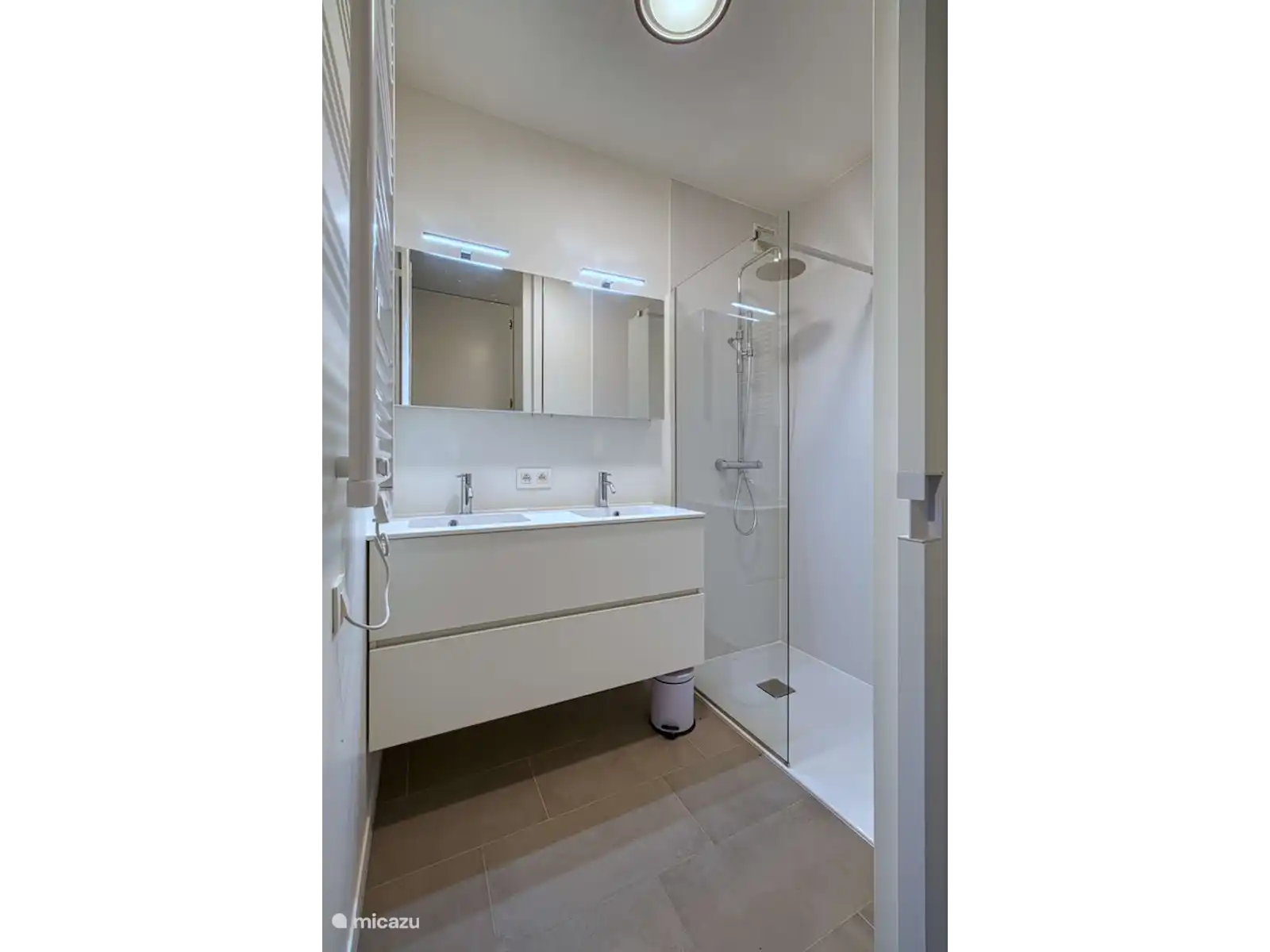 Nieuwe badkamer met regendouche en dubbele wastafel.