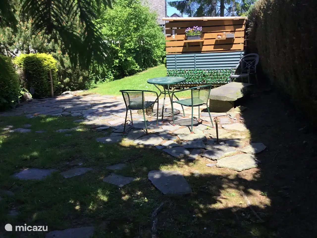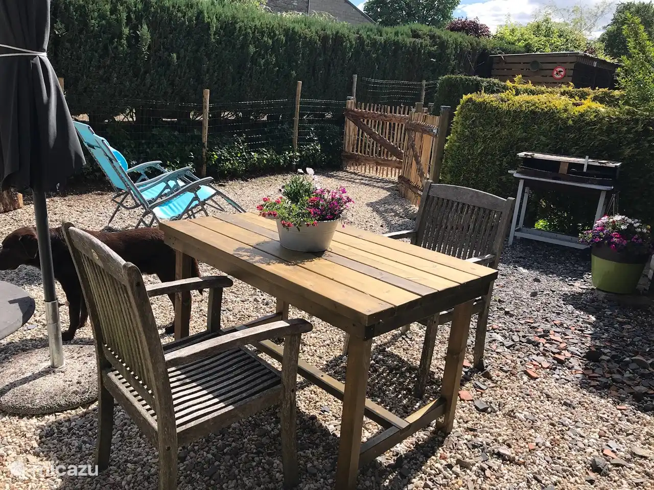 Buiten 2 x eigen privé tuintje + terras, waarvan 1 tuintje + terras compleet omheind is en ook met een BBQ.