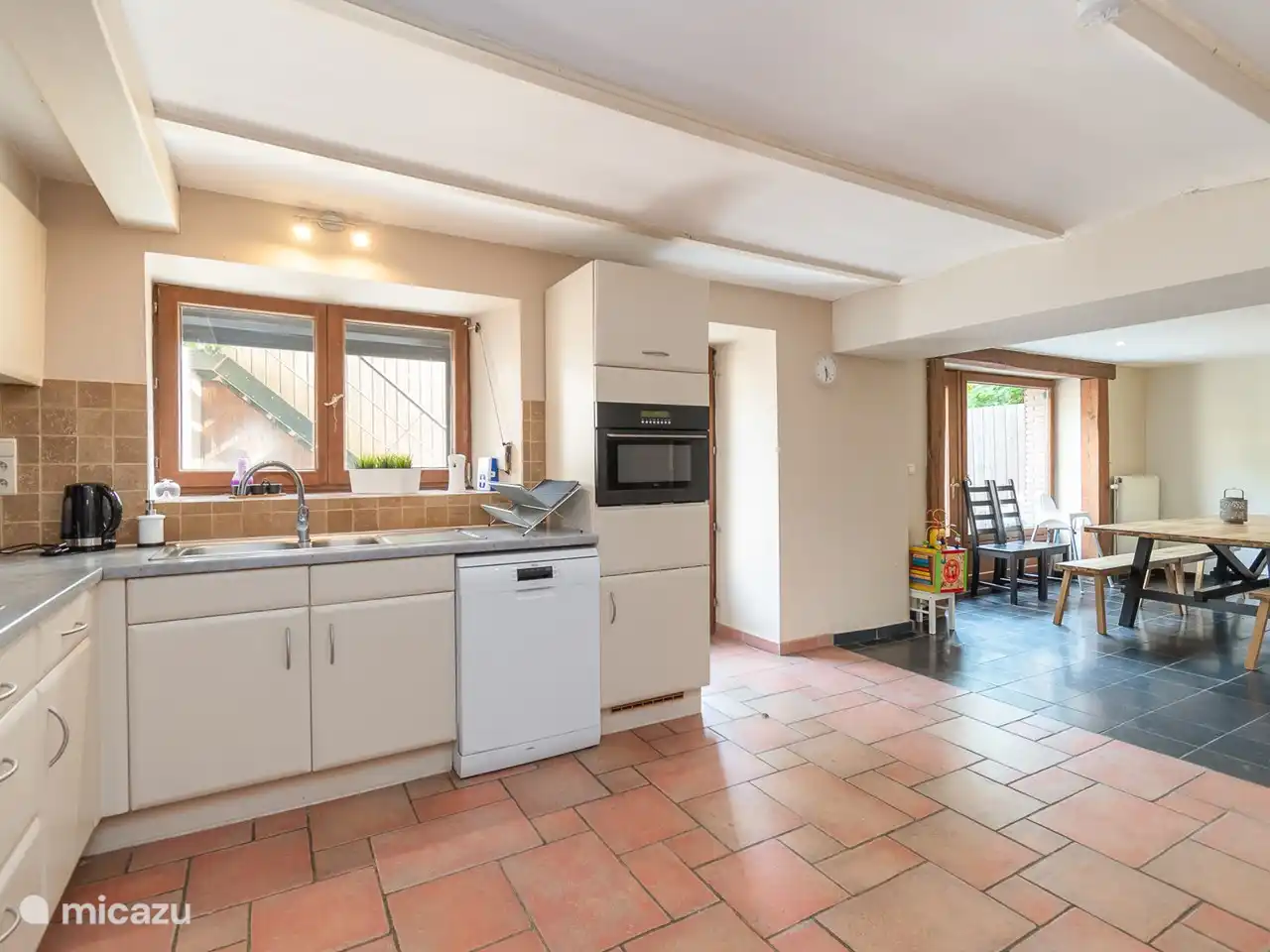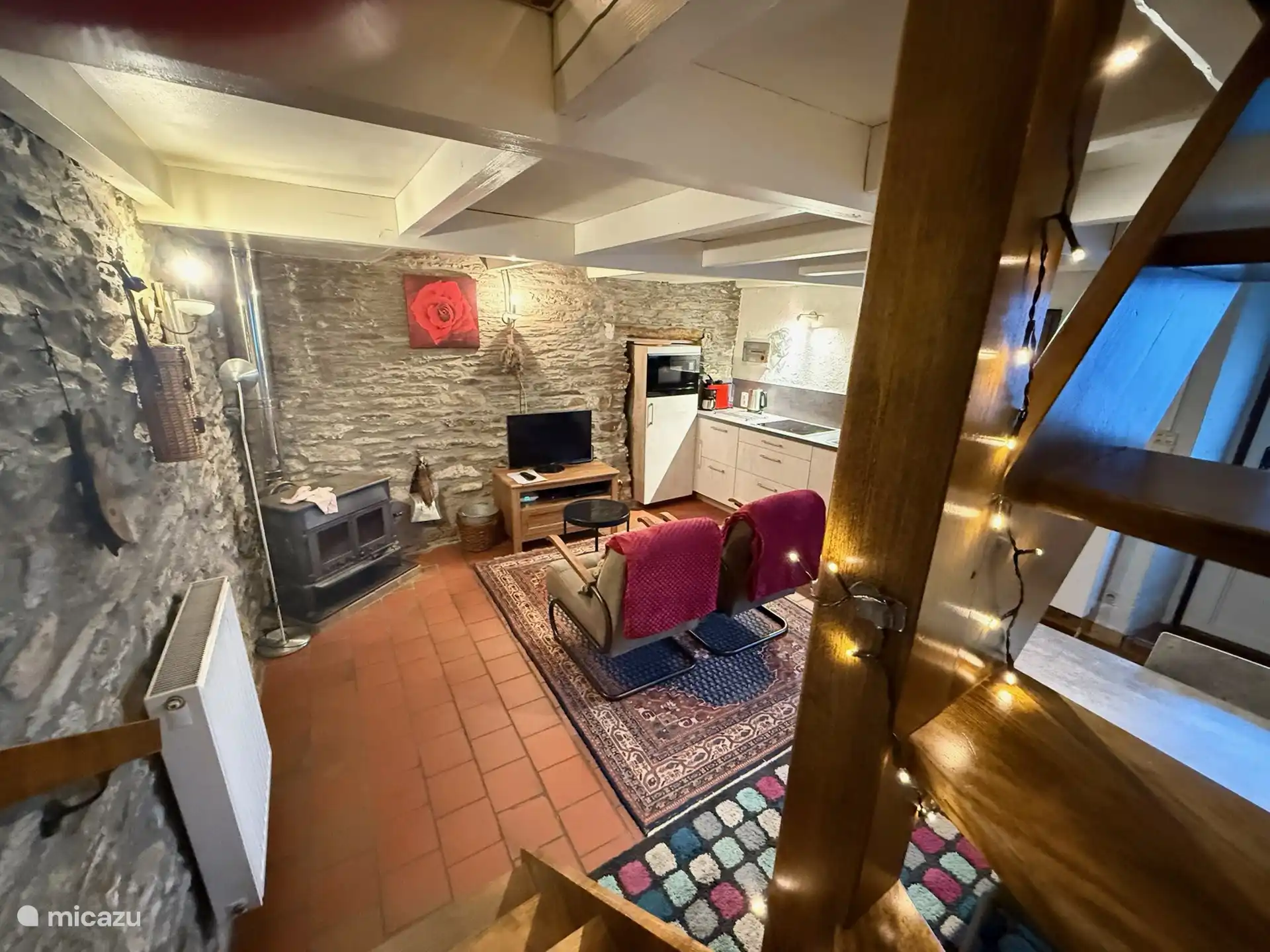 Op het gelijkvloers bevindt zich de  leefruimte en compleet nieuw ingericht keukentje sinds 5-11-2024, voorzien van 4 pits keramische kookplaat en combi-oven (grill/hete lucht/microgolf), verder koelkast + diepvriesvak, pannen + service, dubbele koffiezetter ( Senseo swift), waterkoker,keukenlinnen zijn aanwezig.