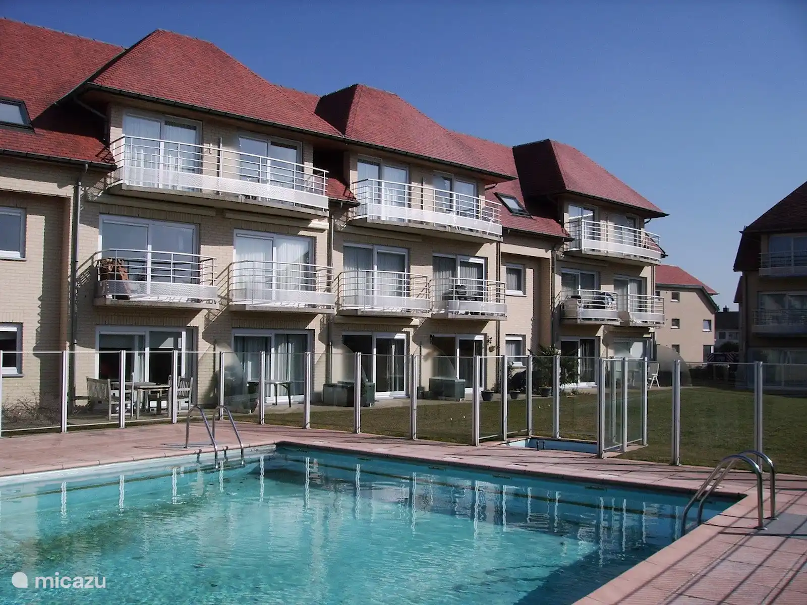 Rond het zwembad is er een glazen wand zodat het ook veilig is voor kleine kinderen; het zwembad zelf is enkel toegankelijk voor eigenaars/huurders.