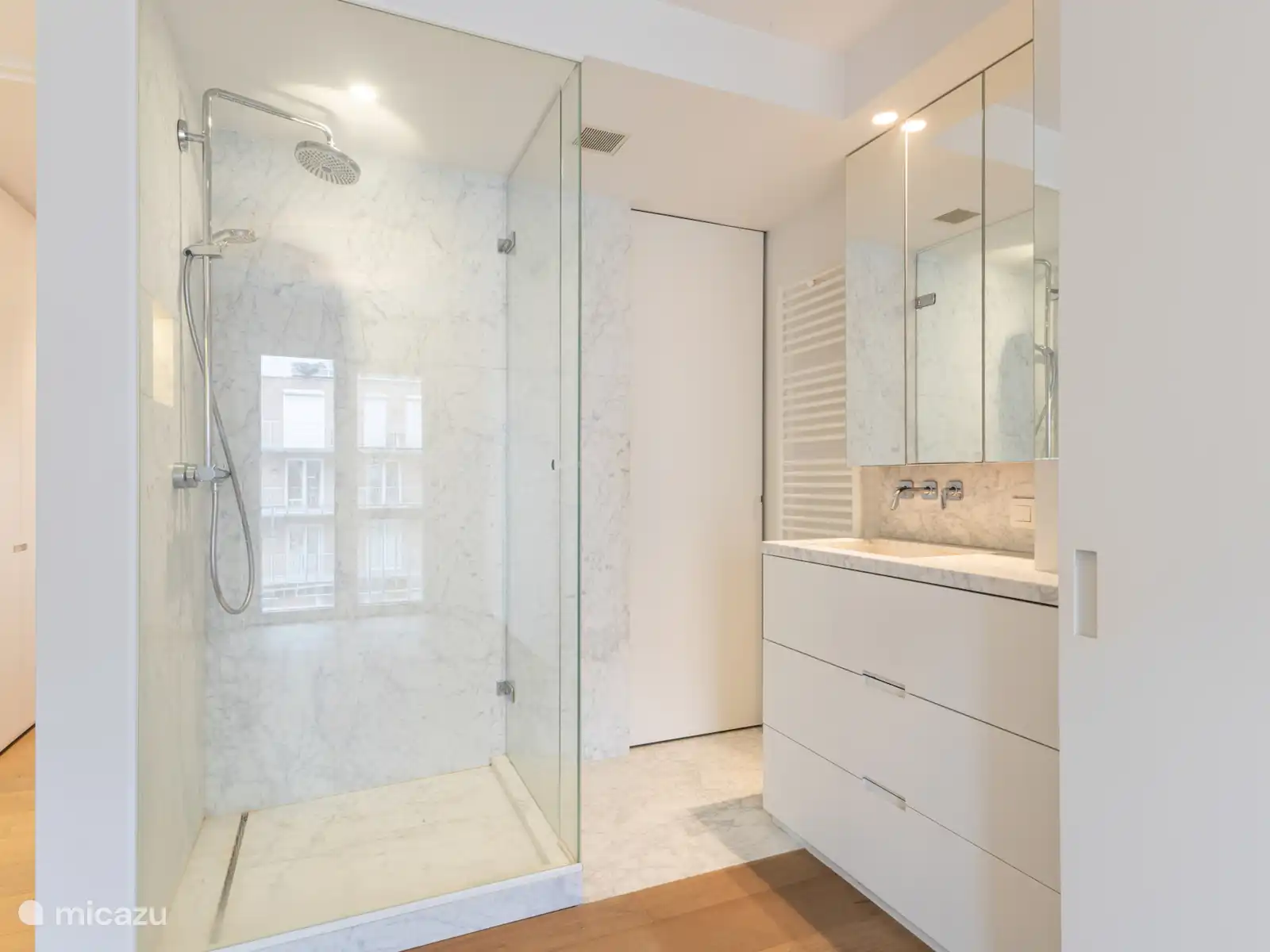 Parkeren op wandelafstand (grote garagebox geschikt voor de allergrootste wagens met ook plaats om fietsen te stallen) is optioneel op aanvraag vooraf en tegen een extra vergoeding per dag (voor reservering contact opnemen met de eigenaren). De residentie is zowel via de hoofdingang aan de Koningslaan als via de Parmentierlaan te betreden.