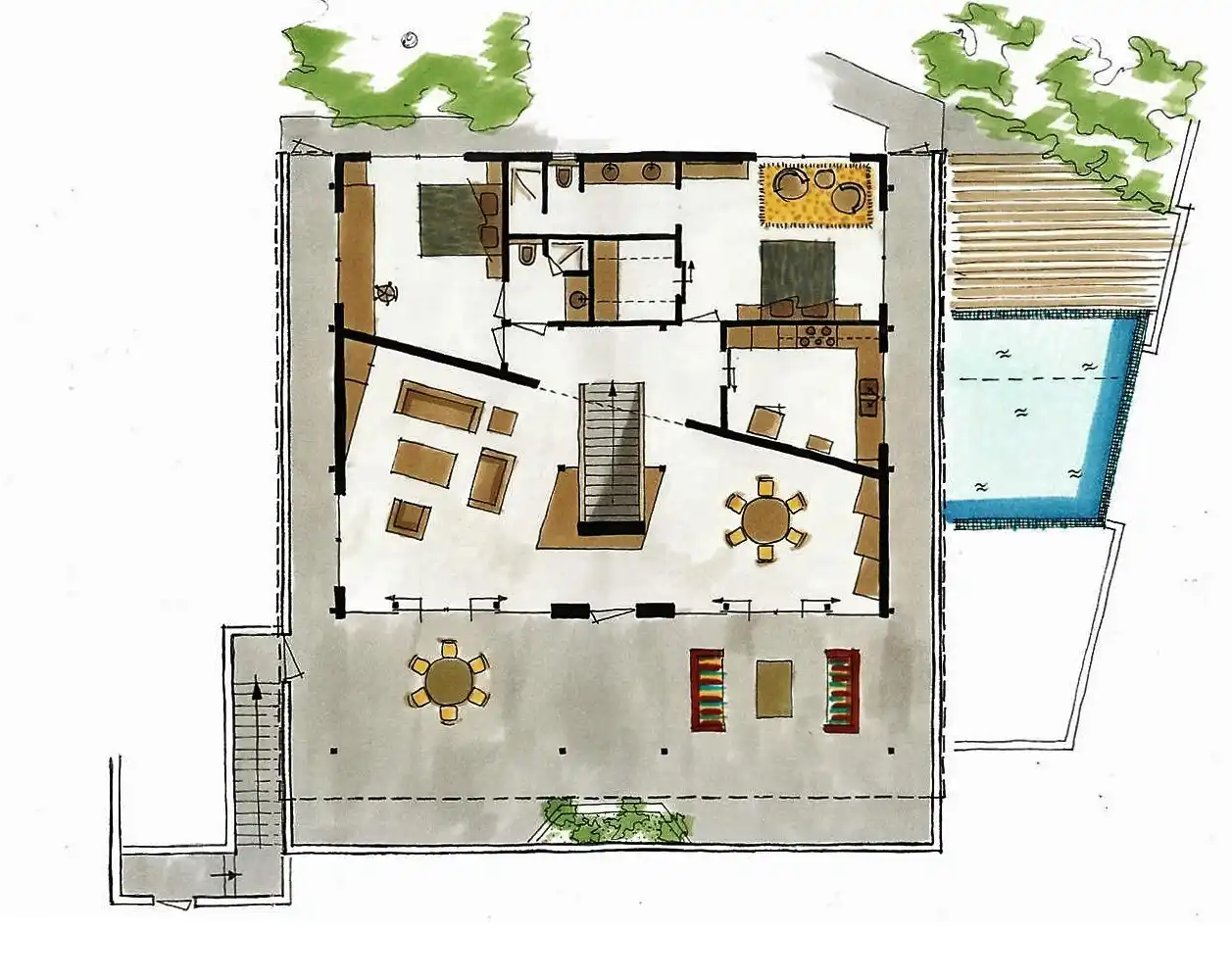 De open woonruimte loopt naadloos over in een grote veranda met een grote eettafel, met een spectaculair panoramisch uitzicht over de Caribische Zee. Geniet elke avond van onvergetelijke zonsondergangen vanuit het comfort van je eigen villa. Met 4 slaapkamers en 4 badkamers biedt Villa Korsou comfortabel plaats aan maximaal 8 gasten.