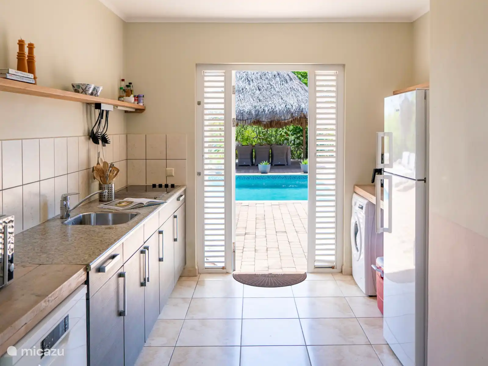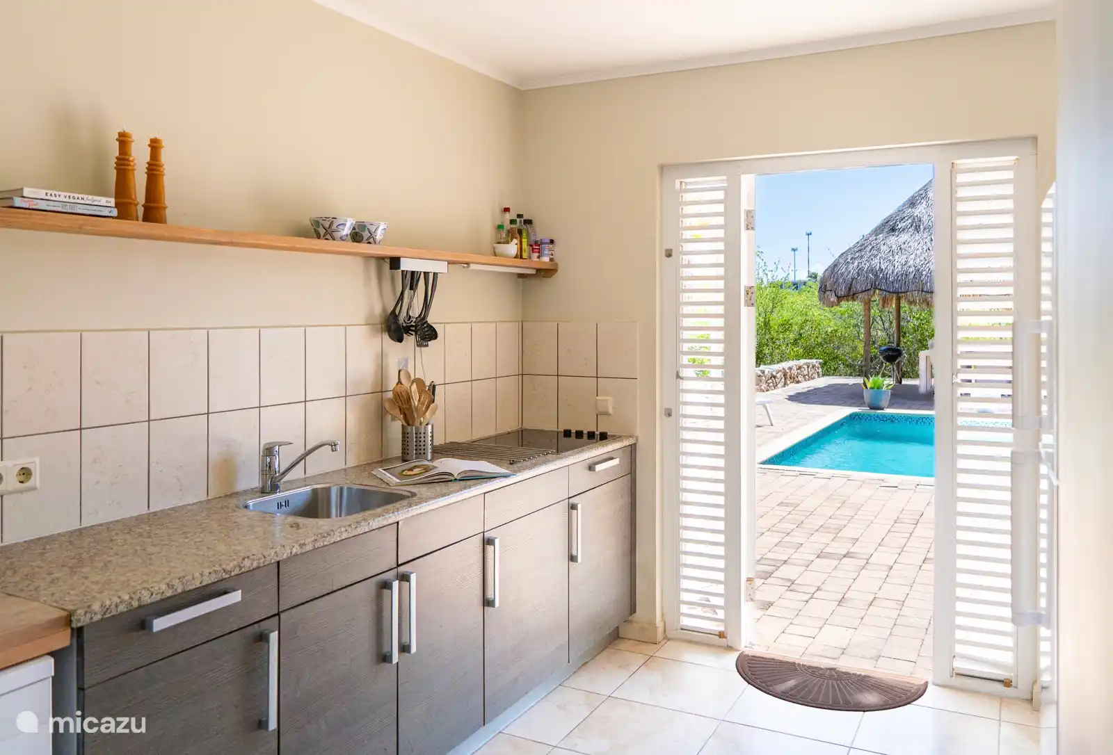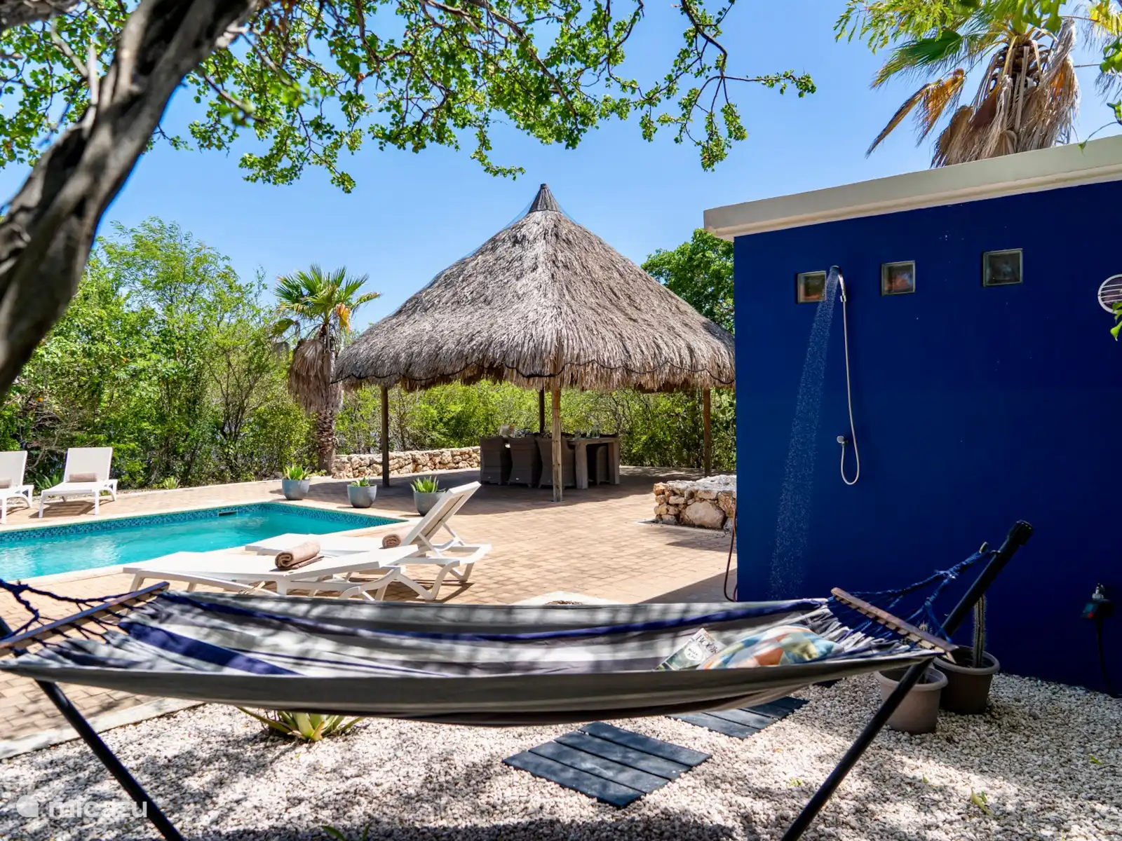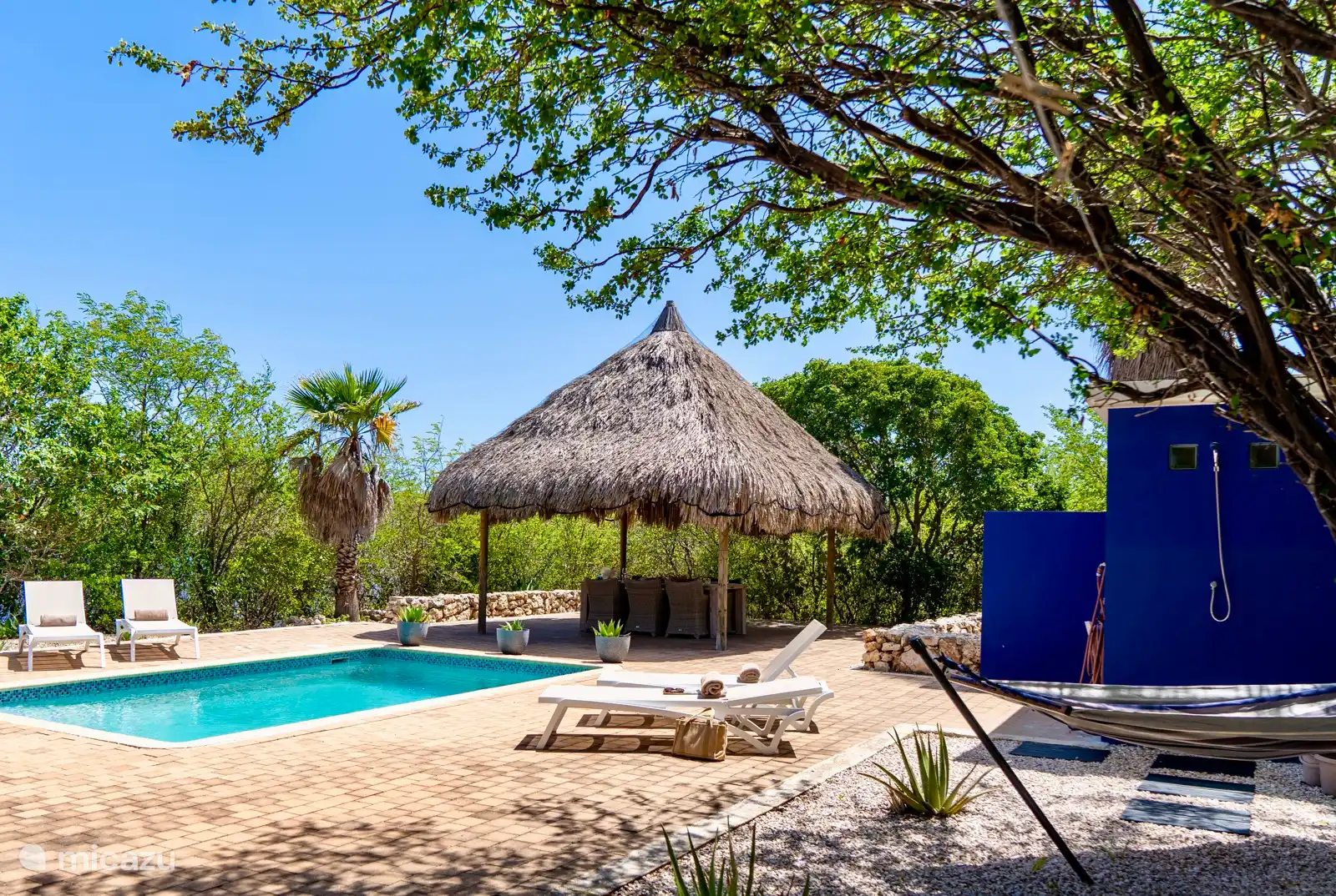 De tuin achter het huis is gunstig gelegen ten opzichte van de wind, die er eigenlijk altijd is en uit dezelfde richting waait, zodat het ook lekker is als de zon hoog staat en het echt warm is. Er is een groot zwembad met daaromheen veel ruimte om te relaxen en voor kinderen om te spelen. Er is ook een hangmat om lekker te chillen. De grote palapa biedt een schaduwplek, waar je ’s avonds lekker kunt barbecueën.