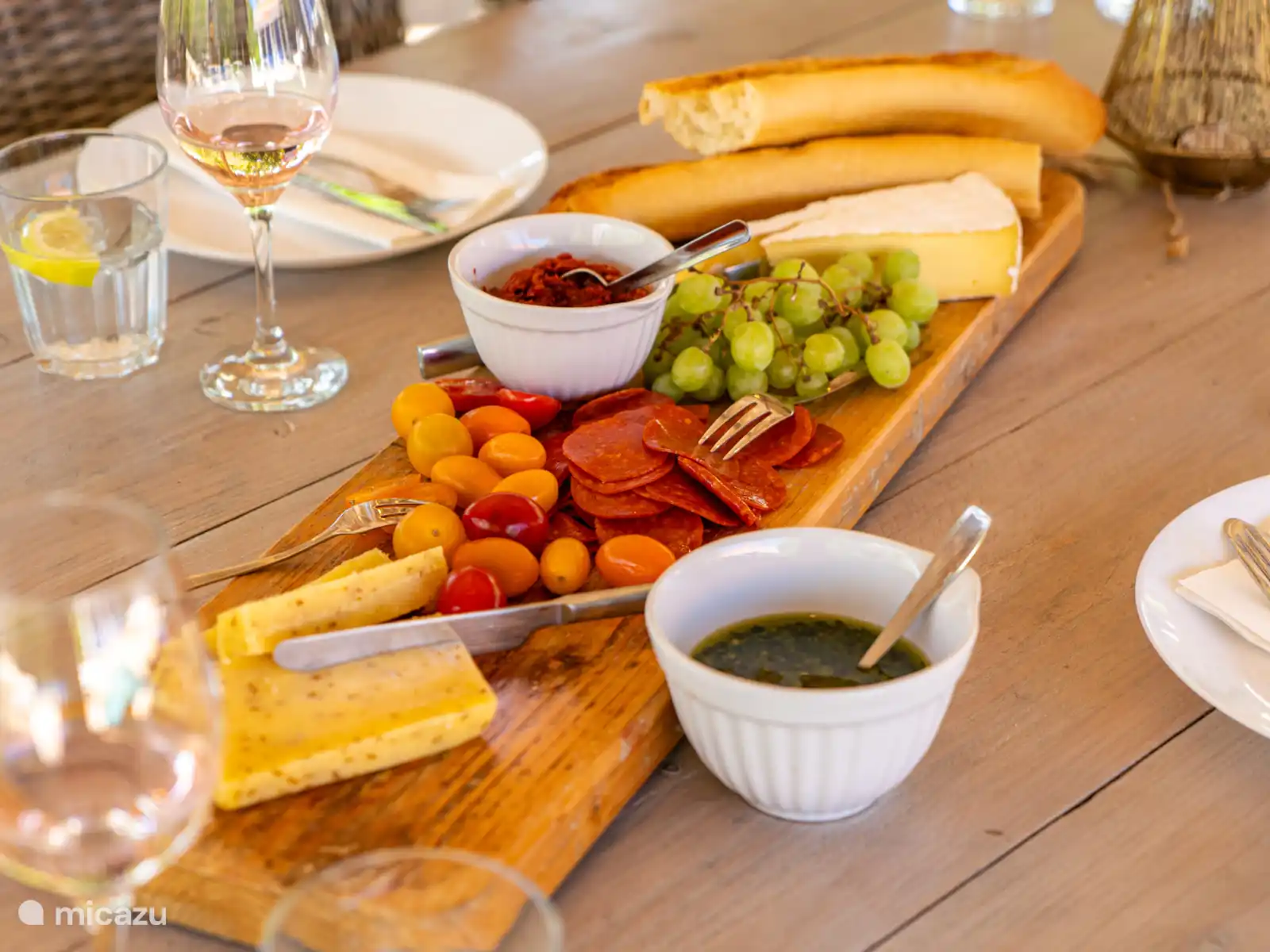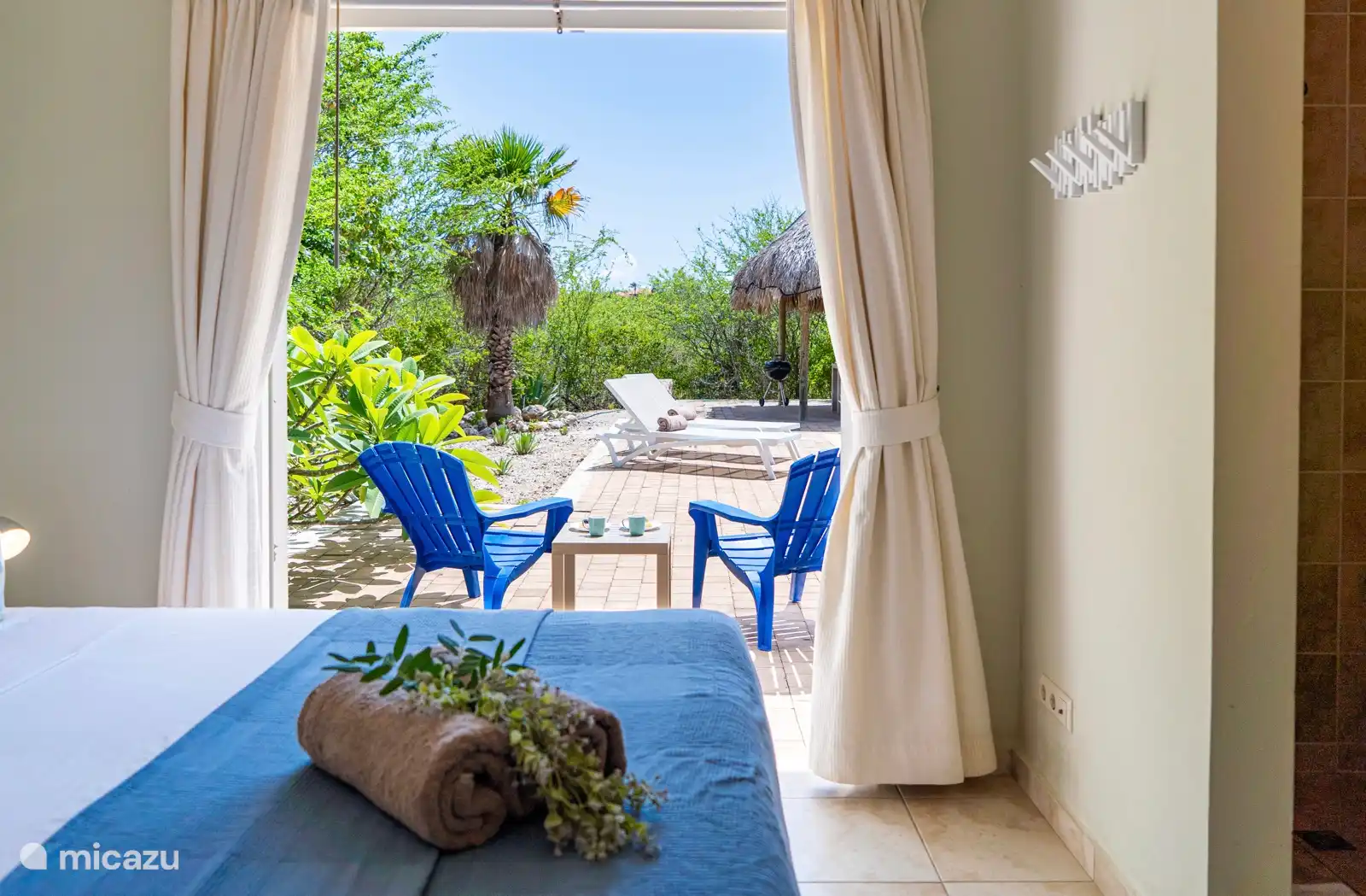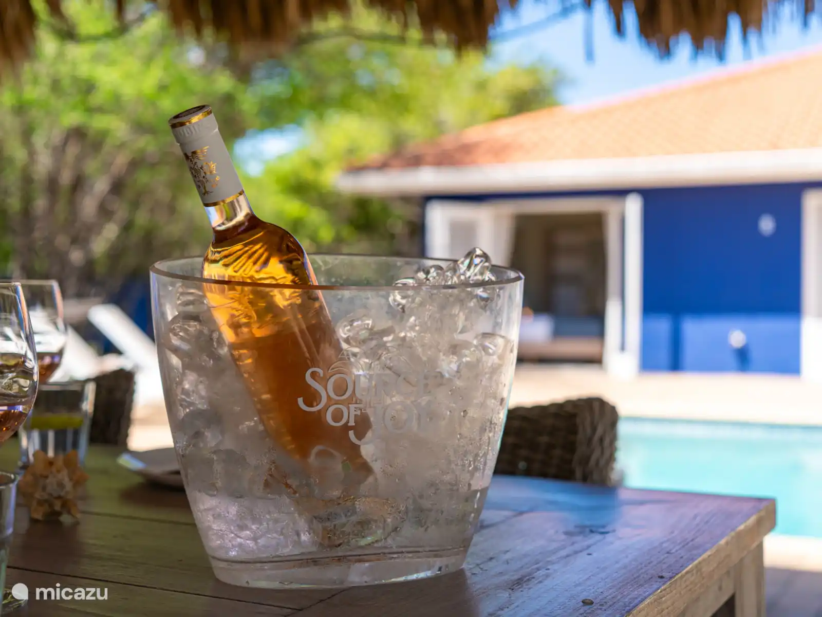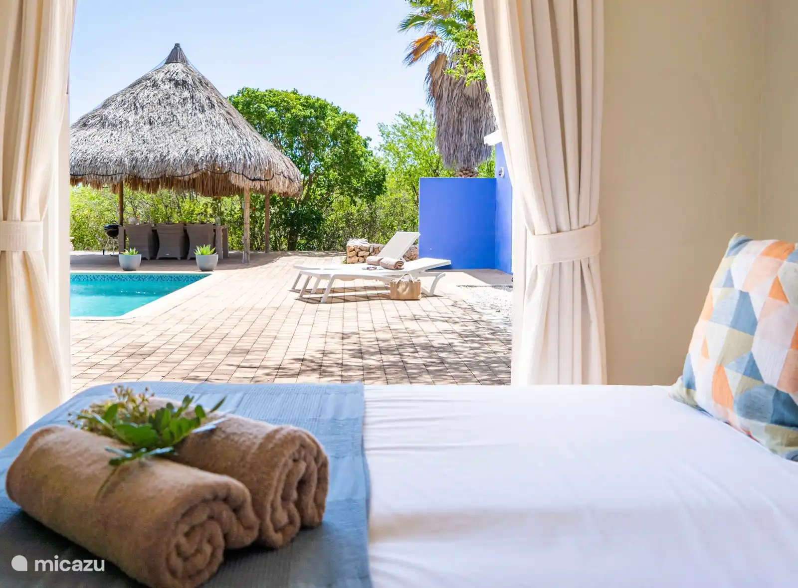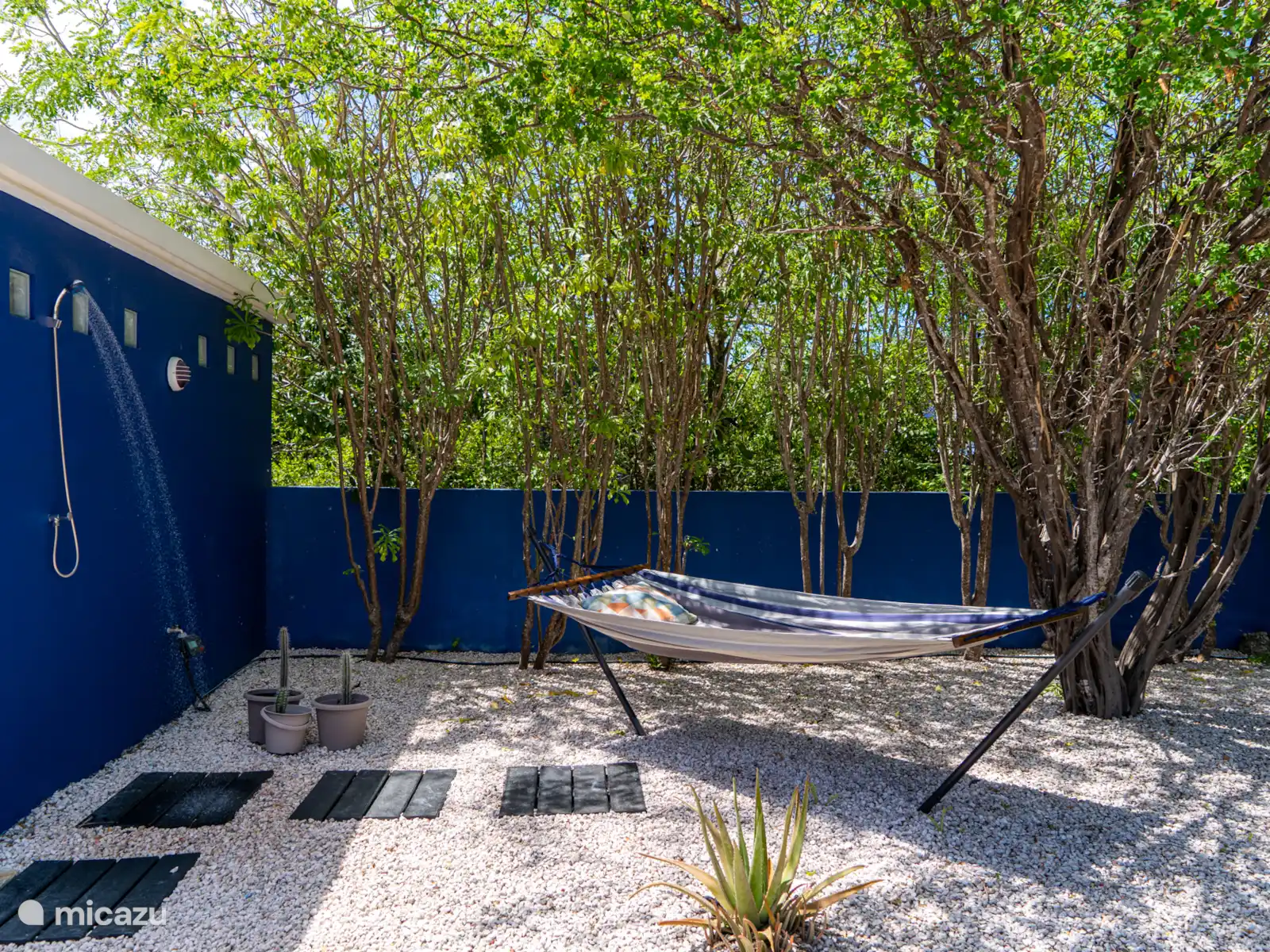 De tuin achter het huis is gunstig gelegen ten opzichte van de wind, die er eigenlijk altijd is en uit dezelfde richting waait, zodat het ook lekker is als de zon hoog staat en het echt warm is. Er is een groot zwembad met daaromheen veel ruimte om te relaxen en voor kinderen om te spelen. Er is ook een hangmat om lekker te chillen. De grote palapa biedt een schaduwplek, waar je ’s avonds lekker kunt barbecueën.