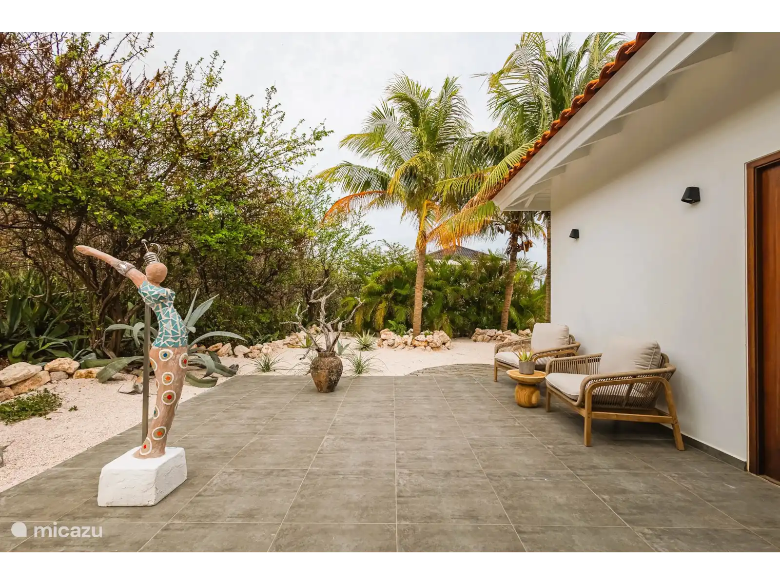 Aan de entreezijde bevindt zich een intiem tuinterras, harmonieus ingebed in de natuurlijke omgeving – perfect voor een rustig moment in de schaduw of zwoele avond. Onderdeel van het terras is het kunstwerk genaamd "Freedom", een krachtig en sereen beeld van de lokale kunstenaar Otmar Jennie, dat bijdraagt aan het ultieme Caribische zengevoel.