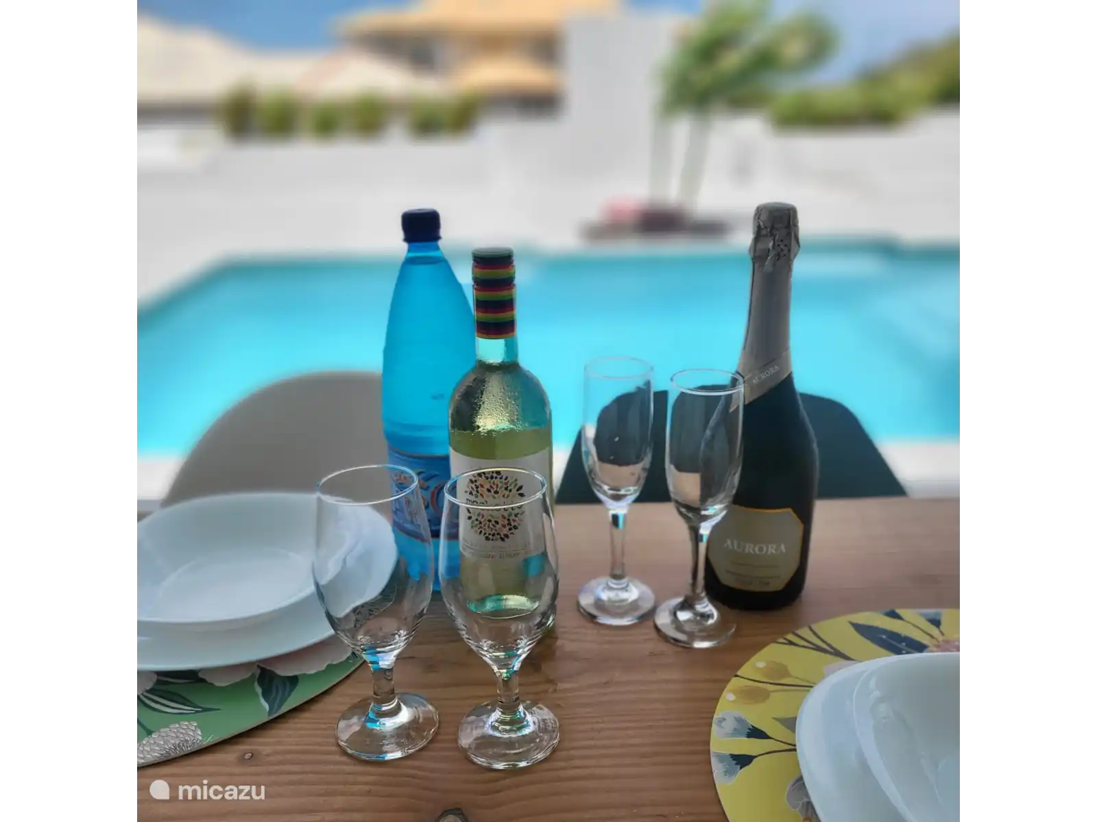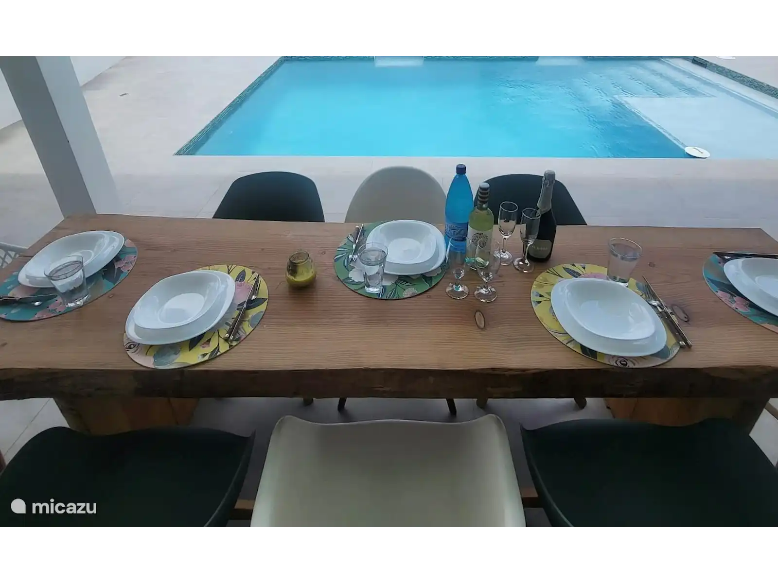 Het grote privé zwembad heeft een afmeting van is 7 bij 4 meter en een diepte van 1.60 meter. Er is een breed plateau aanwezig van 20 cm diepte voor de kleintjes. Er is een trap aanwezig en er zijn 2 bankjes in het zwembad om comfortabel te zitten genieten.De eettafel is geschikt voor 8 personen onder een 3 meter breed afdak, waardoor u altijd overdekt in de schaduw kunt vertoeven.