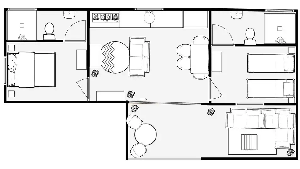 Het resort heeft 2 zwembaden waar u een heerlijke verfrissende duik kunt nemen of u kunt heerlijk ontspannen op uw privélounge op de veranda. Er zijn geen trappen, maar er is een opstap naar de veranda.