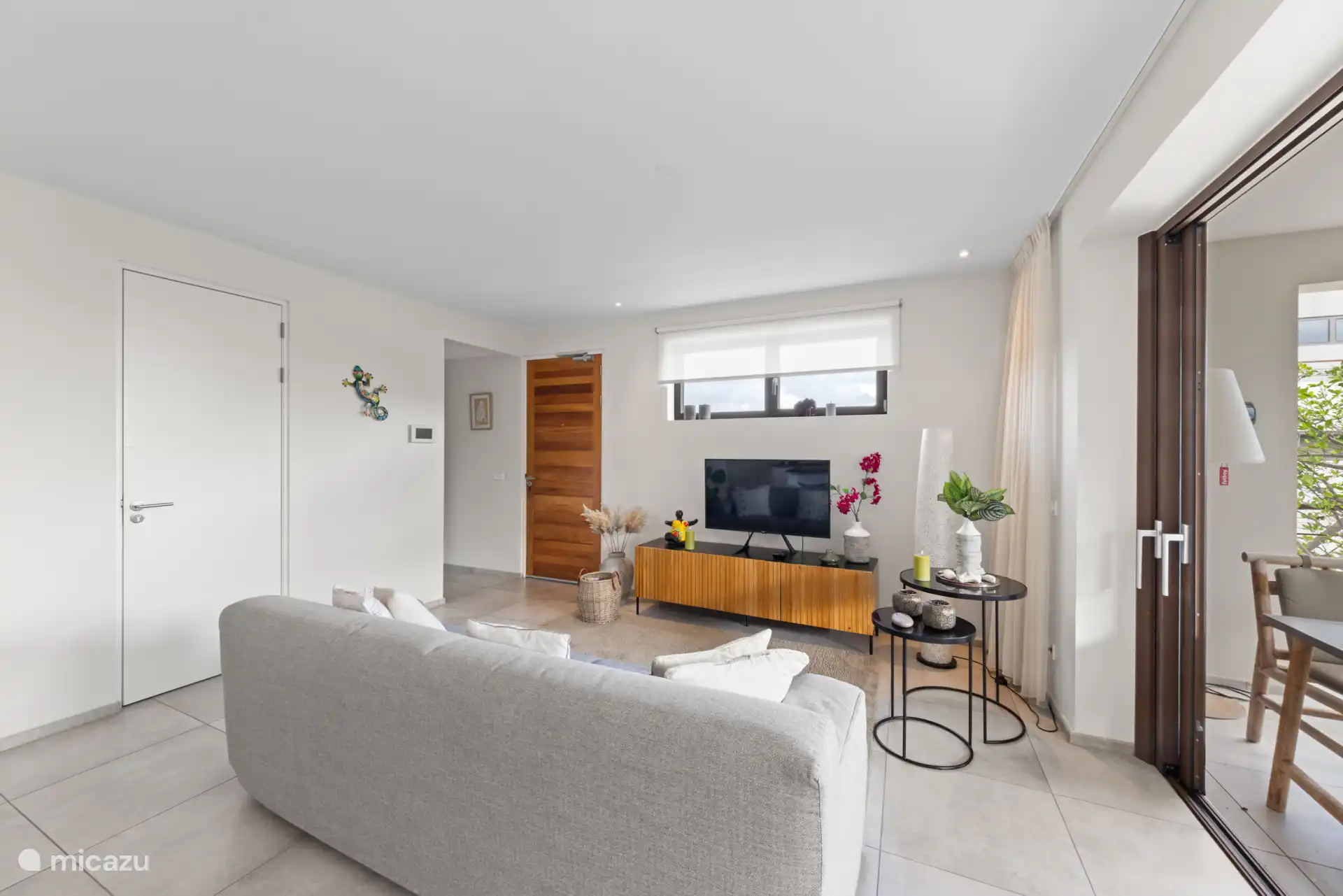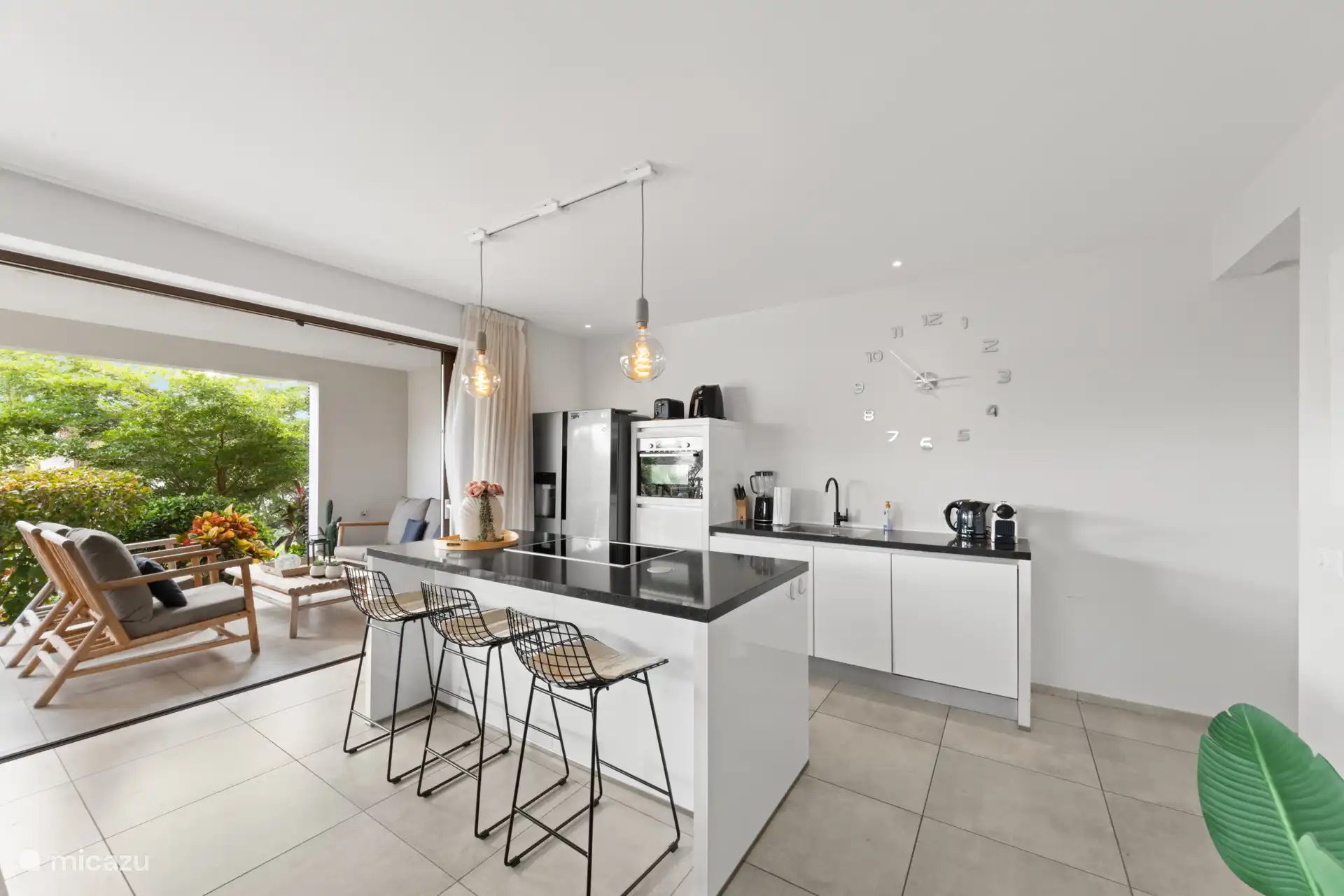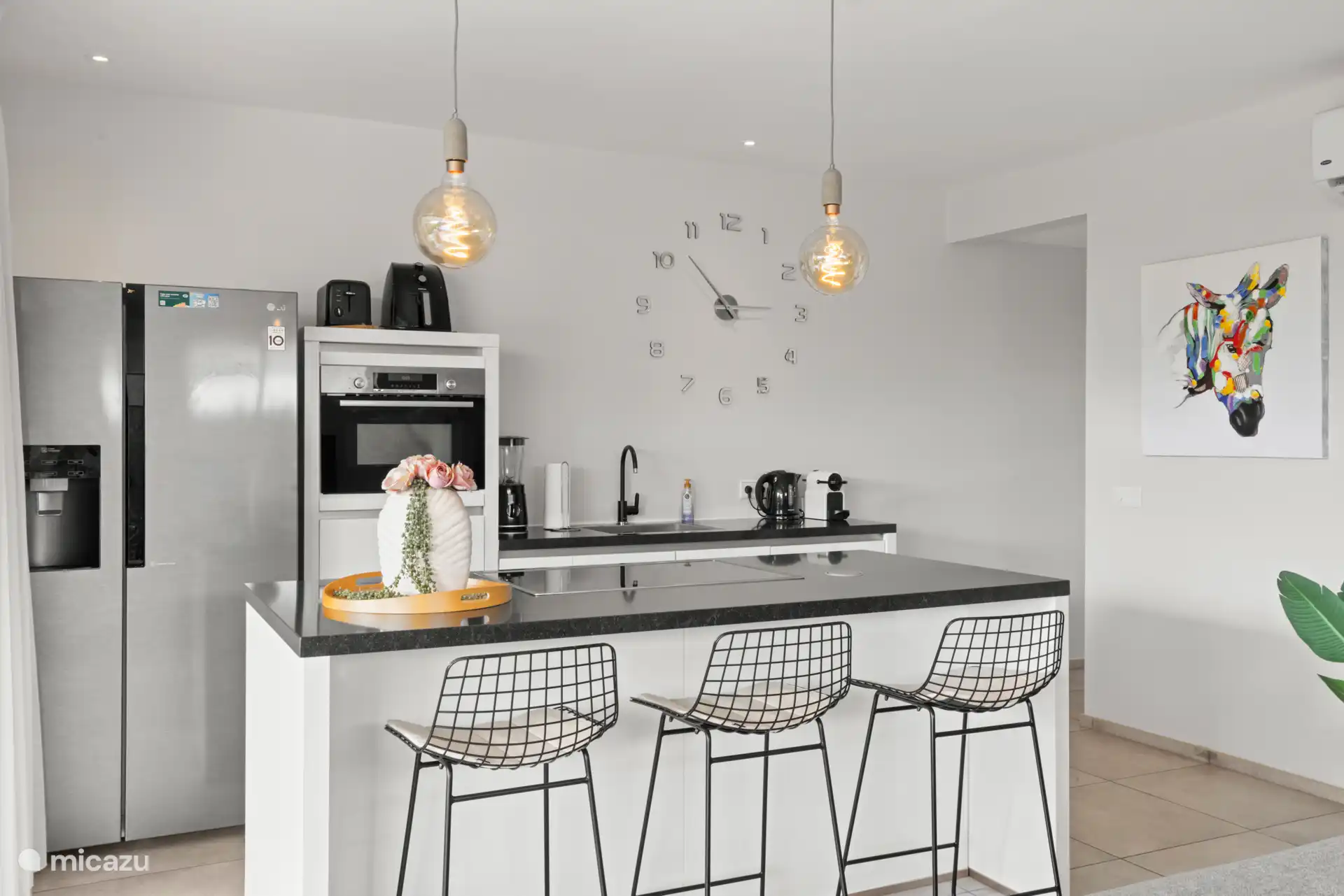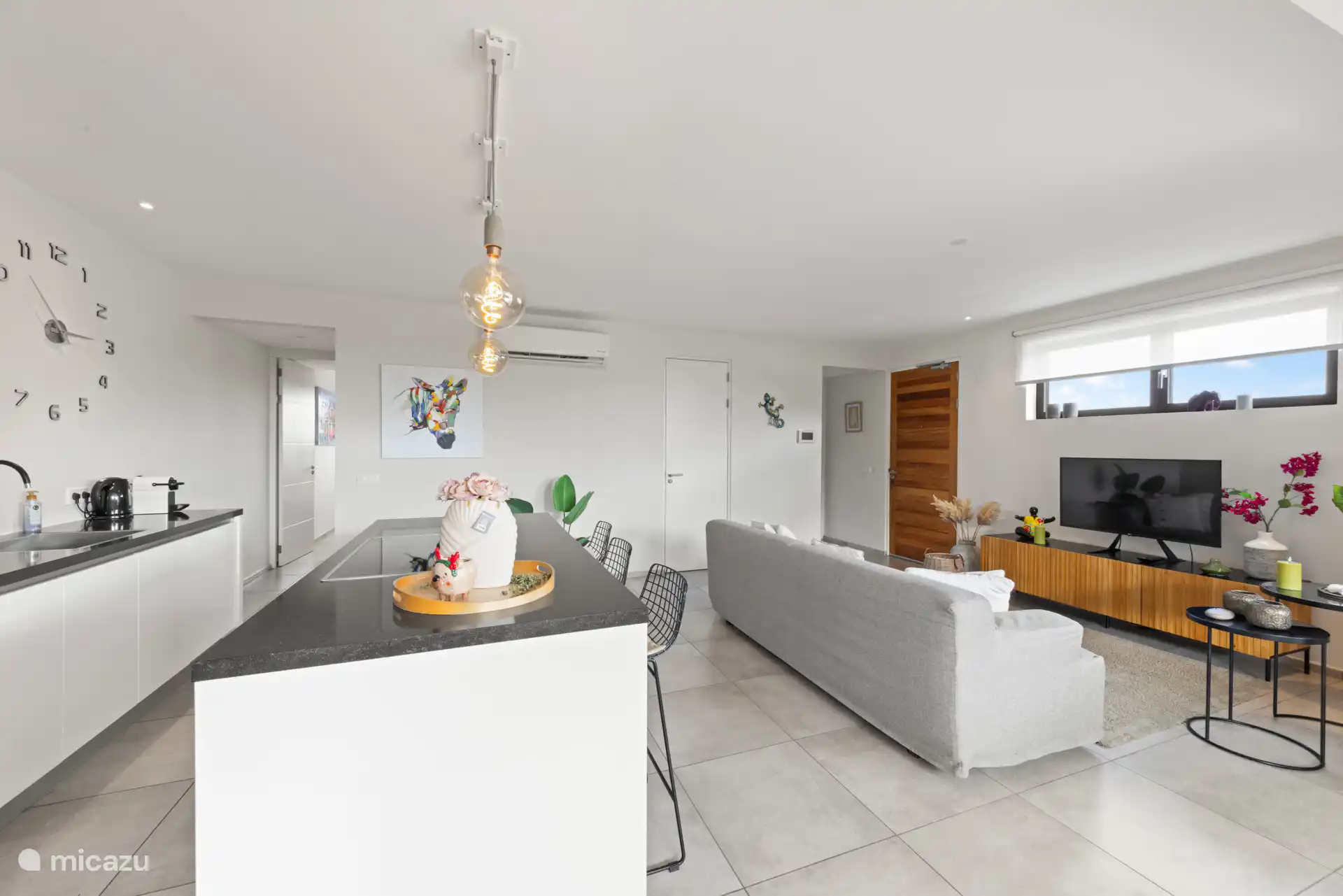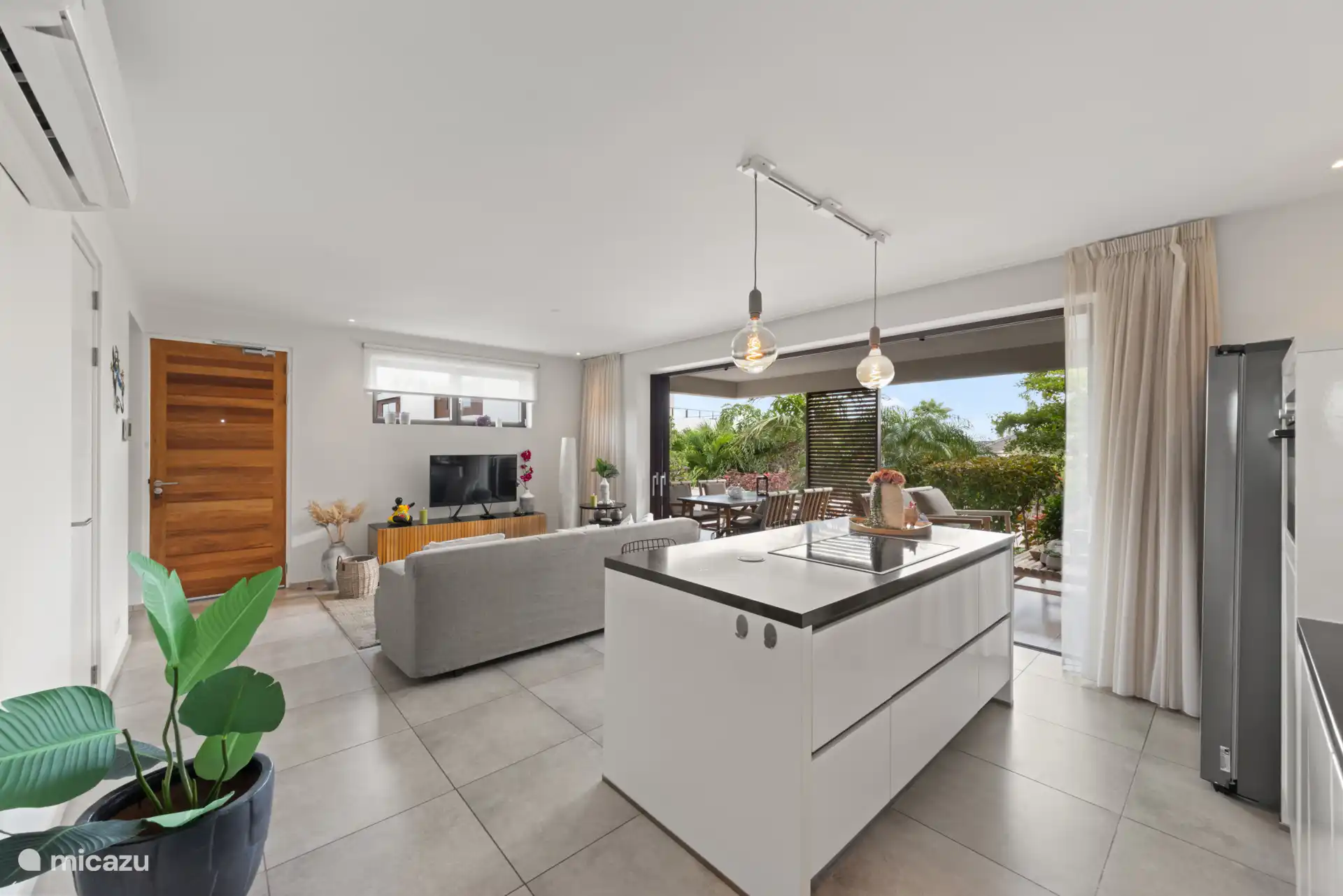 De woonkamer is ruim en licht, met comfortabele zithoek, airco, plafondventilator en een Sonos-geluidsinstallatie, zodat u zowel binnen als buiten van muziek kunt genieten. De open keuken is volledig uitgerust met moderne inbouwapparatuur. Elke slaapkamer beschikt over een televisie en airco, en de hele woning is voorzien van Philips Hue-verlichting, waarmee u eenvoudig de sfeer kunt aanpassen.