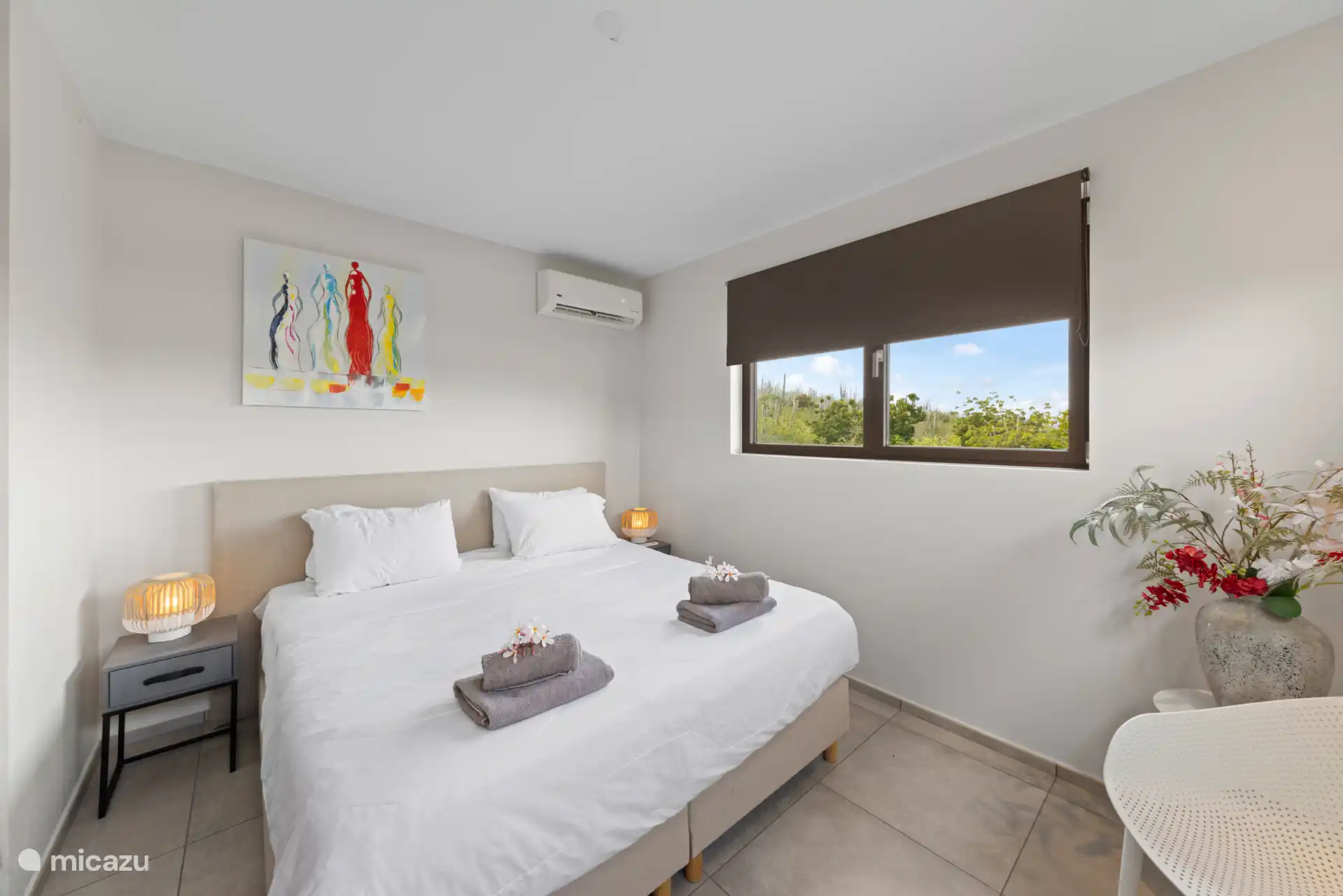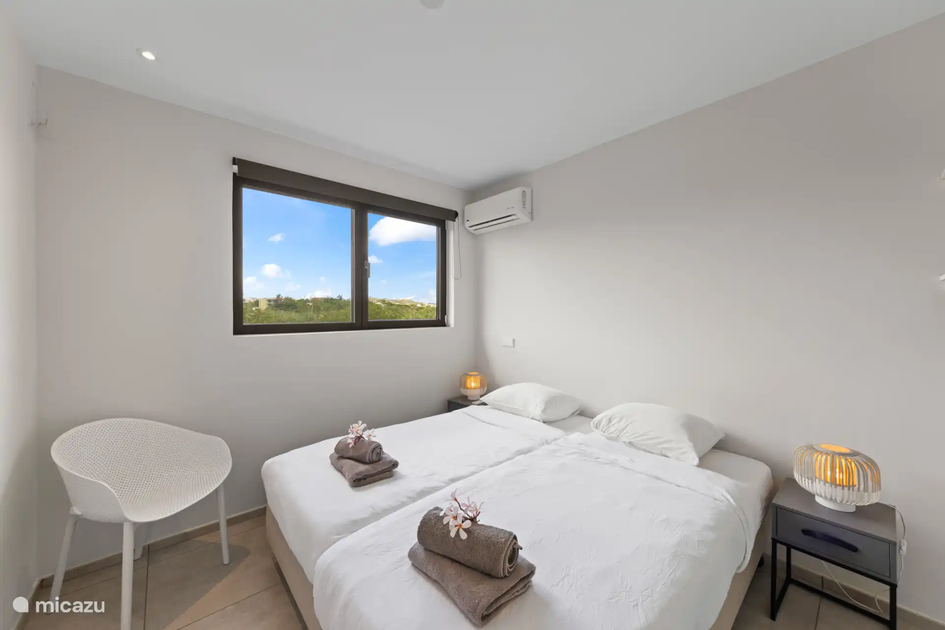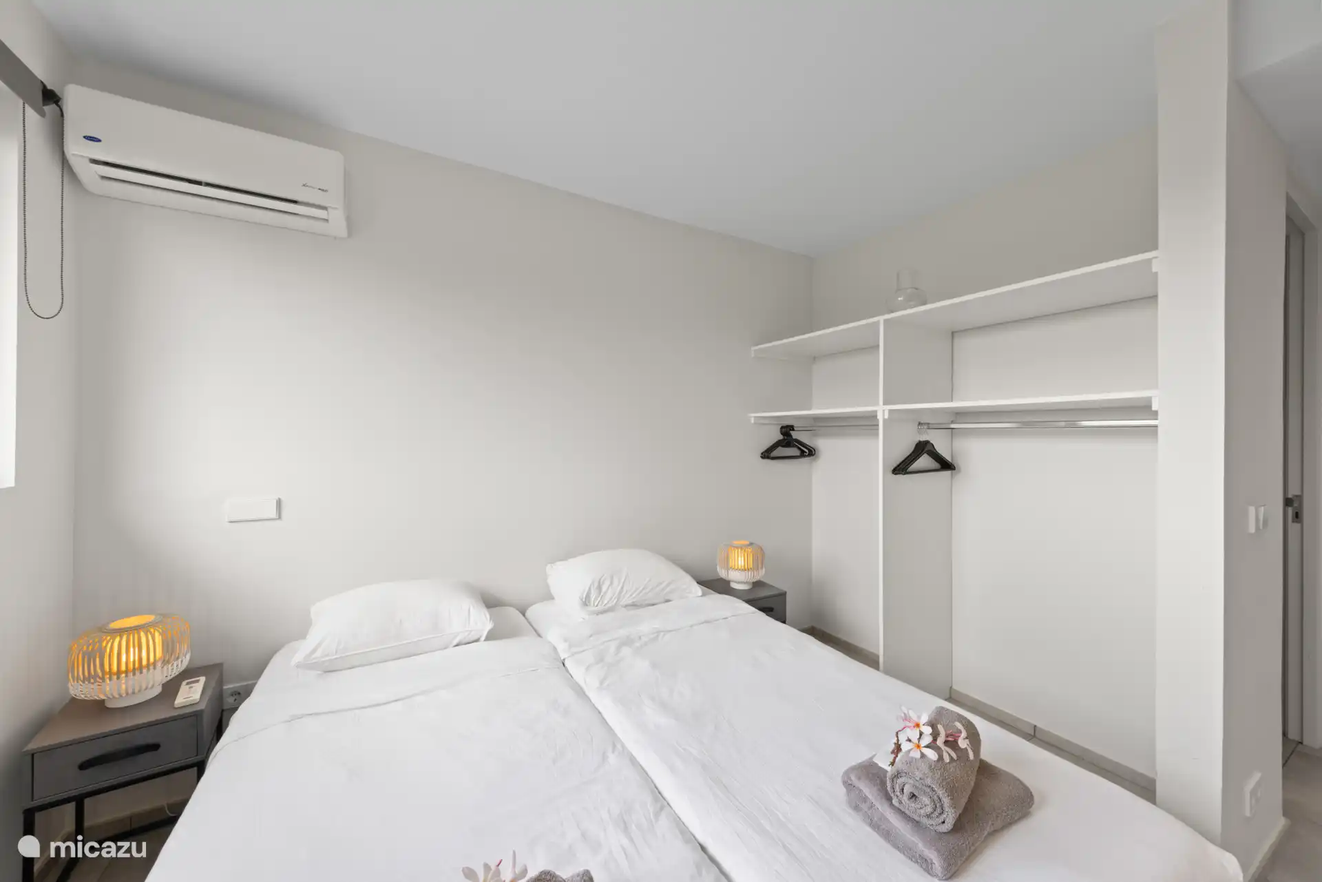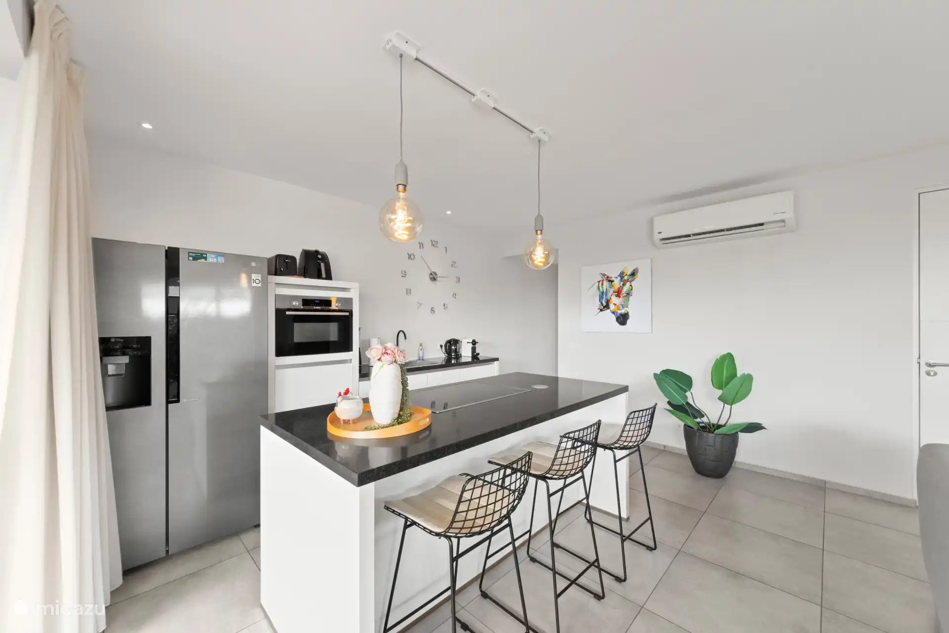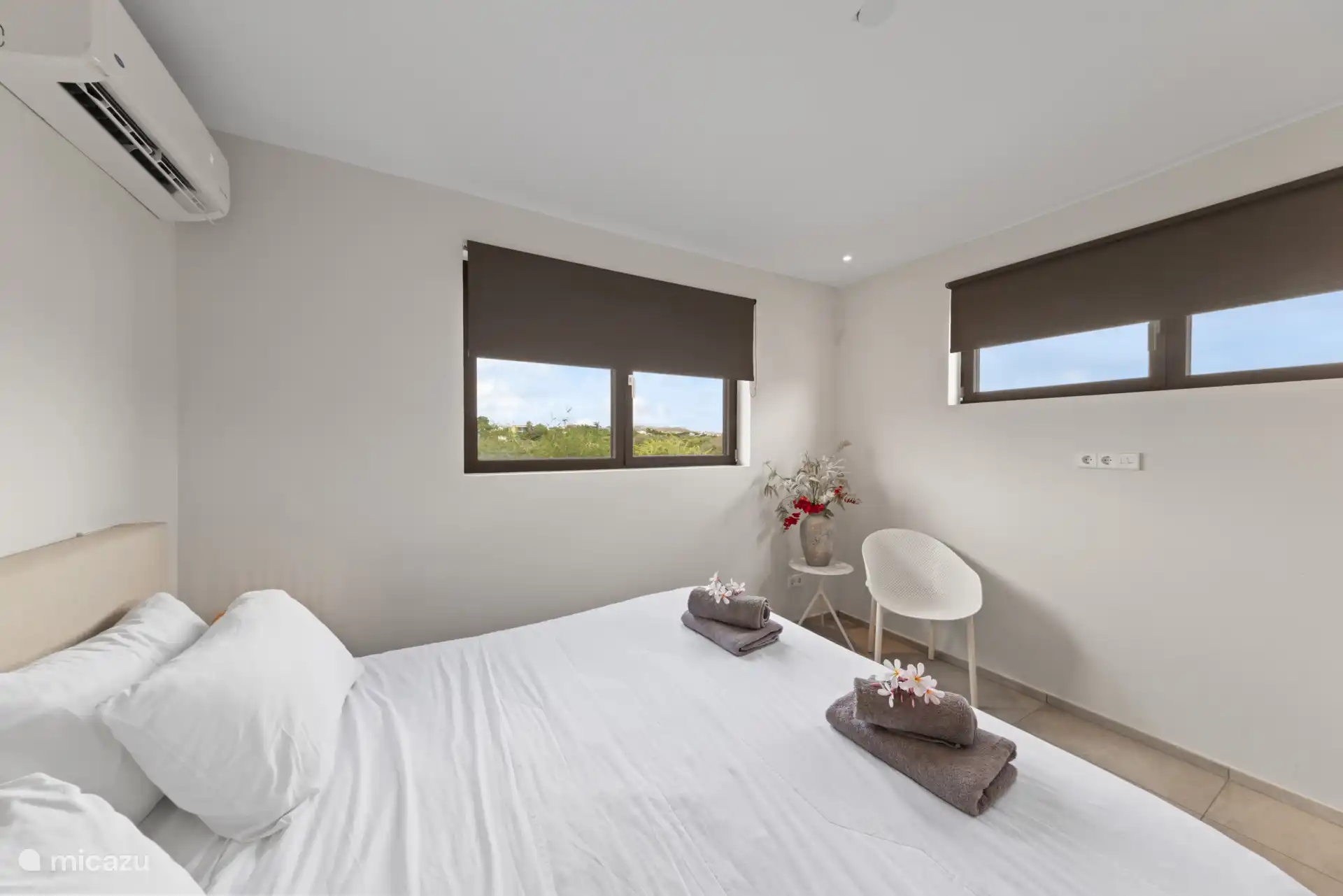 De woonkamer is ruim en licht, met comfortabele zithoek, airco, plafondventilator en een Sonos-geluidsinstallatie, zodat u zowel binnen als buiten van muziek kunt genieten. De open keuken is volledig uitgerust met moderne inbouwapparatuur. Elke slaapkamer beschikt over een televisie en airco, en de hele woning is voorzien van Philips Hue-verlichting, waarmee u eenvoudig de sfeer kunt aanpassen.