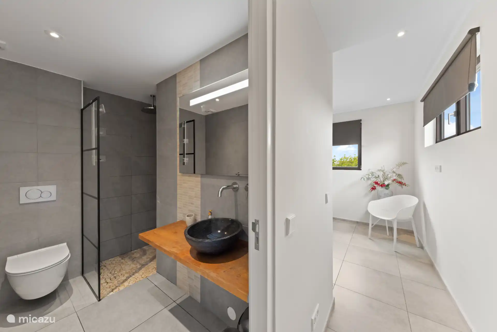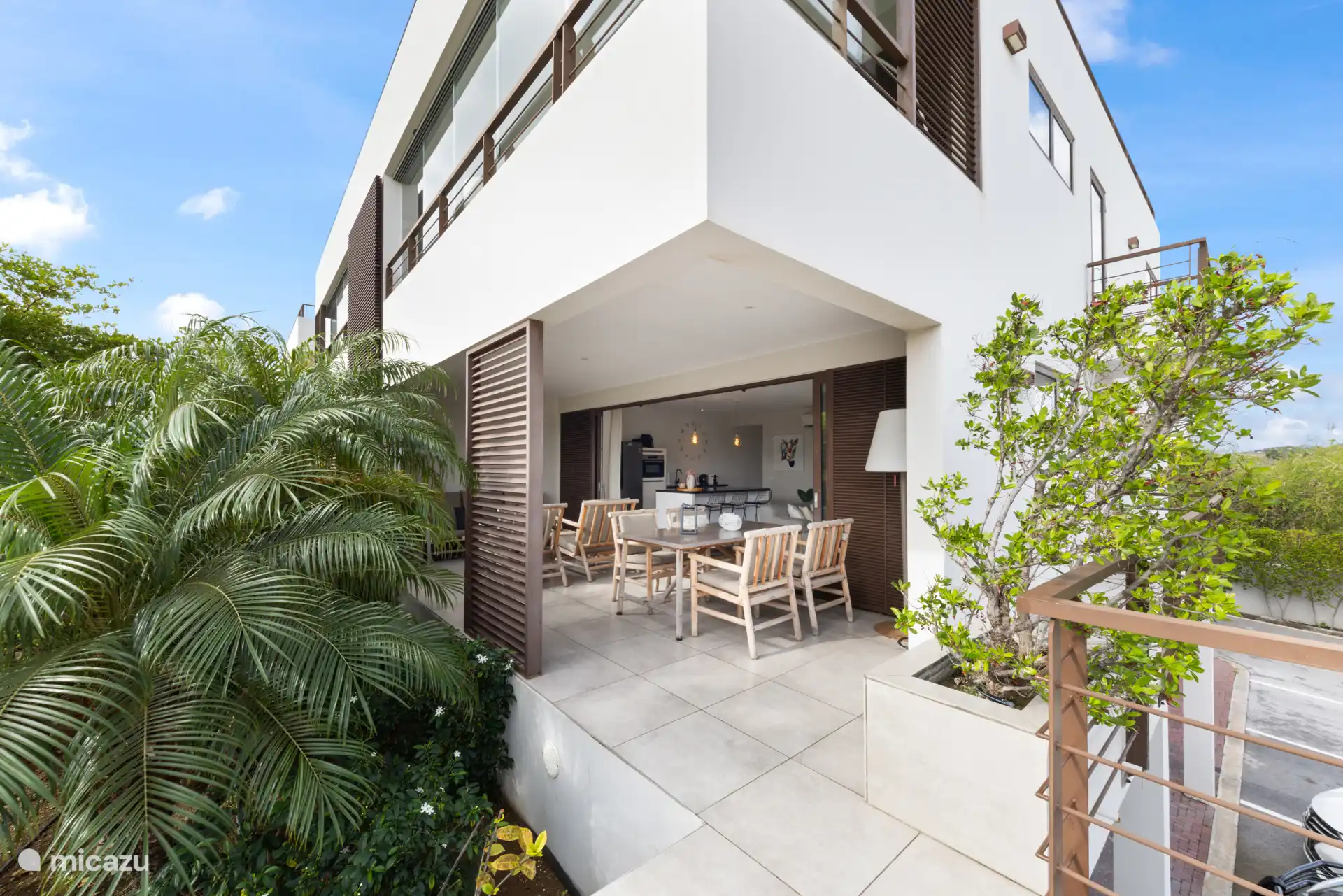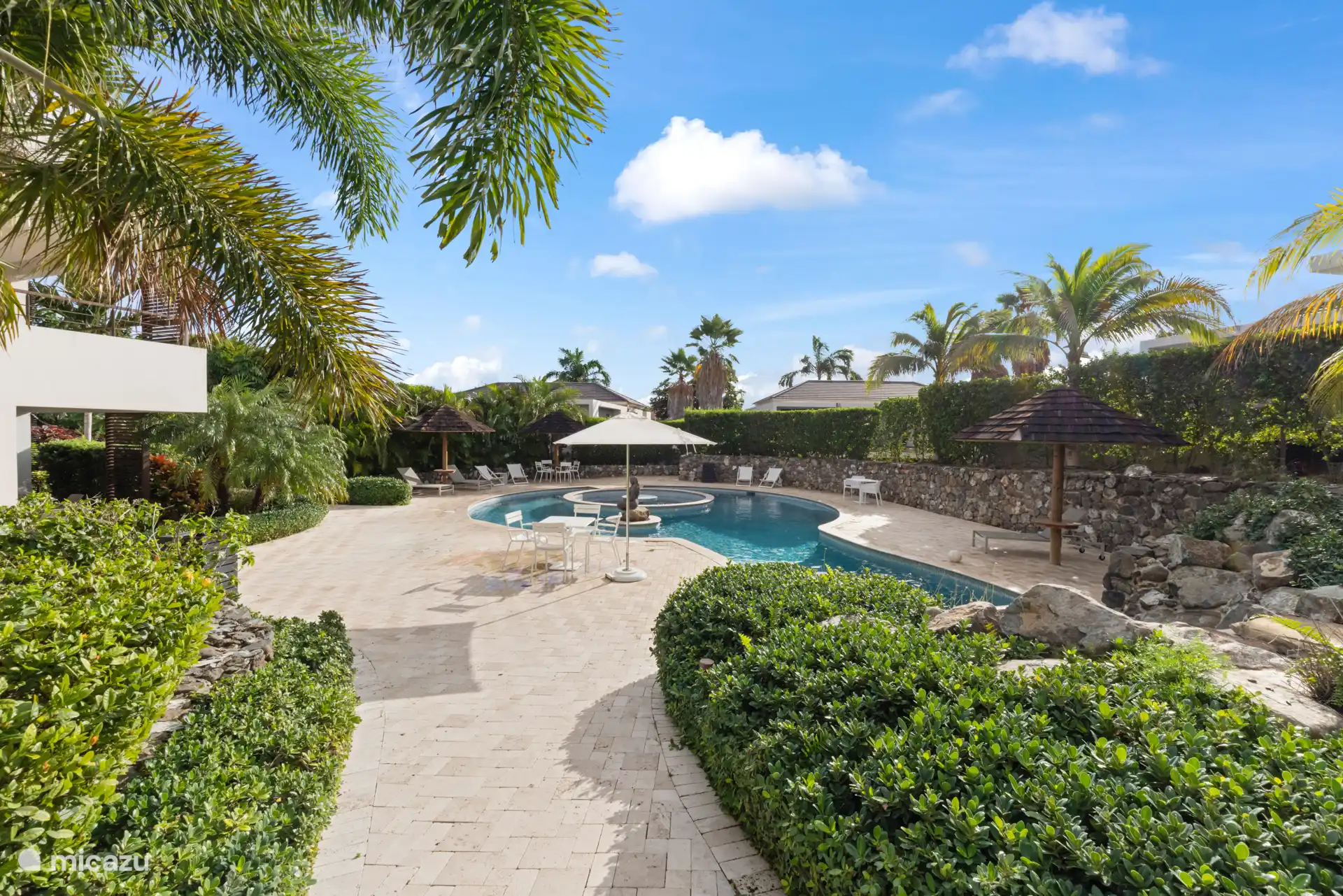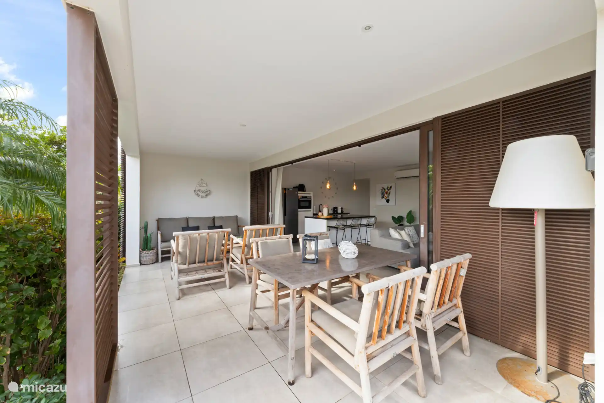 Buiten vindt u een ruime porch met grote eettafel. De tropische tuin beschikt over een privézwembad, een palapa met moderne loungeset en een tweede Sonos-installatie, ideaal om in de schaduw te ontspannen. Verder zijn er een buiten-bbq, buitendouche en apart buiten-toilet aanwezig. Achter de woning is een washok met wasmachine en droger, handig voor langer verblijf.