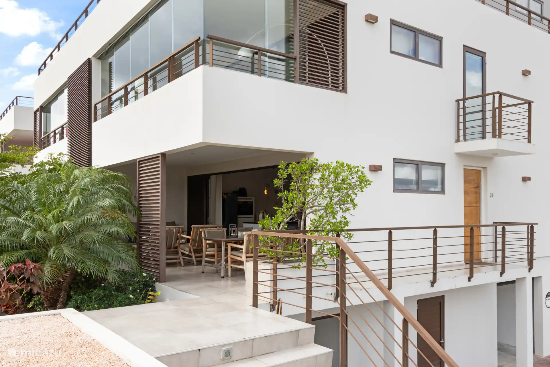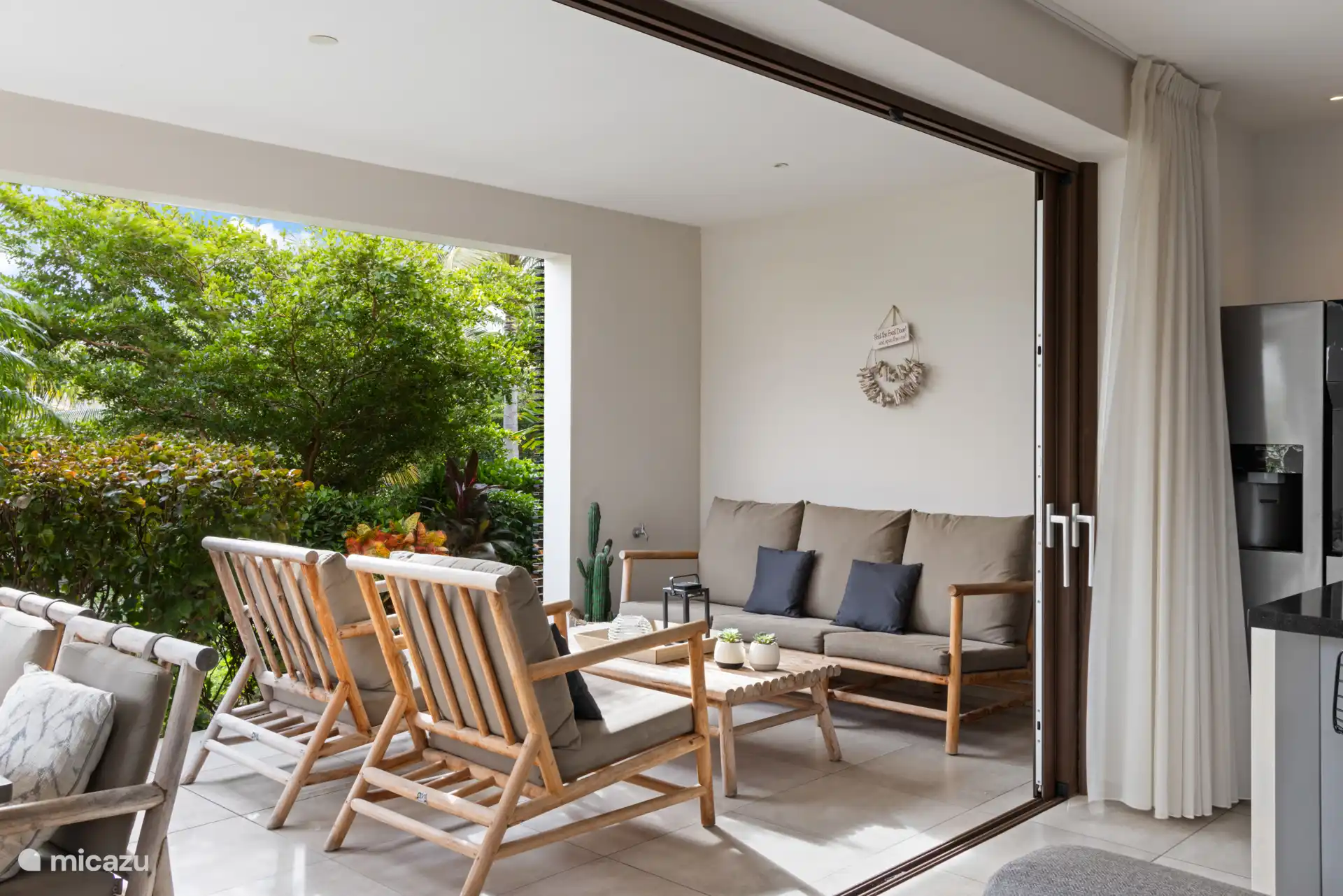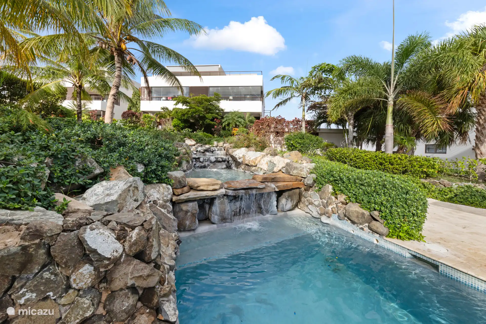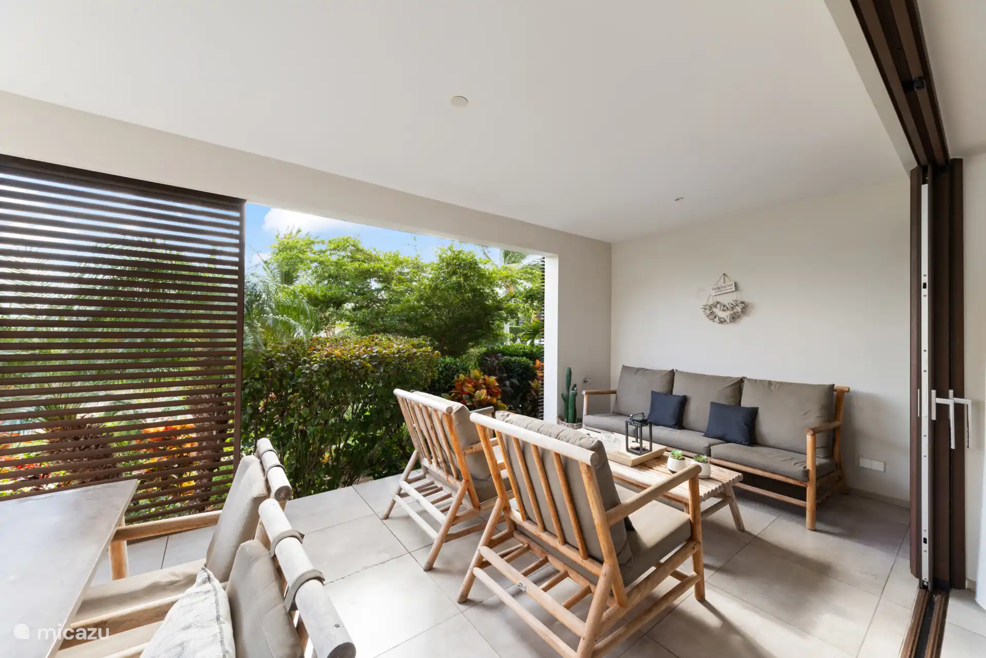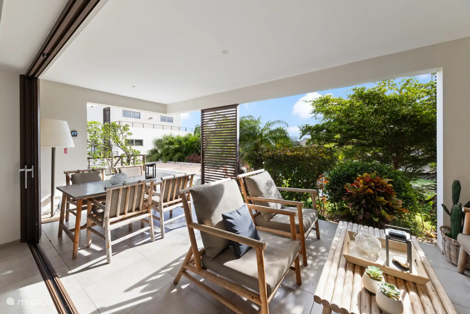 Buiten vindt u een ruime porch met grote eettafel. De tropische tuin beschikt over een privézwembad, een palapa met moderne loungeset en een tweede Sonos-installatie, ideaal om in de schaduw te ontspannen. Verder zijn er een buiten-bbq, buitendouche en apart buiten-toilet aanwezig. Achter de woning is een washok met wasmachine en droger, handig voor langer verblijf.