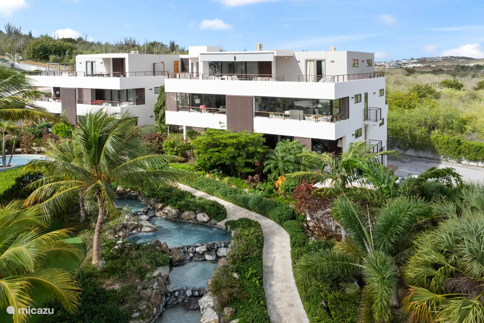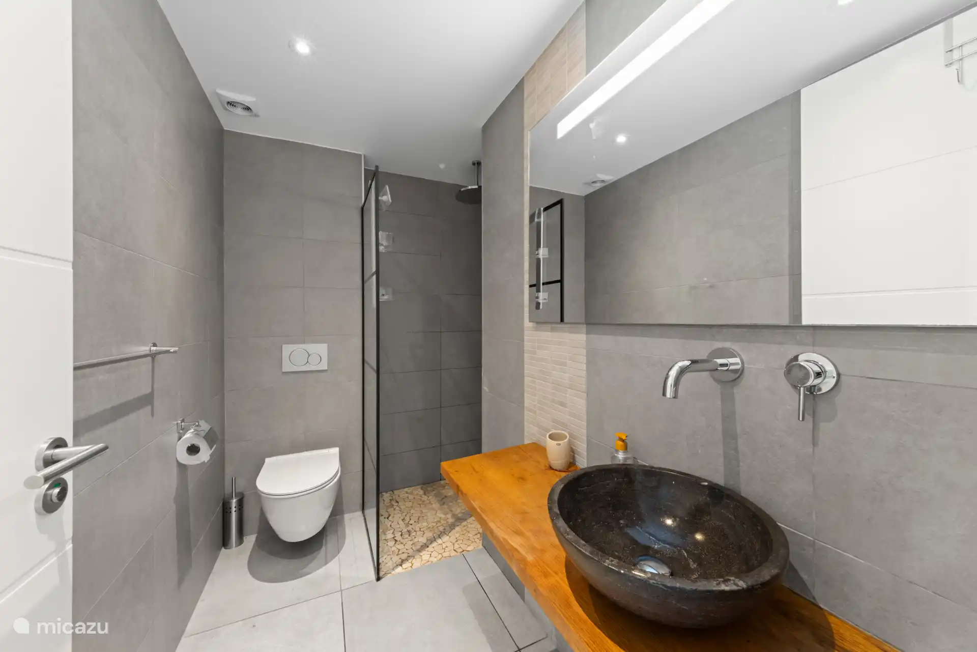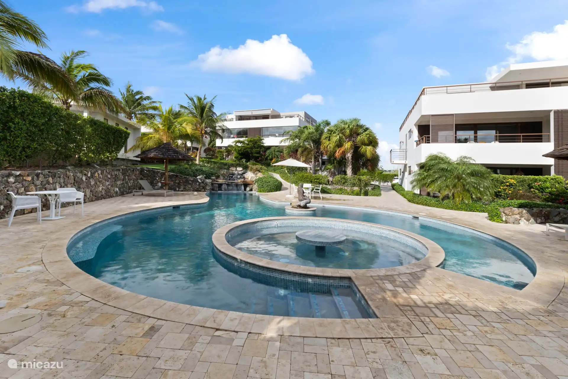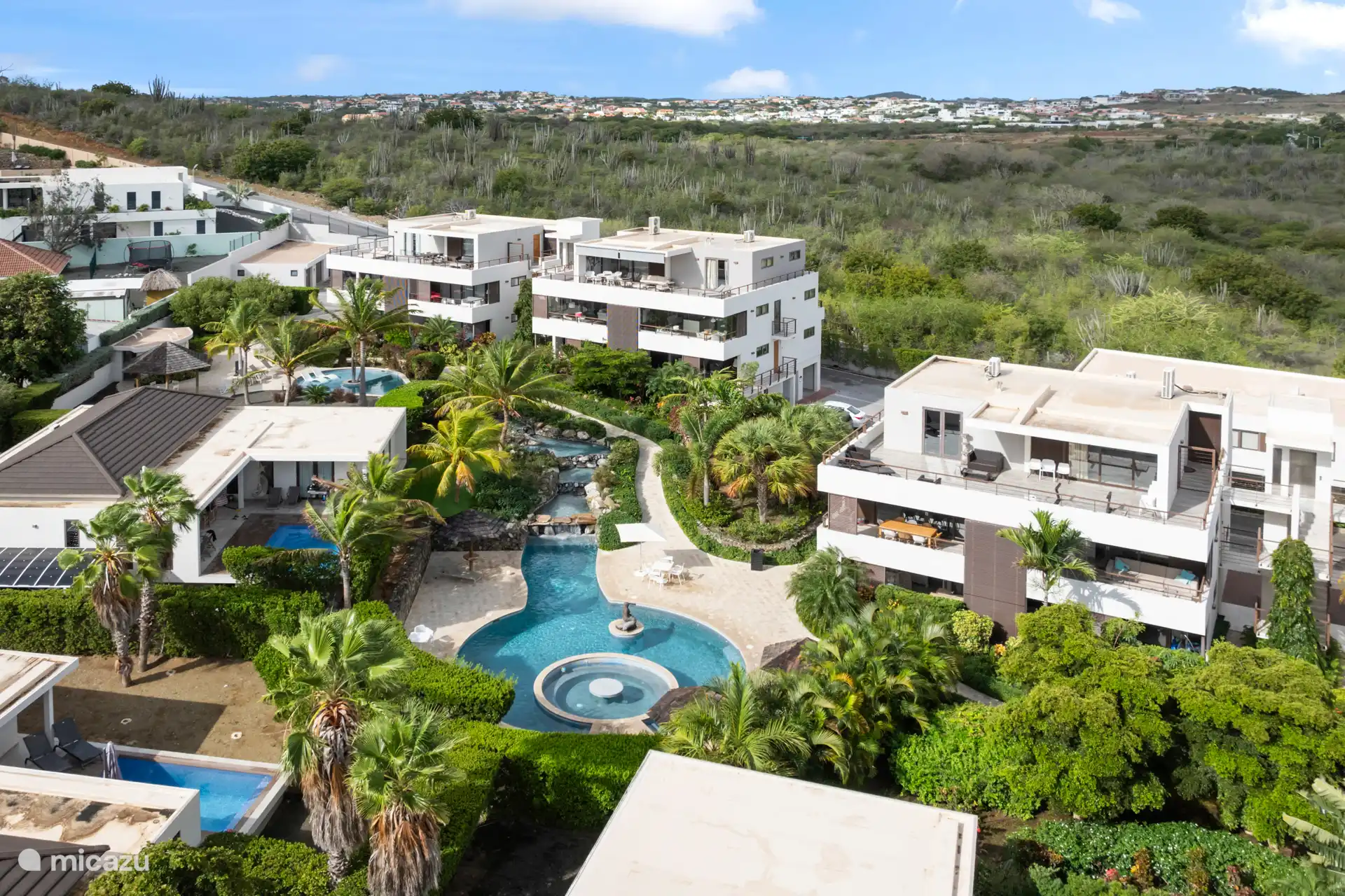 Buiten vindt u een ruime porch met grote eettafel. De tropische tuin beschikt over een privézwembad, een palapa met moderne loungeset en een tweede Sonos-installatie, ideaal om in de schaduw te ontspannen. Verder zijn er een buiten-bbq, buitendouche en apart buiten-toilet aanwezig. Achter de woning is een washok met wasmachine en droger, handig voor langer verblijf.