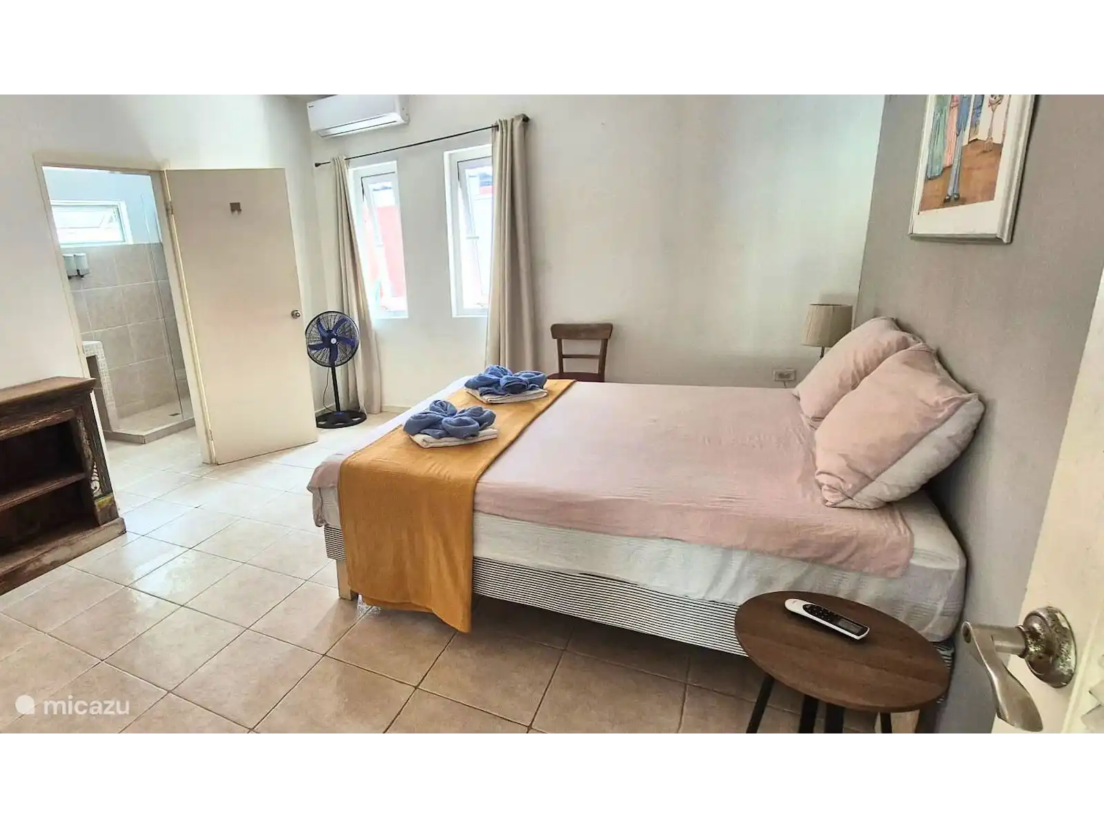 In de ruime slaapkamer staat een 2-persoons bed van 160x210 met beddengoed, een ventilator en hangt er uiteraard een airco.
