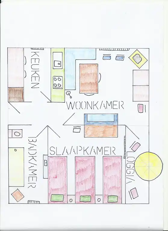 Het appartement beschikt over woon-/slaapkamer, één slaapkamer, aparte keuken en badkamer. De woon-/slaapkamer heeft een eetkamertafel, slaapbank en 2 opklapbare bedden en twee luxe stoelen, verder tv met satellietaansluiting, dvd-speler en radio alsmede wifi-internet. De slaapkamer heeft drie eenpersoonsbedden en genoeg kastruimte. De aparte keuken beschikt over keramische kookplaat met oven, magnetron, koffiezetmachine, broodrooster, waterkoker,senseo en een koelkast met vriesgedeelte. De badkamer is ingericht met inloopdouche, wastafel en toilet. Huisdieren zijn welkom en gratis.