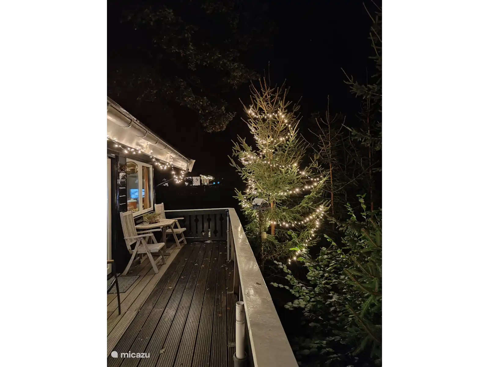 Vanuit de woonkamer gaat u via de terrasdeuren richting het balkon op het zuiden, voorzien van een tuin set en parasol. Op dit terras is het optimaal genieten van de zon overdag, en de sterrenhemel ‘s avonds. Ook de bijbehorende huisvleermuis zal in de zomermaanden tegen de schemering van de partij zijn en om de boom voor het chalet vliegen.