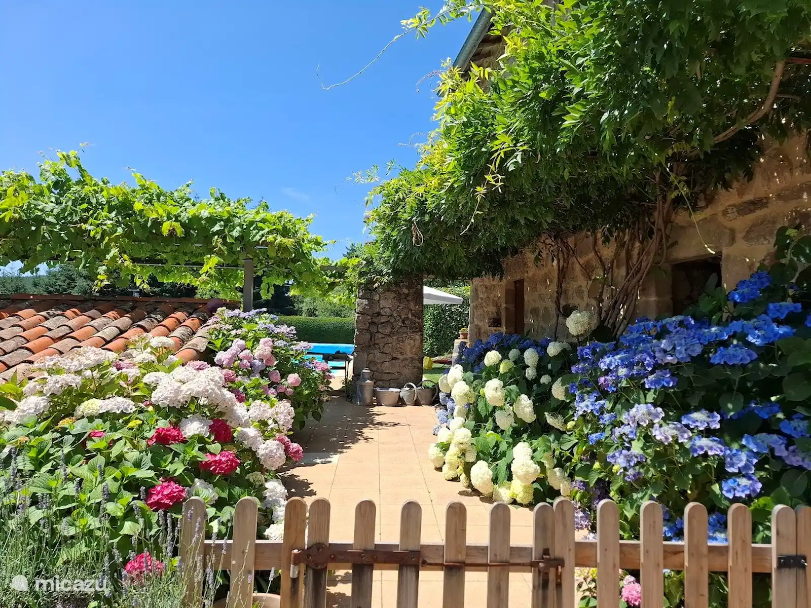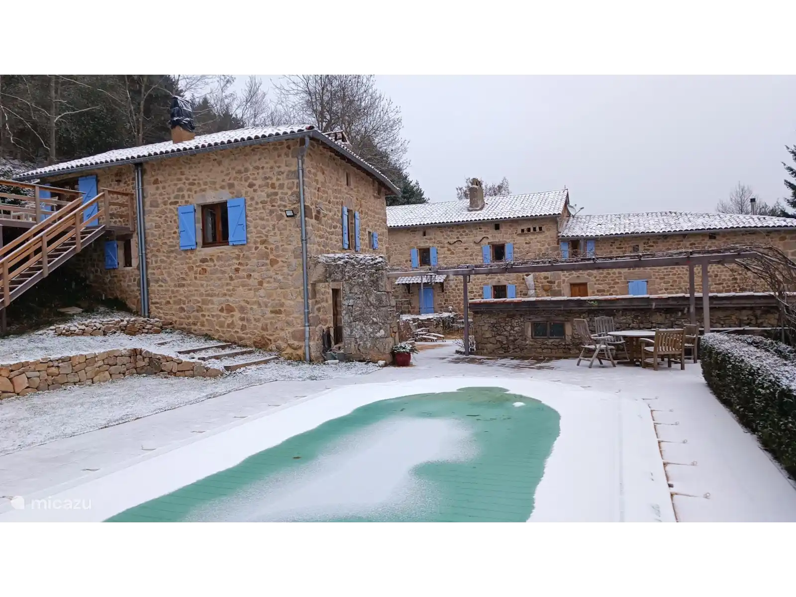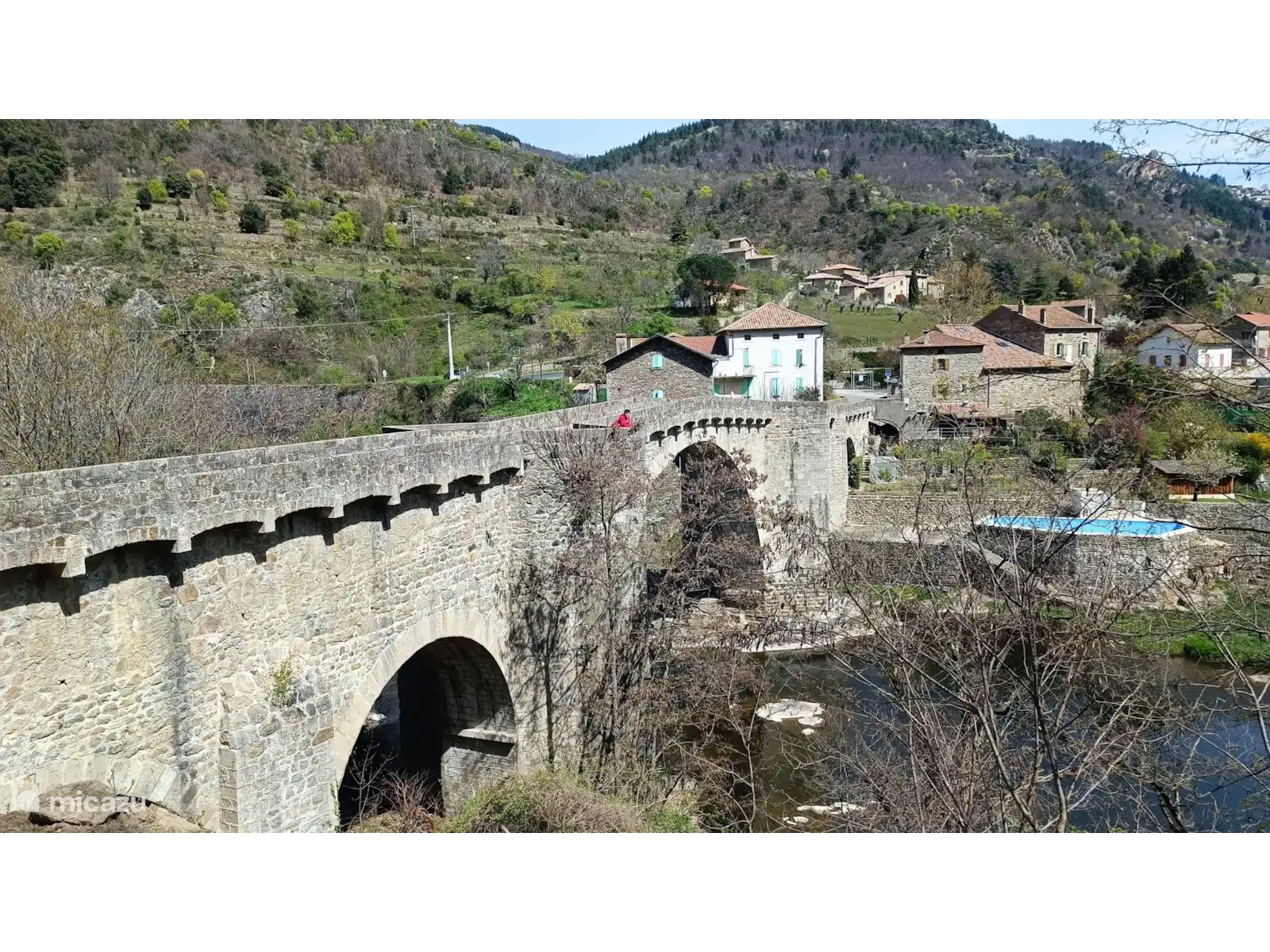 De gite is gelegen in de Noordelijke Ardeche en is heel geschikt voor gezinnen of vrienden. Het huis is gelegen aan een rustig weggetje in een prachtige bosrijke omgeving op 750 m. hoogte. Behalve het zwevende houten terras heeft u ook de beschikking over de terrassen rond het zwembad. Er zijn diverse ligbedden en teakhouten deckchairs onder de met druiven begroeide pergola.