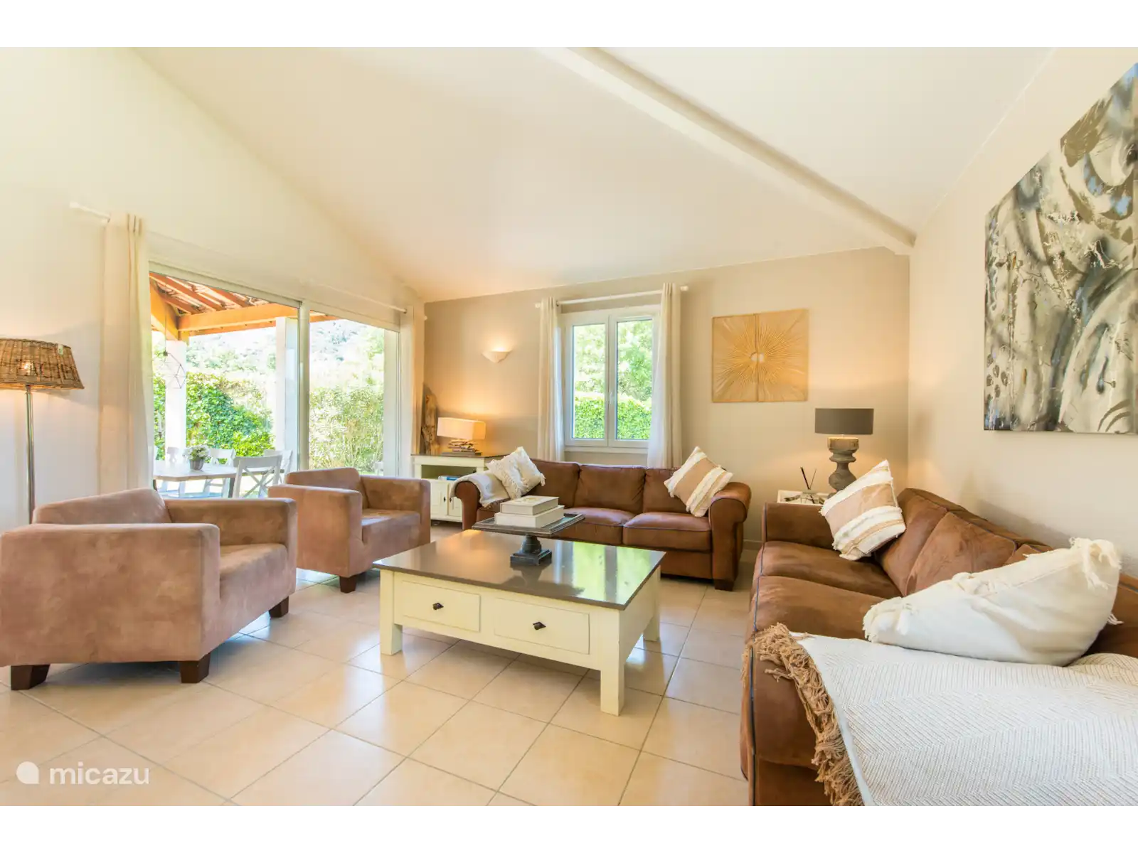Begane grond: de ruime villa heeft een zithoek met 2 banken en twee fauteuils, televisie en open haard. Vanuit de woonkamer kunt u via de dubbele schuifpui naar het overdekte terras. De eethoek met tafel en 10 stoelen grenst aan de keuken. De open keuken is voorzien van vaatwasser, oven, magnetron, koffiezetapparaat en waterkoker. Op de begane grond vindt u ook twee slaapkamers voor twee personen met airconditioning en een badkamer.Eerste verdieping: 3 slaapkamers voor twee personen met airconditioning en een badkamer.