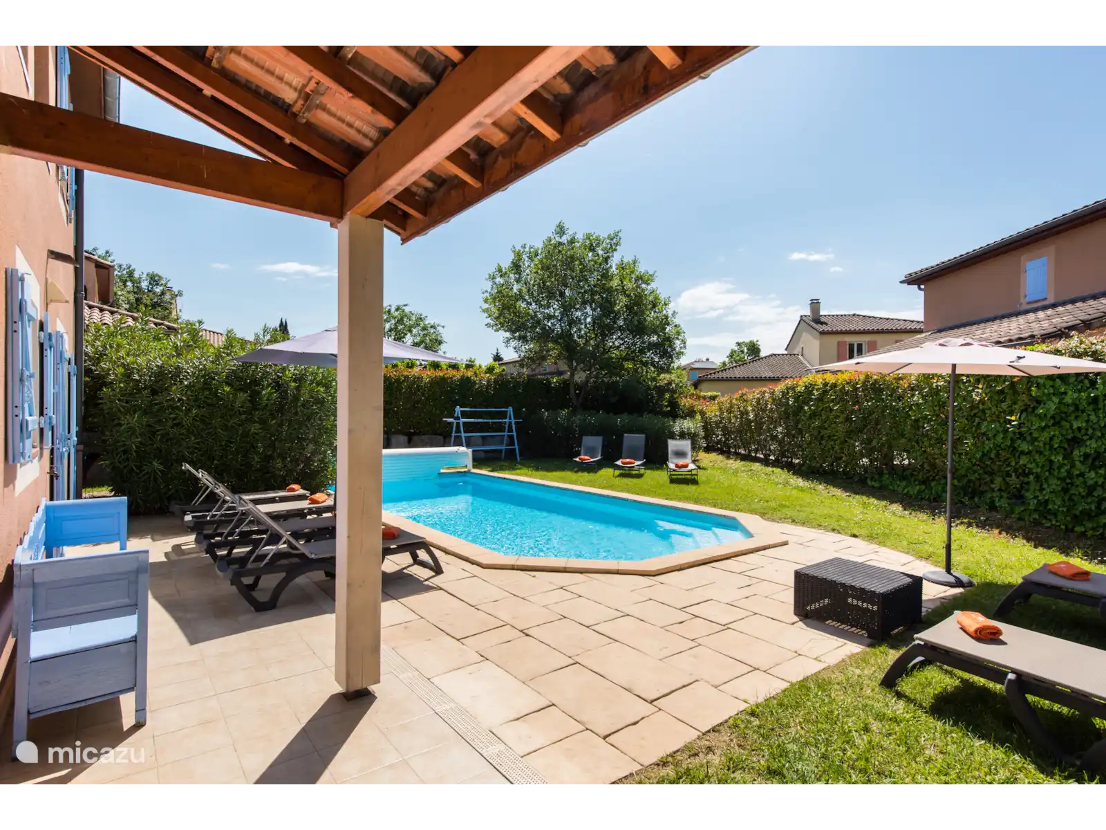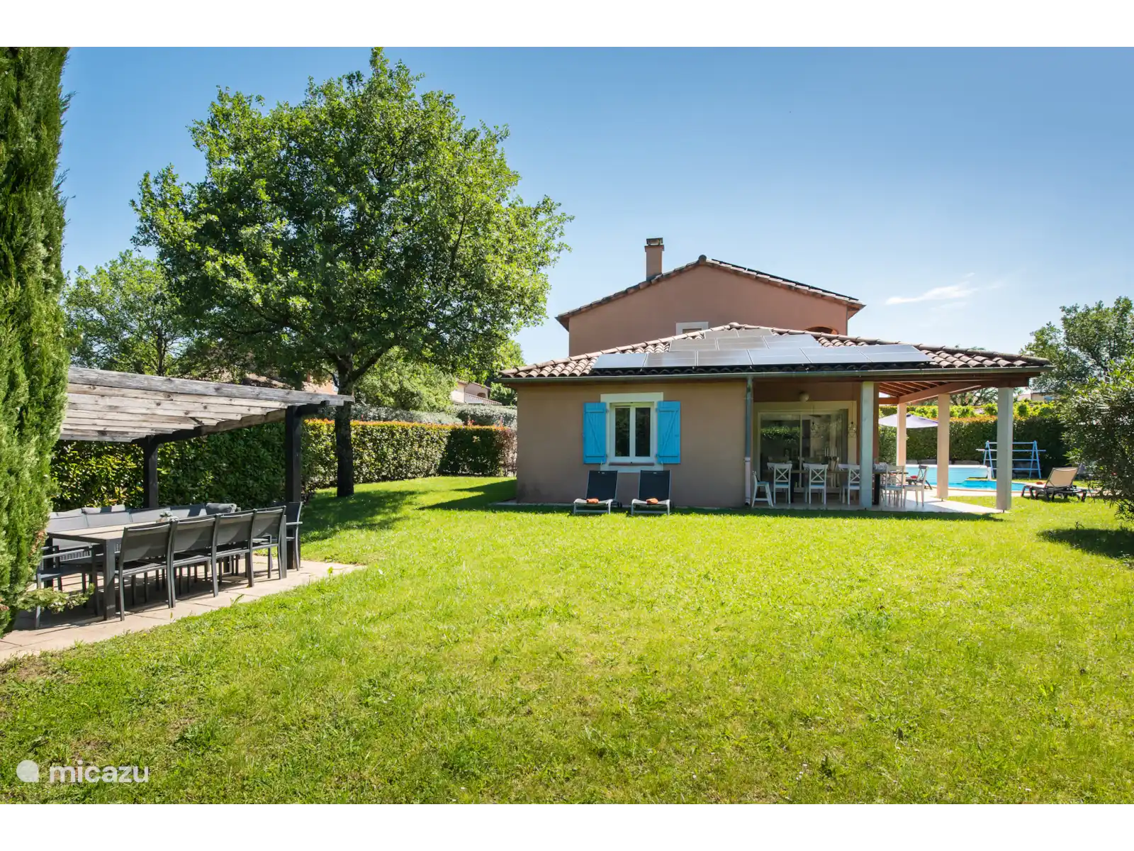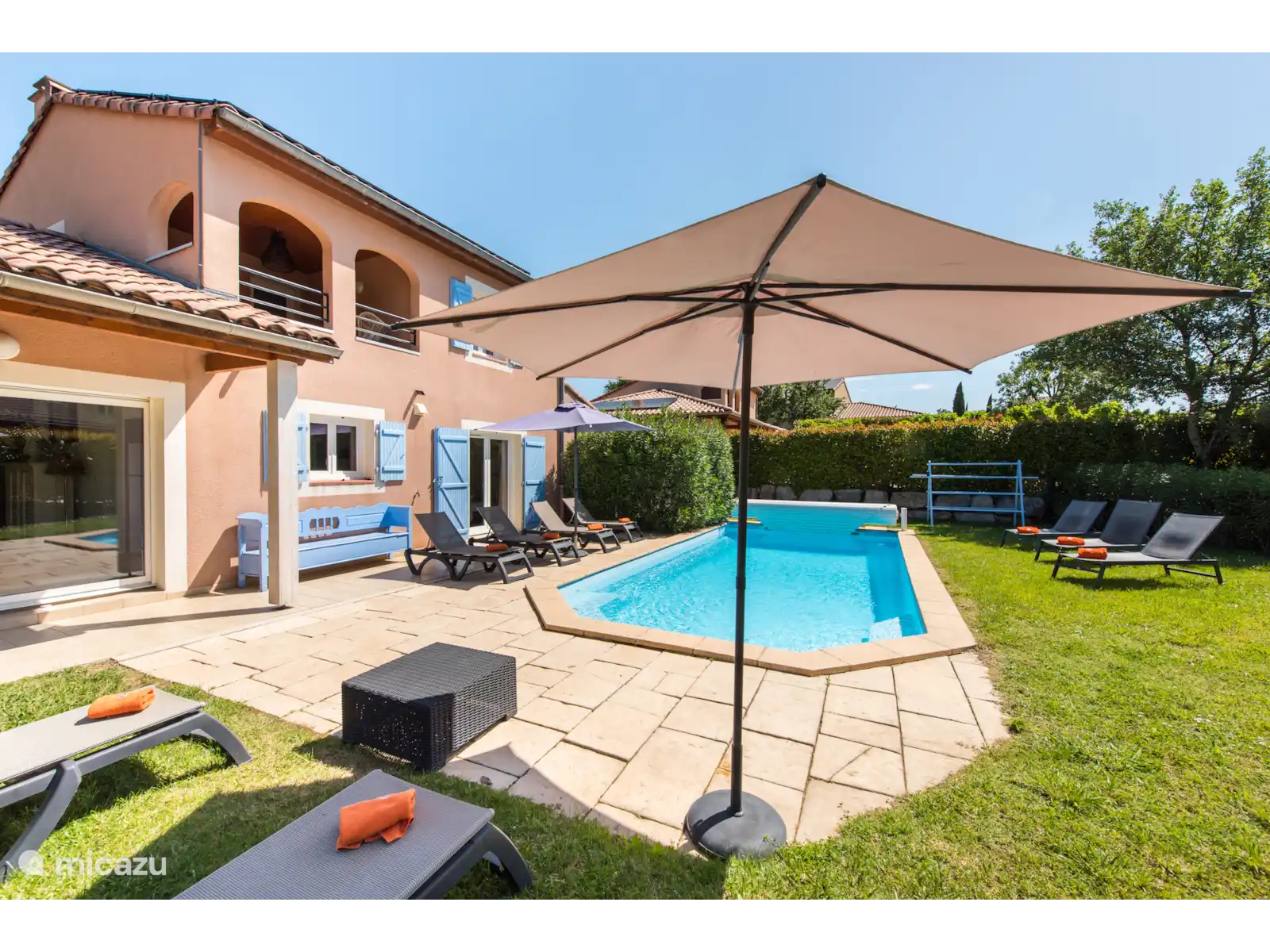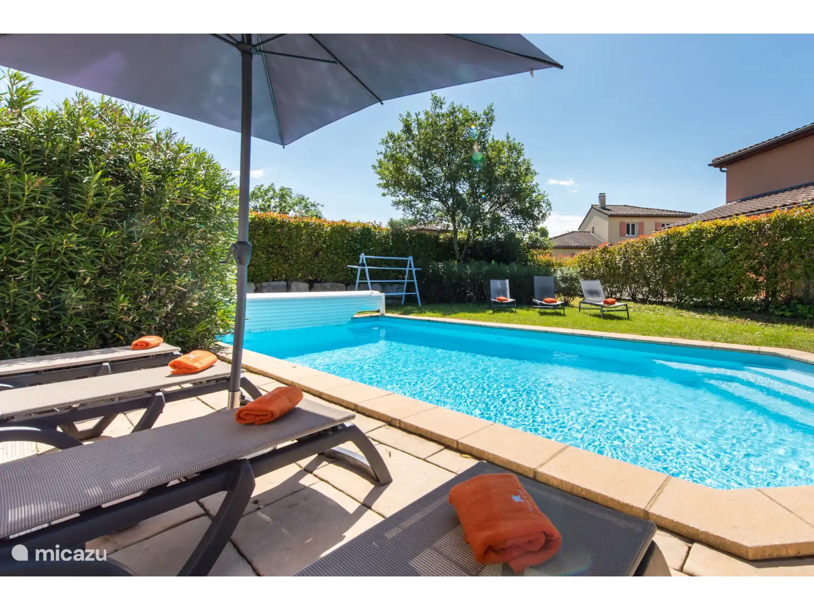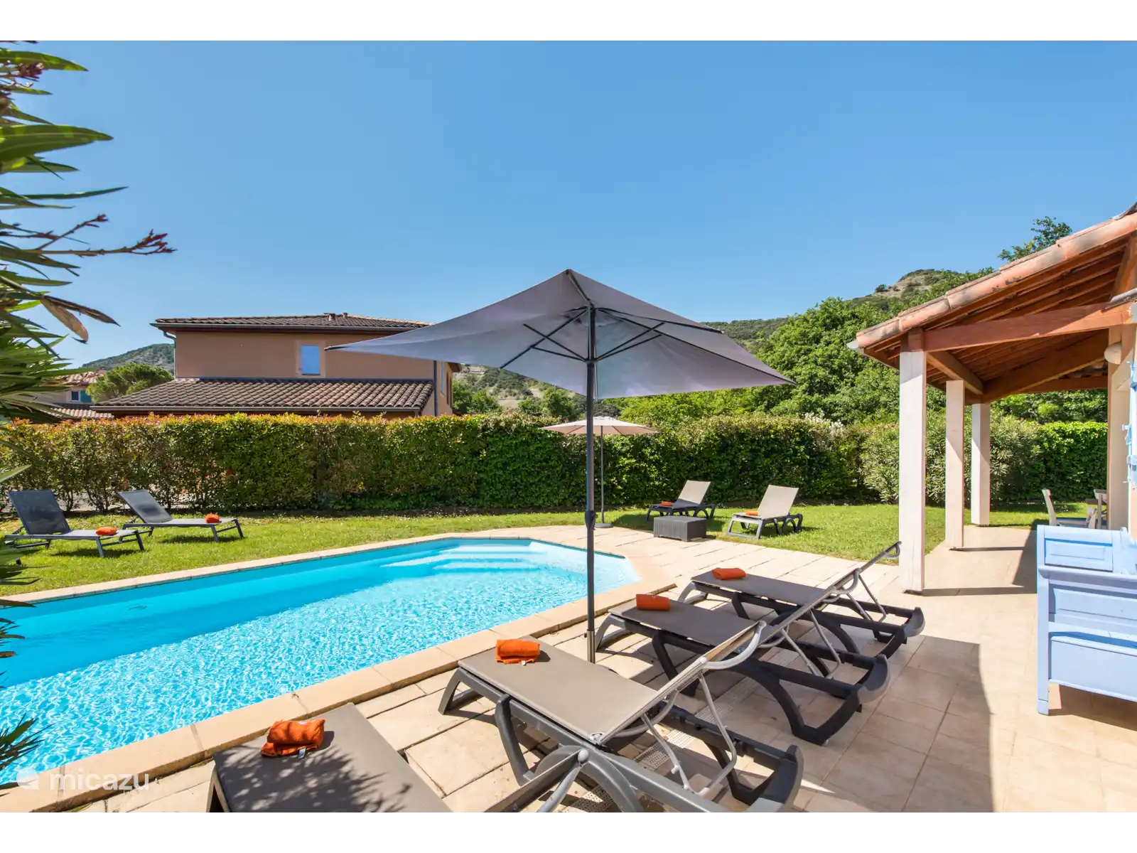 Buiten: Groot gazon met verwarmbaar privézwembad van 10 x 4 m. De zwembadverwarming kan bijgeboekt worden (extra kosten) en het zwembad is open van april tot en met oktober. Het overdekte terras is ideaal om buiten te kunnen eten of te genieten van een goed glas Franse wijn. In de tuin is een extra zitje gemaakt voor een extra schaduwplek.Er is parkeerruimte op eigen terrein en u kunt gebruik maken van de nieuw geïnstalleerde laadpaal (extra kosten).