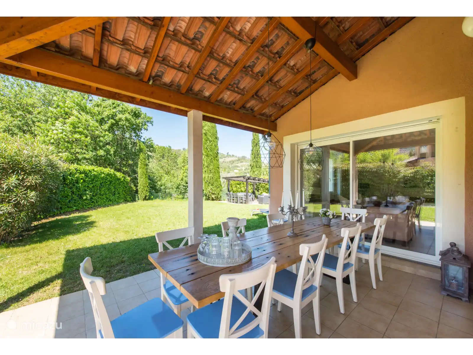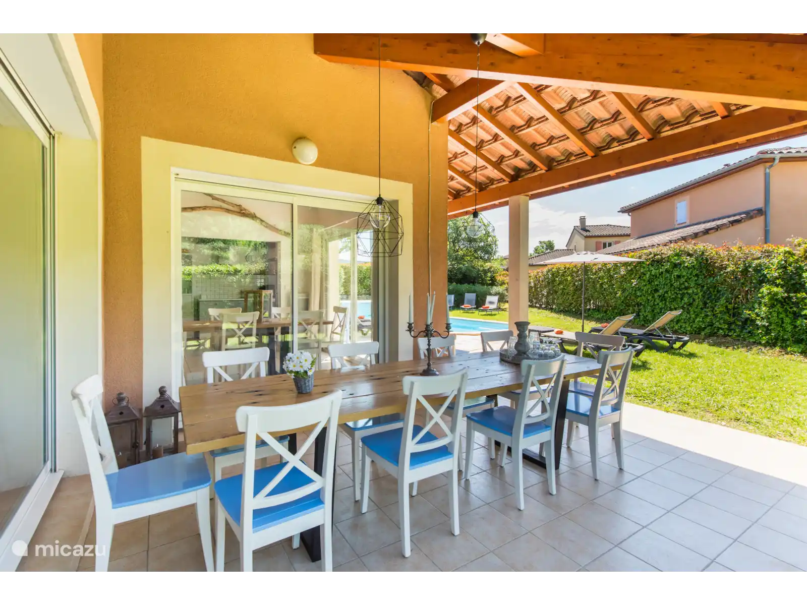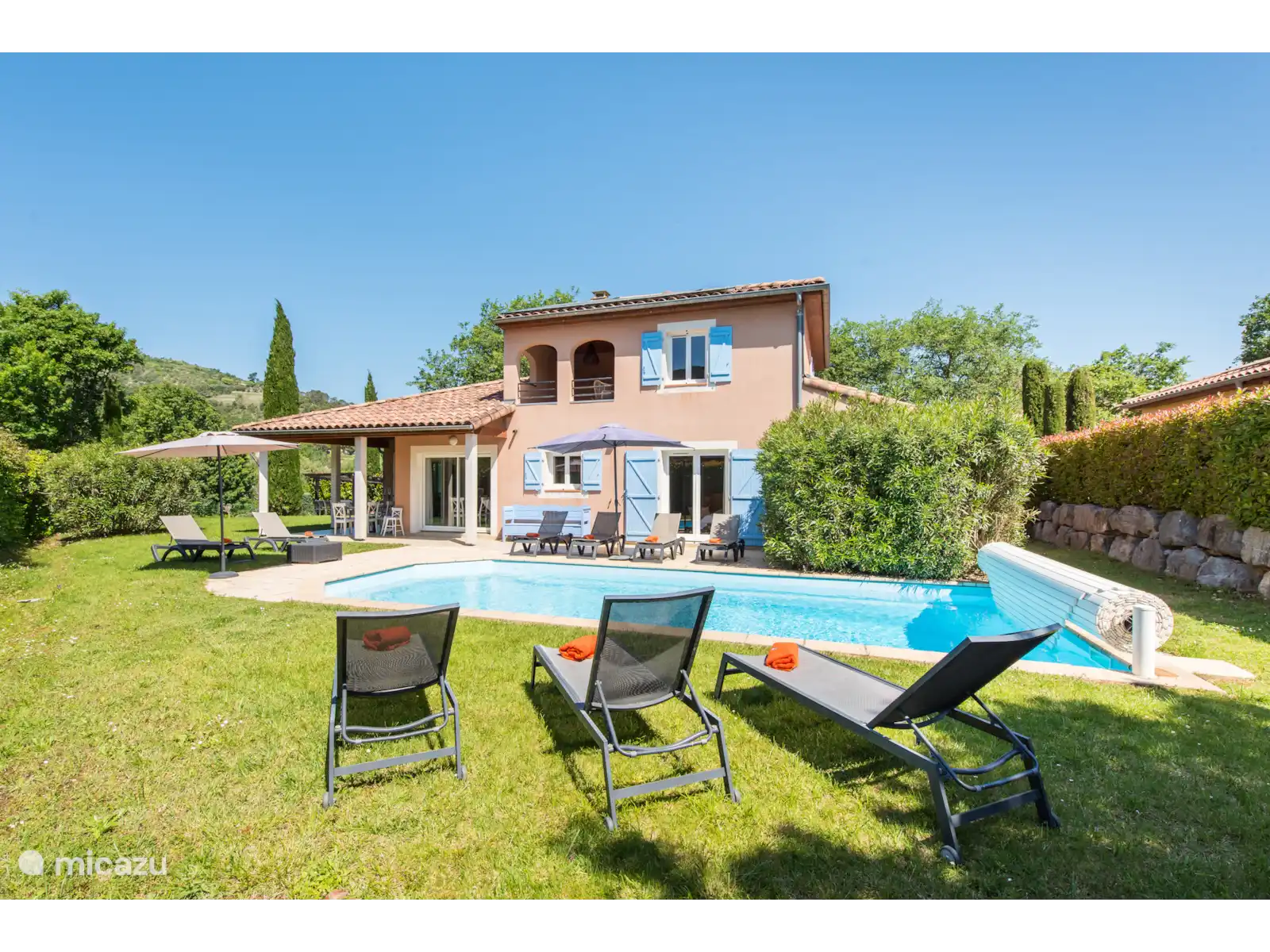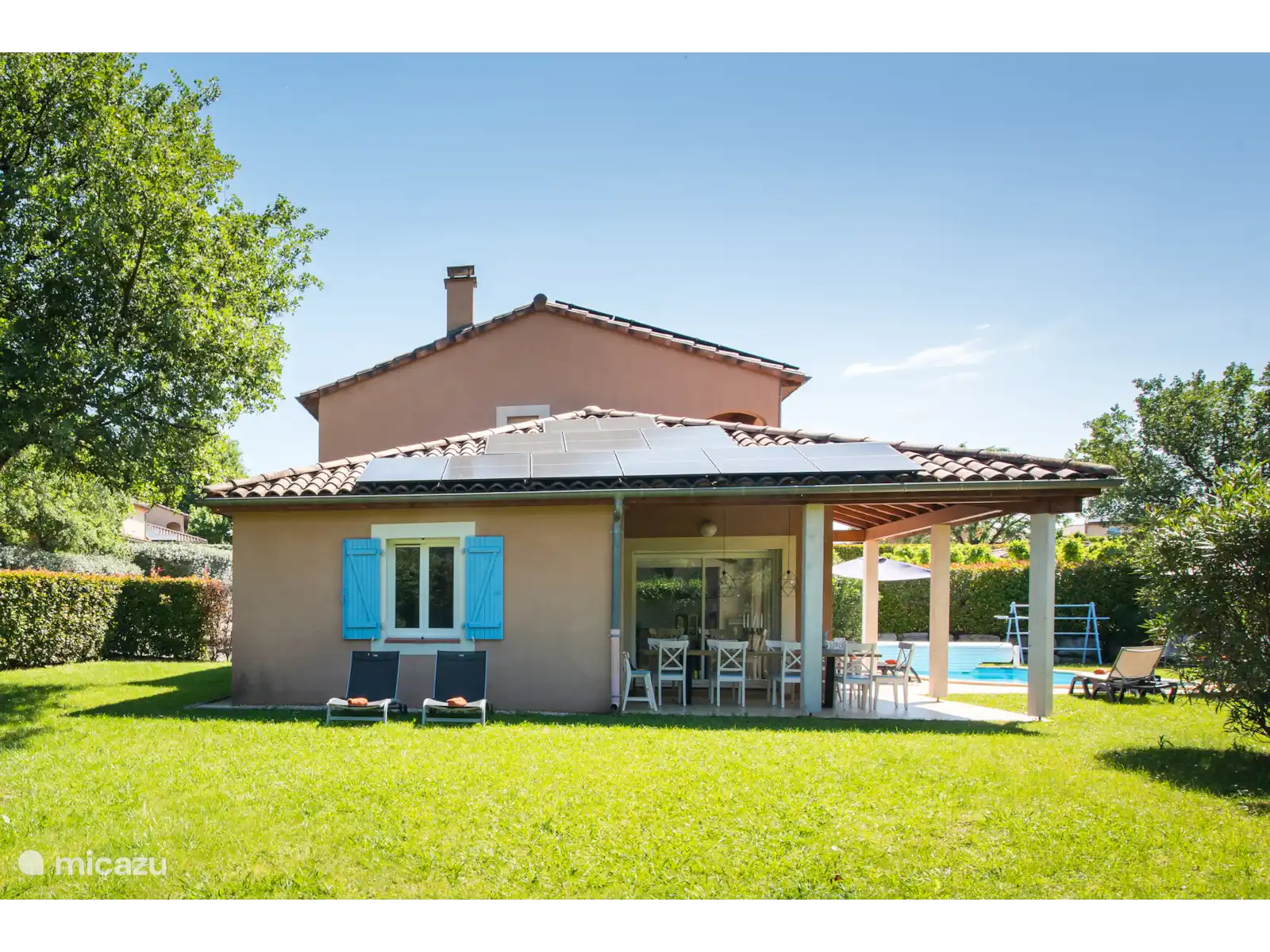 Buiten: Groot gazon met verwarmbaar privézwembad van 10 x 4 m. De zwembadverwarming kan bijgeboekt worden (extra kosten) en het zwembad is open van april tot en met oktober. Het overdekte terras is ideaal om buiten te kunnen eten of te genieten van een goed glas Franse wijn. In de tuin is een extra zitje gemaakt voor een extra schaduwplek.Er is parkeerruimte op eigen terrein en u kunt gebruik maken van de nieuw geïnstalleerde laadpaal (extra kosten).
