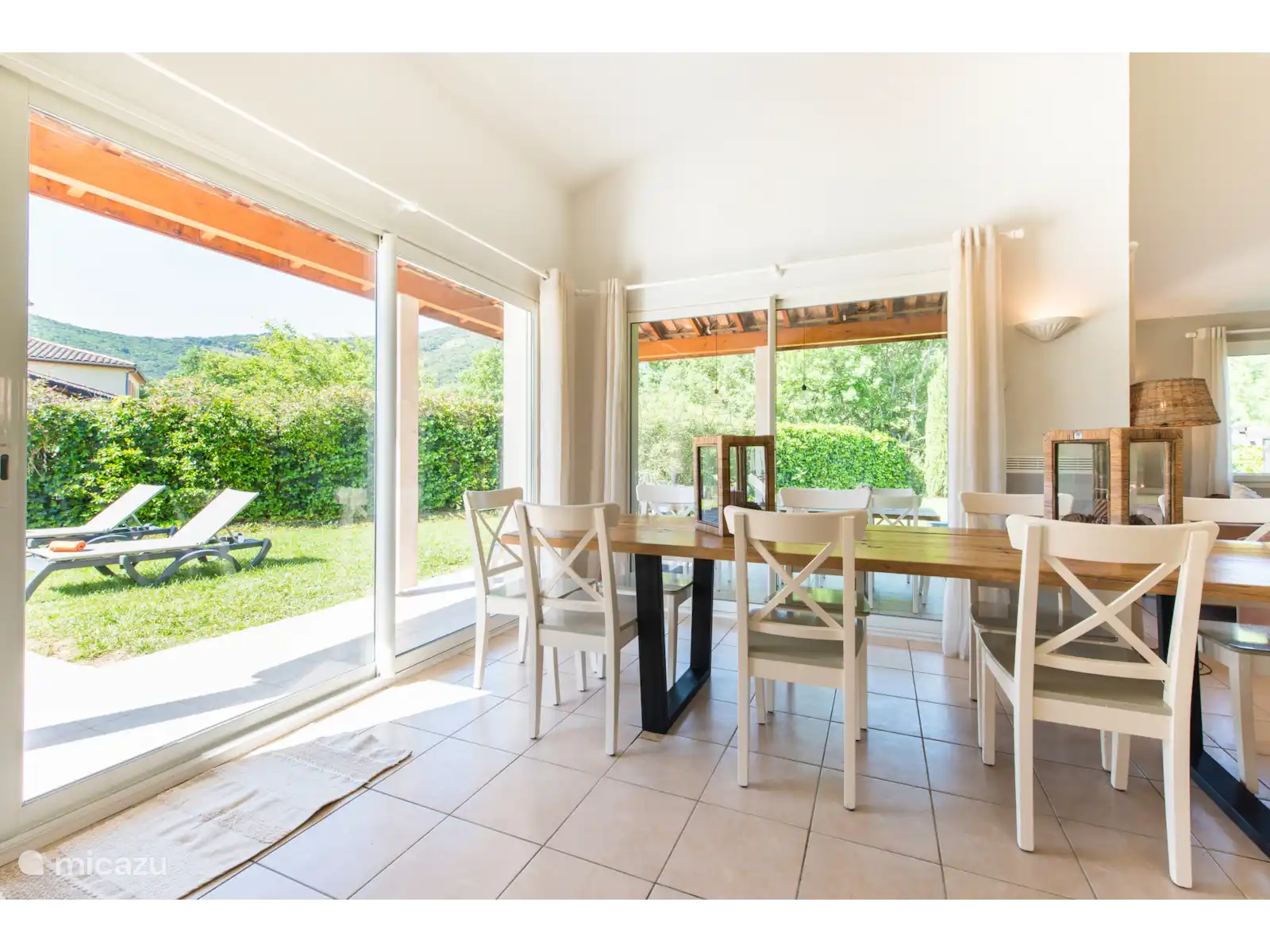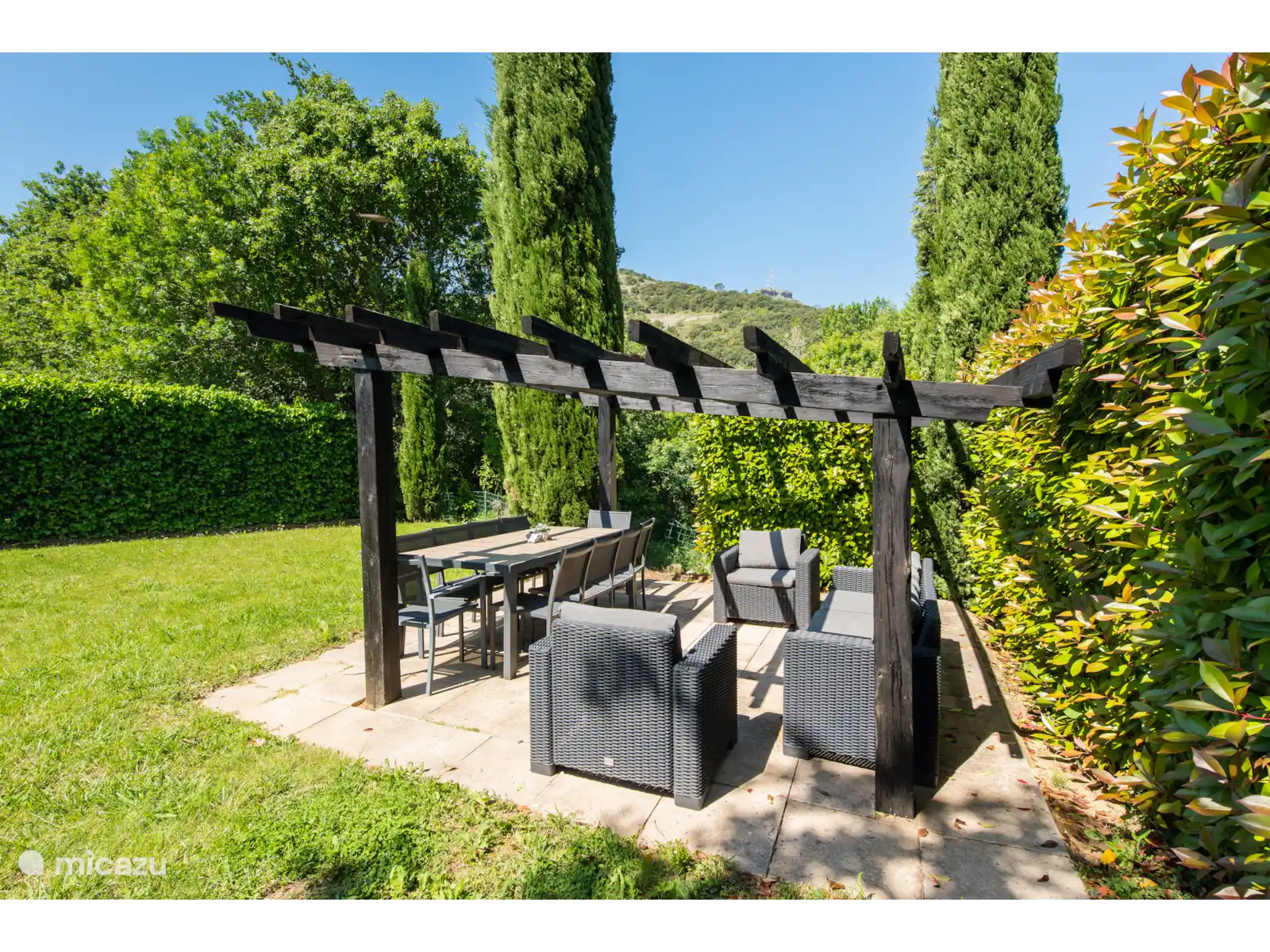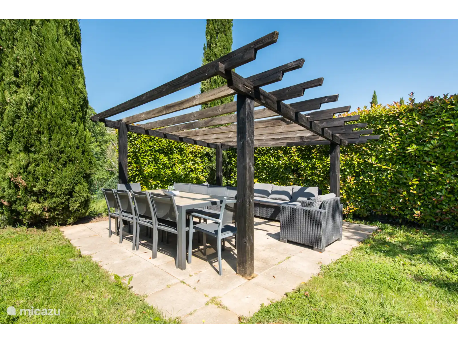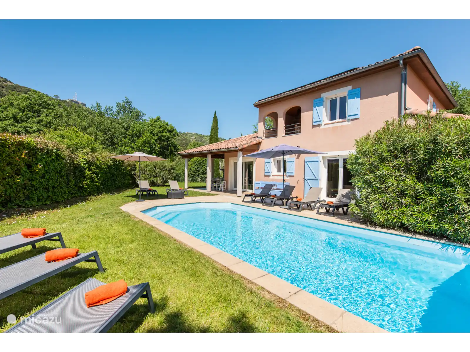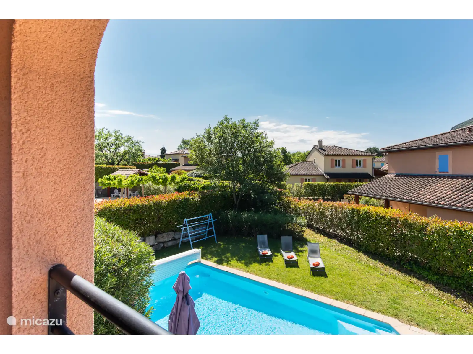 Buiten: Groot gazon met verwarmbaar privézwembad van 10 x 4 m. De zwembadverwarming kan bijgeboekt worden (extra kosten) en het zwembad is open van april tot en met oktober. Het overdekte terras is ideaal om buiten te kunnen eten of te genieten van een goed glas Franse wijn. In de tuin is een extra zitje gemaakt voor een extra schaduwplek.Er is parkeerruimte op eigen terrein en u kunt gebruik maken van de nieuw geïnstalleerde laadpaal (extra kosten).
