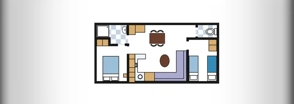 Het mobile home is uitgevoerd in zachte kleuren volledig ingericht en beschikt over twee slaapkamers.