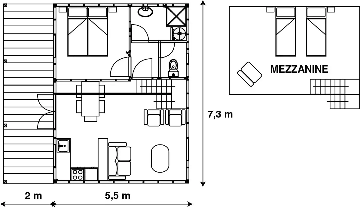 De verhuur van onze chalets is optimaal voor vier personen. Een slaapkamer op de begane grond bevat twee aparte bedden die naar wens een tweepersoonsbed kunnen worden. Boven biedt een mezzanine ook een tweepersoonsbed of twee eenpersoonsbedden.