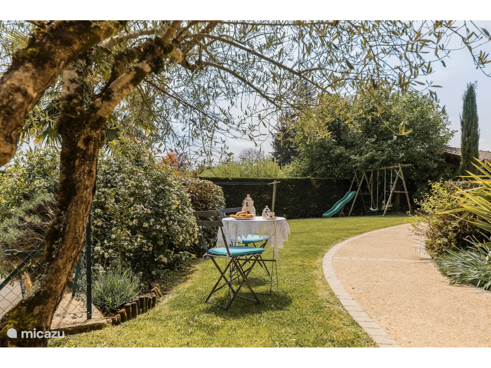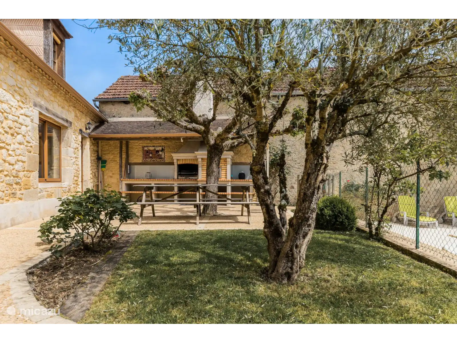 Een prachtig privé-zwembad van 9,5 x 4m met een romaanse trap, beveiligd en omheind. Een mooie volledig omheinde tuin van 1000m2 met lavendel en bloemen en een mooi terras. Een carport voor 2 auto’s . Een schommel en een glijbaan voor de kinderen. Er is een houtskool BBQ beschikbaar.