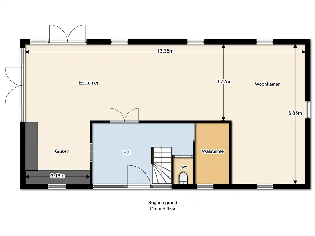 toilet en wasruimte/bijkeuken. De woonkamer is verdeeld in een eetgedeelte (mooie open keuken met vide) aan de achterzijde, een lekkere zitkamer en televisiehoek aan de voorzijde.