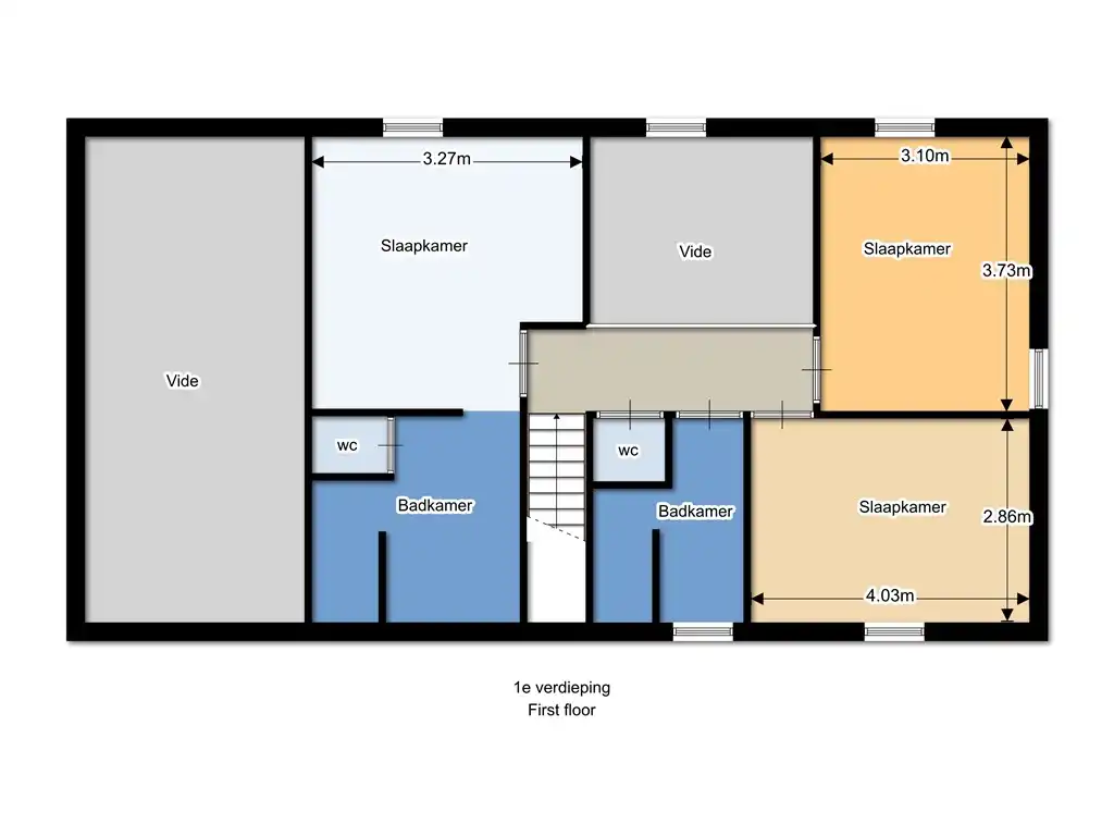 De verdieping is verdeeld in 3 slaapkamers, 2 badkamers en 2 toiletten. Alles ruim geschikt voor 6 personen.