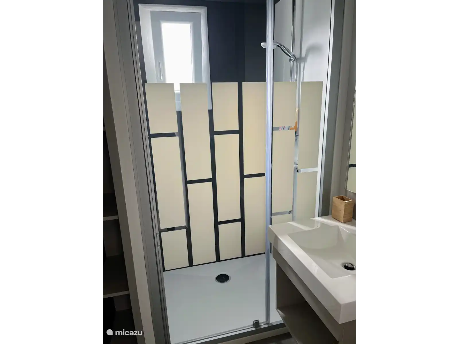 Binnen vind je een woongedeelte met een eettafel en stoelen, een comfortabele bank en een televisie met een Chromecast. Direct naast het woongedeelte is een geheel van alle gemakken voorziene open keuken met een afwasmachine, magnetron, oven, keramische kookplaten, waterkoker, koffiezetapparaat en ingebouwde koelkast en vriezer. Daarnaast hebben we nog twee kamers, één met een groot bed (160x200) en kastruimte en een tweede kamer met twee bedden (90x200) en eveneens kastruimte. In de badkamer vind je een wastafel, een grote douche en handdoek-radiator en opbergruimte. De wc is apart van de badkamer.