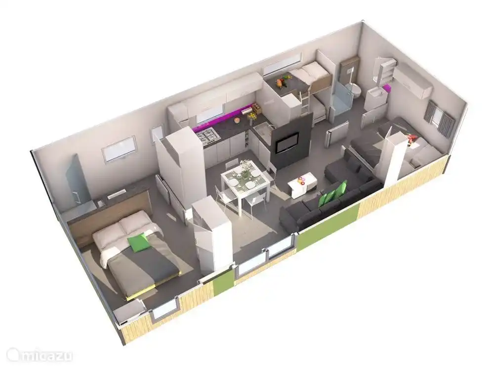 Ons chalet is volledig ingericht en het is voorzien van alle denkbare luxe en comfort. Het chalet beschikt over een ruime woonkamer / keuken met airconditioning, vaatwasmachine, Nespresso koffiemachine, waterkoker, magnetron/grill en satelliet TV met Nederlandse zenders. Alle ramen zijn voorzien van horren en luxe verduisterende gordijnen.