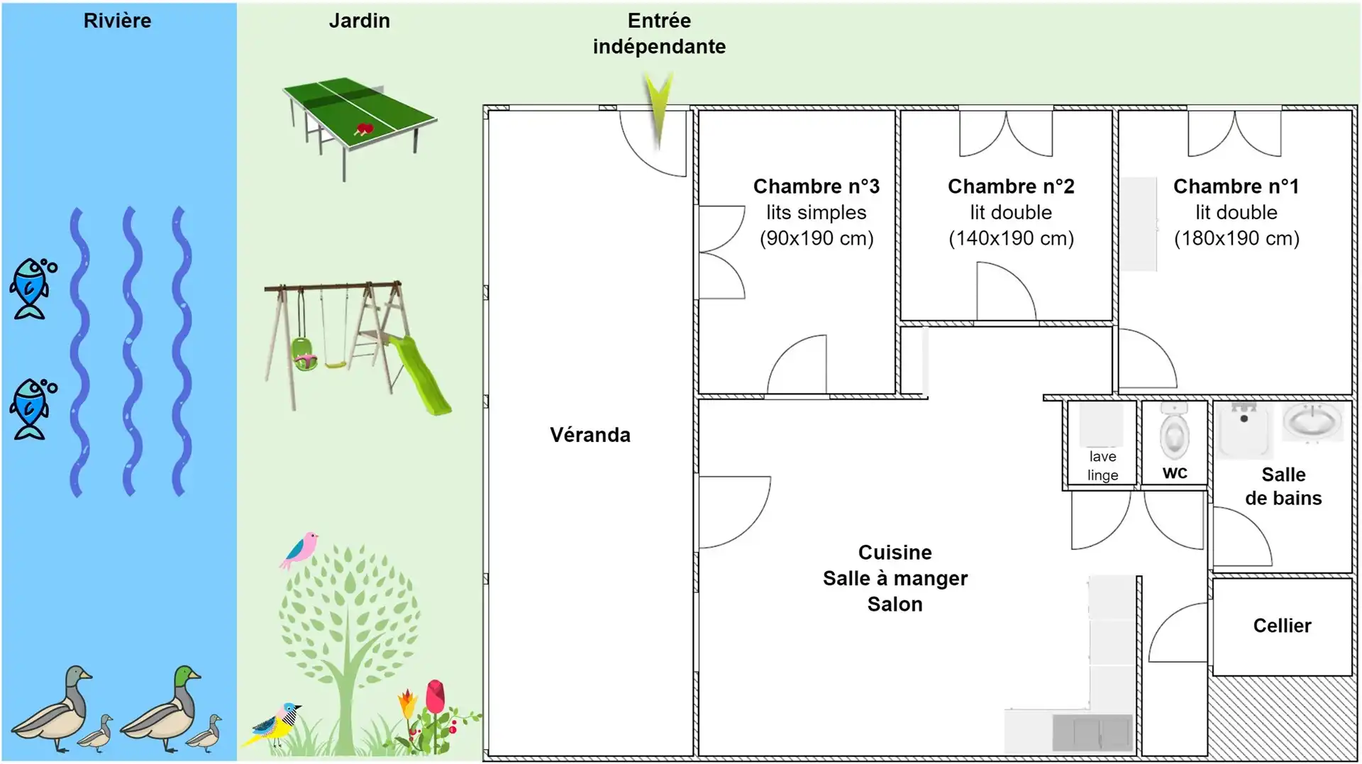 U heeft een bevoorrechte omgeving aan de rand van de rivier met een groot schaduwrijk en aangelegd perceel (tuinmeubelen, schommel, tafeltennis).