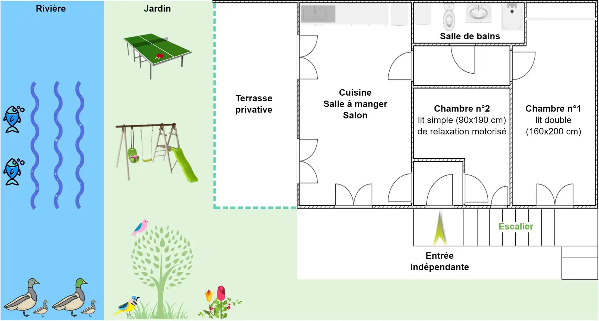 - Gelegen op de eerste verdieping, aan de rand van de rivier en met een eigen ingang.