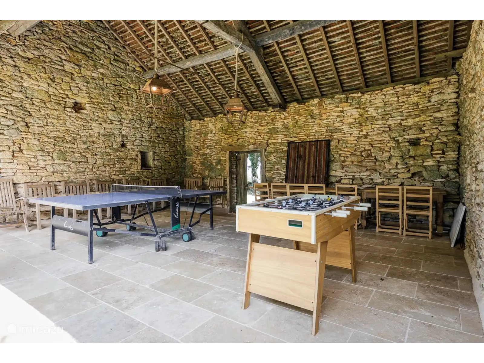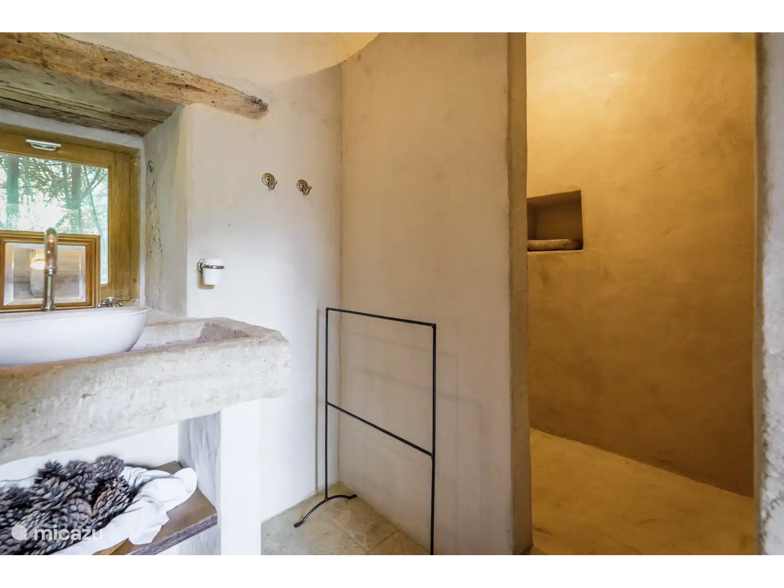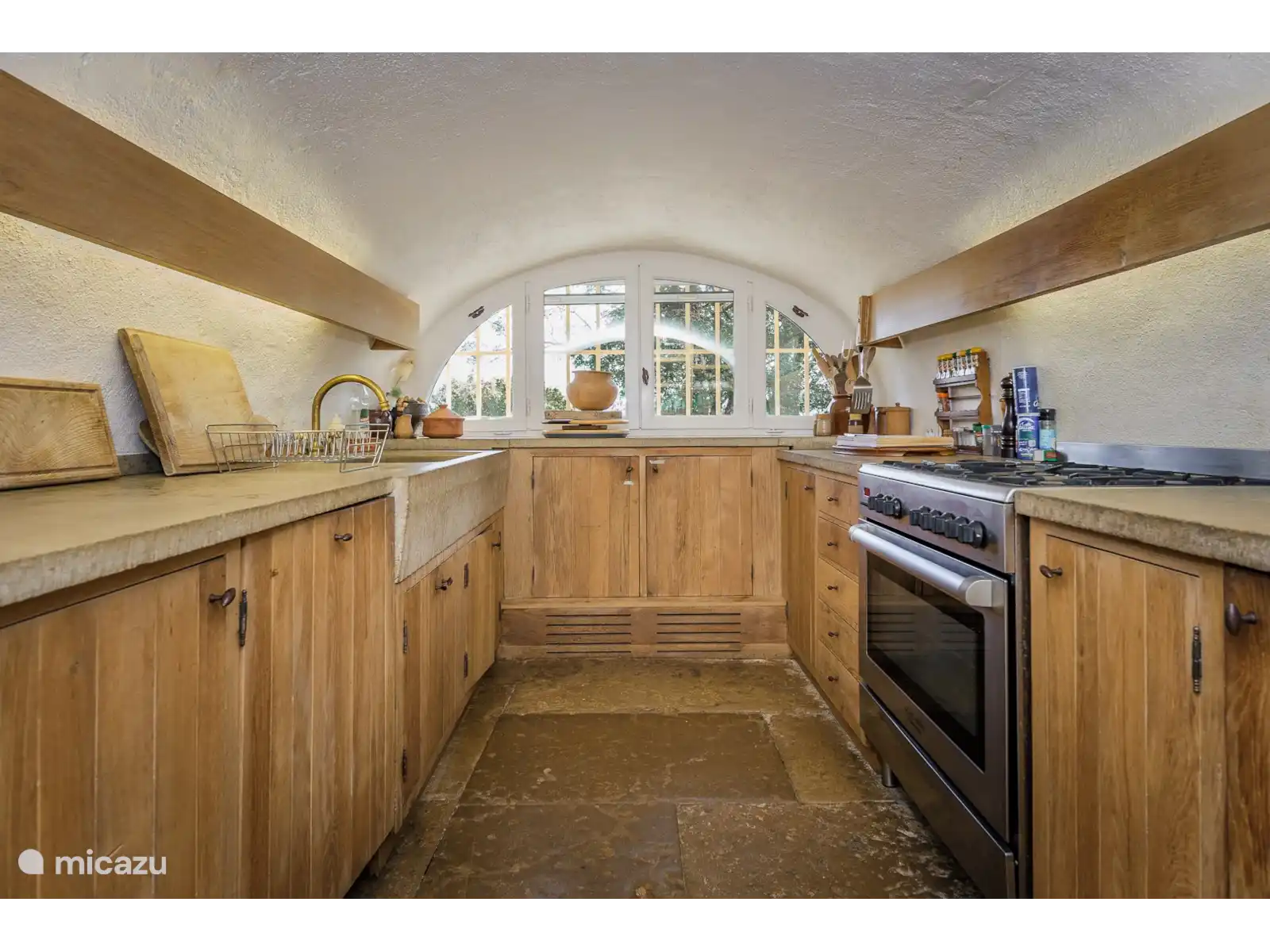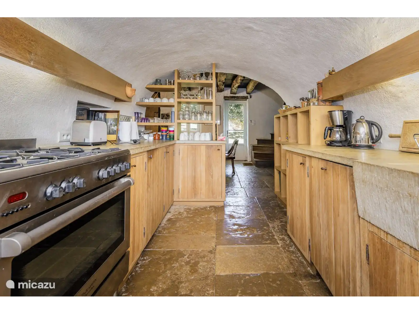 - De keuken omvat een prachtig handgemaakt stenen werkblad en spoelbak. Voldoende kastruimte, fornuis, koelkast, magnetron, vaatwasser, koffiezetapparaat en voldoende servies en bestek (een wasmachine in de bijgebouwen) zijn uiteraard aanwezig.
