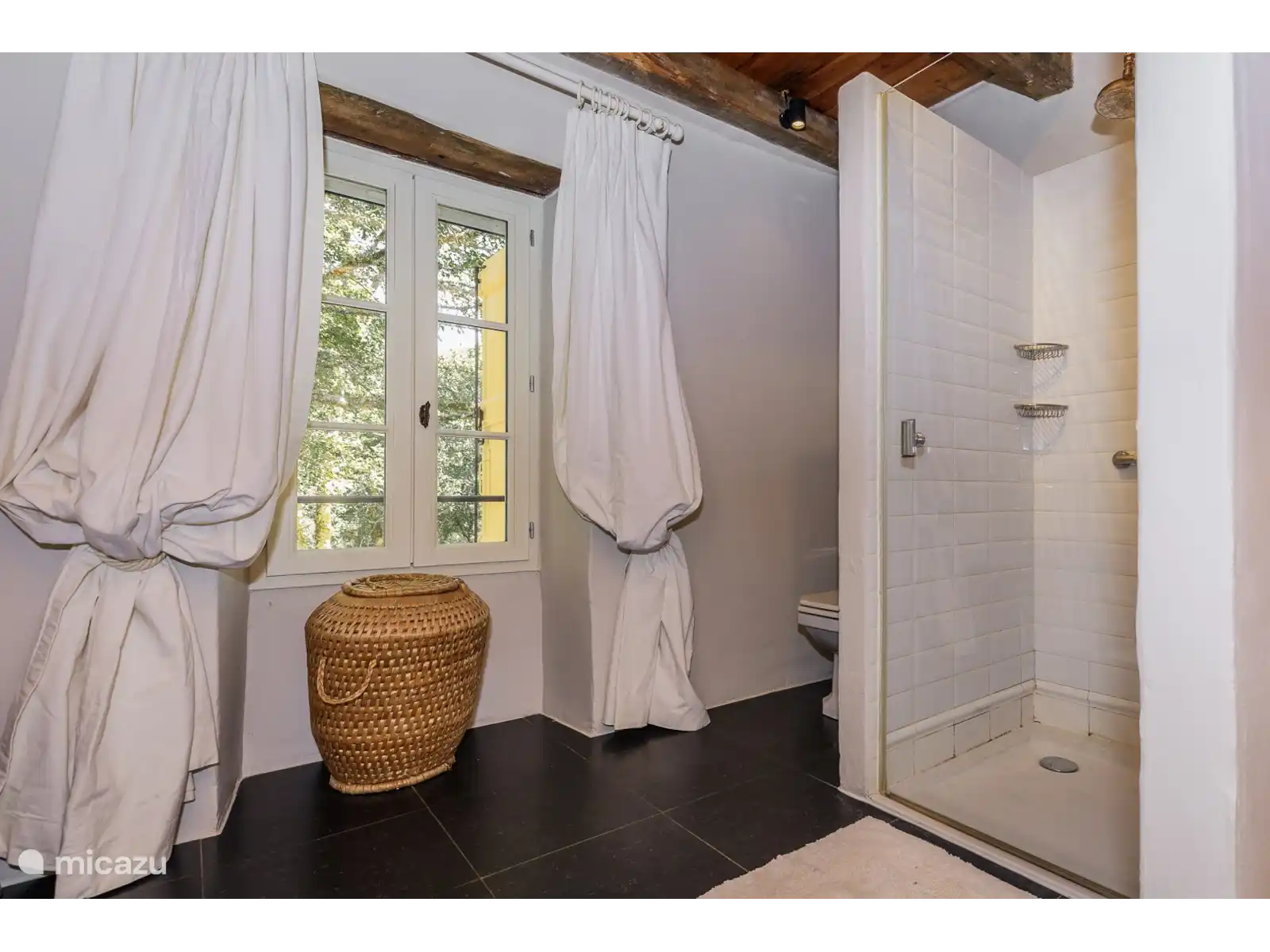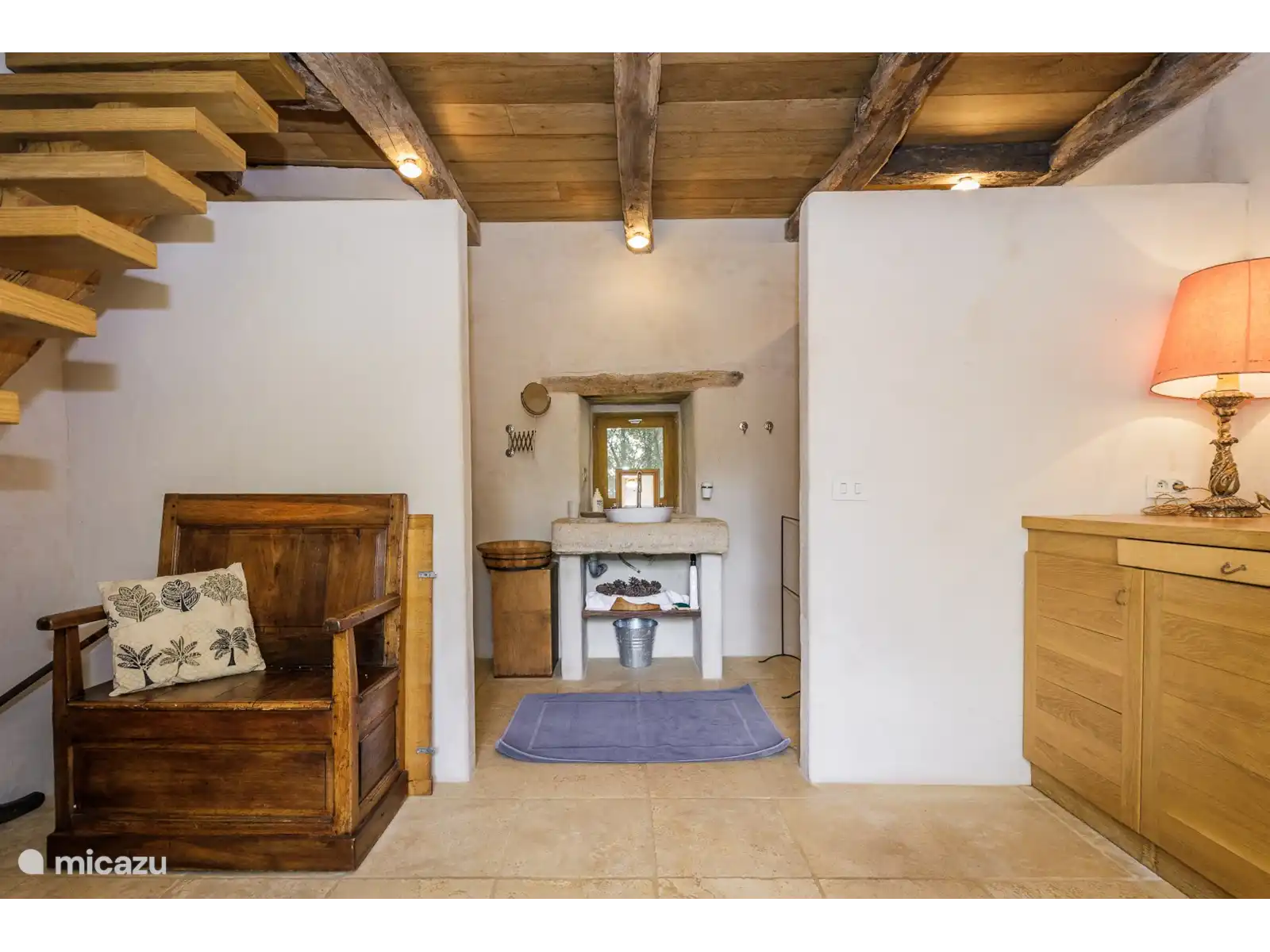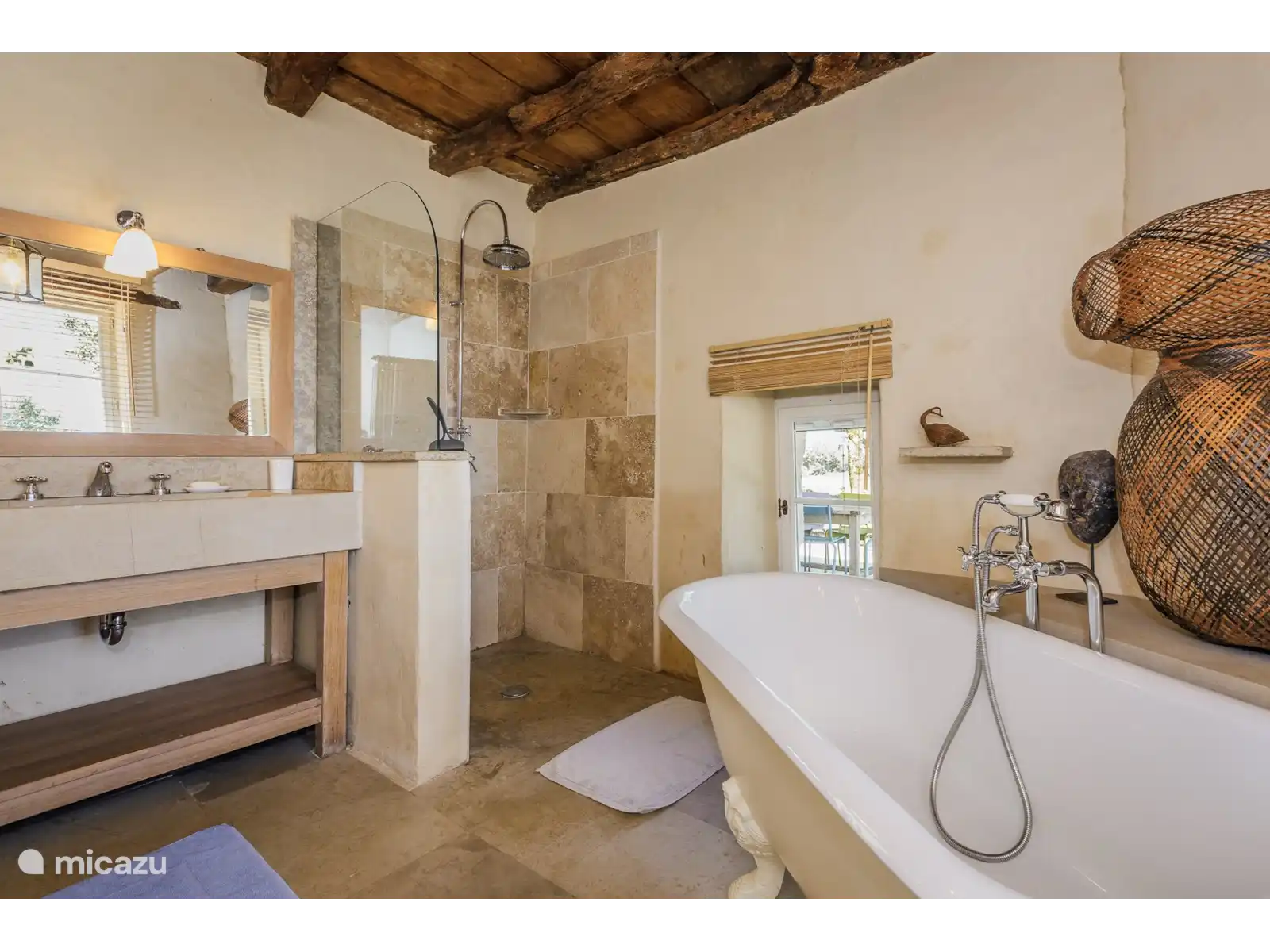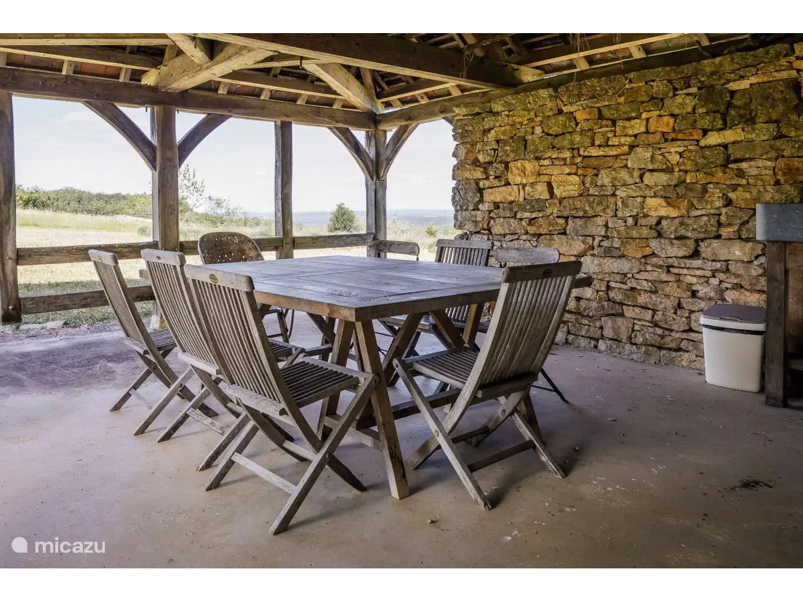 - De keuken omvat een prachtig handgemaakt stenen werkblad en spoelbak. Voldoende kastruimte, fornuis, koelkast, magnetron, vaatwasser, koffiezetapparaat en voldoende servies en bestek (een wasmachine in de bijgebouwen) zijn uiteraard aanwezig.
