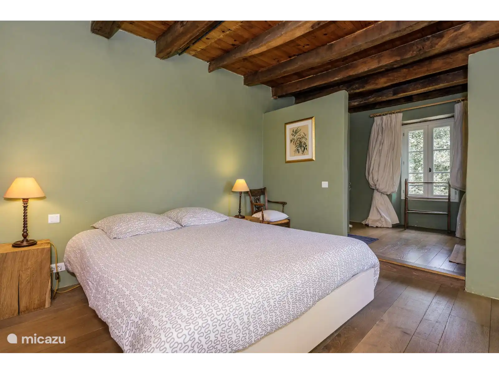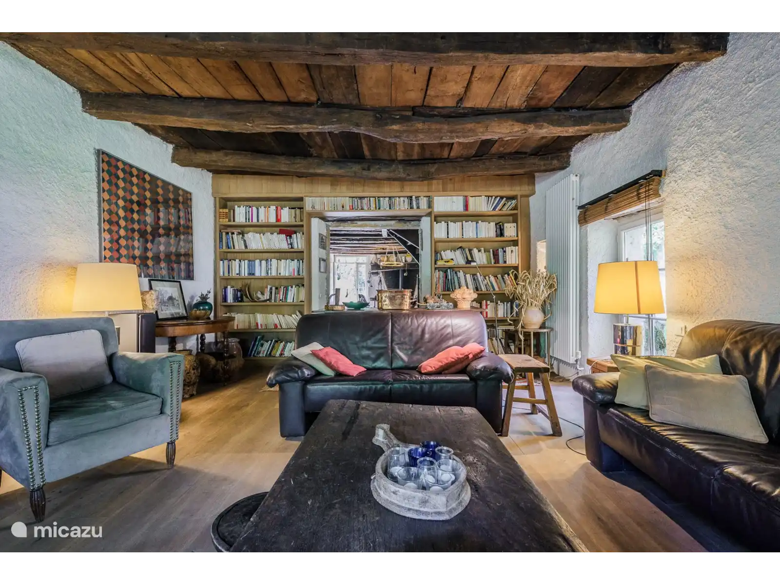 - Een salon met houtkachel, comfortabele stoelen, tv/ dvd/ cd. Vanuit de openslaande deuren kunt u heerlijk genieten van het buitenleven.