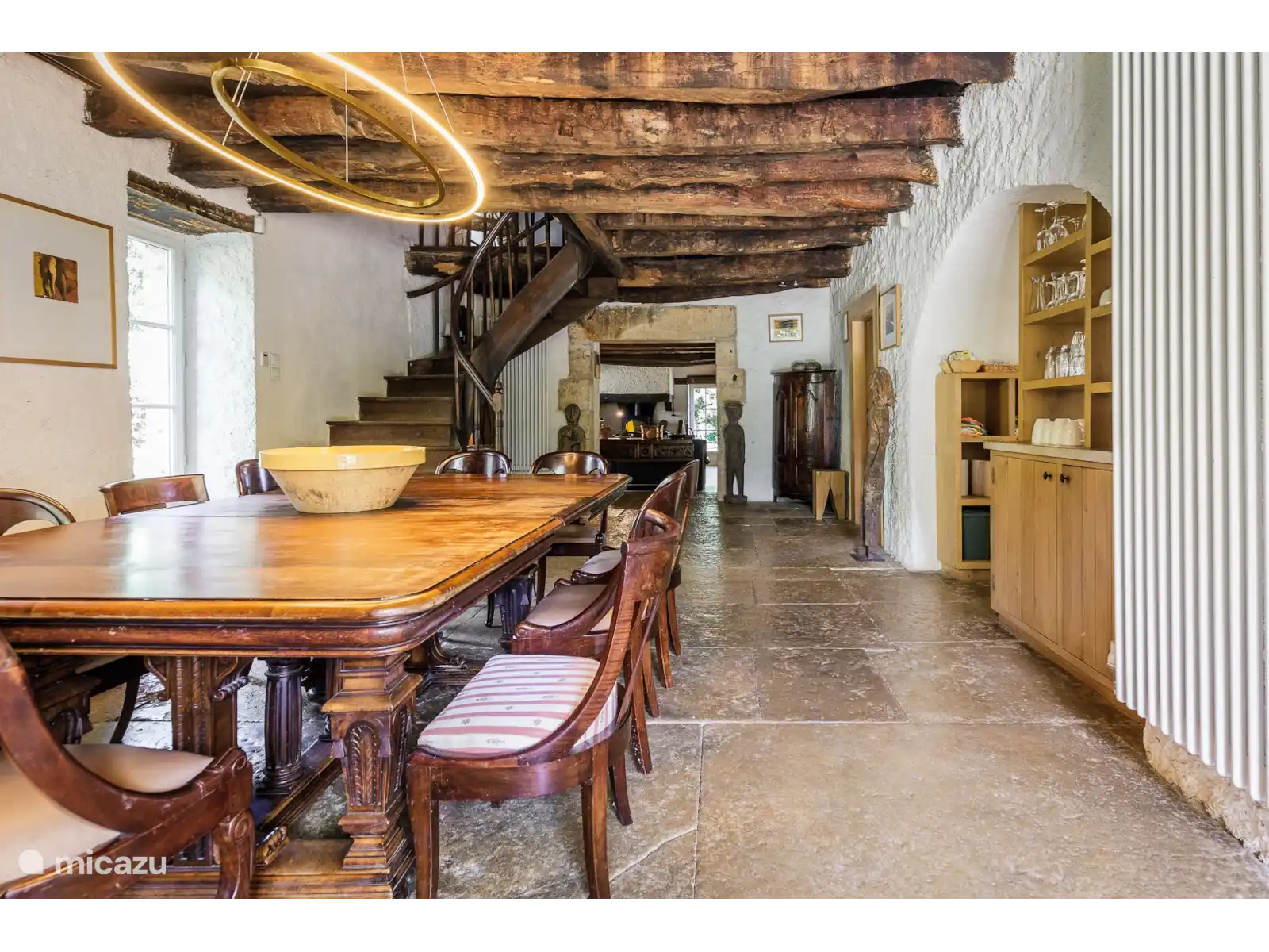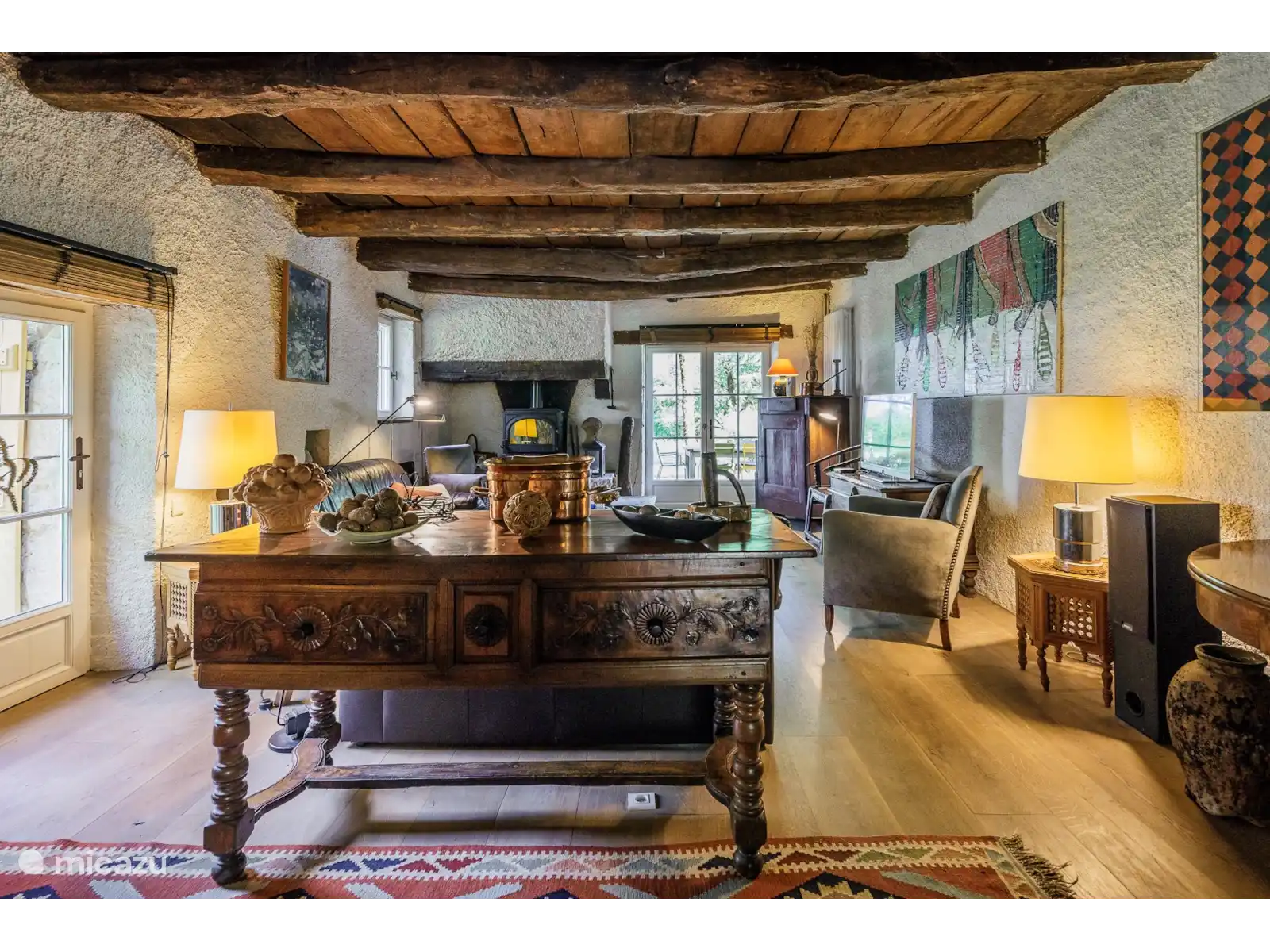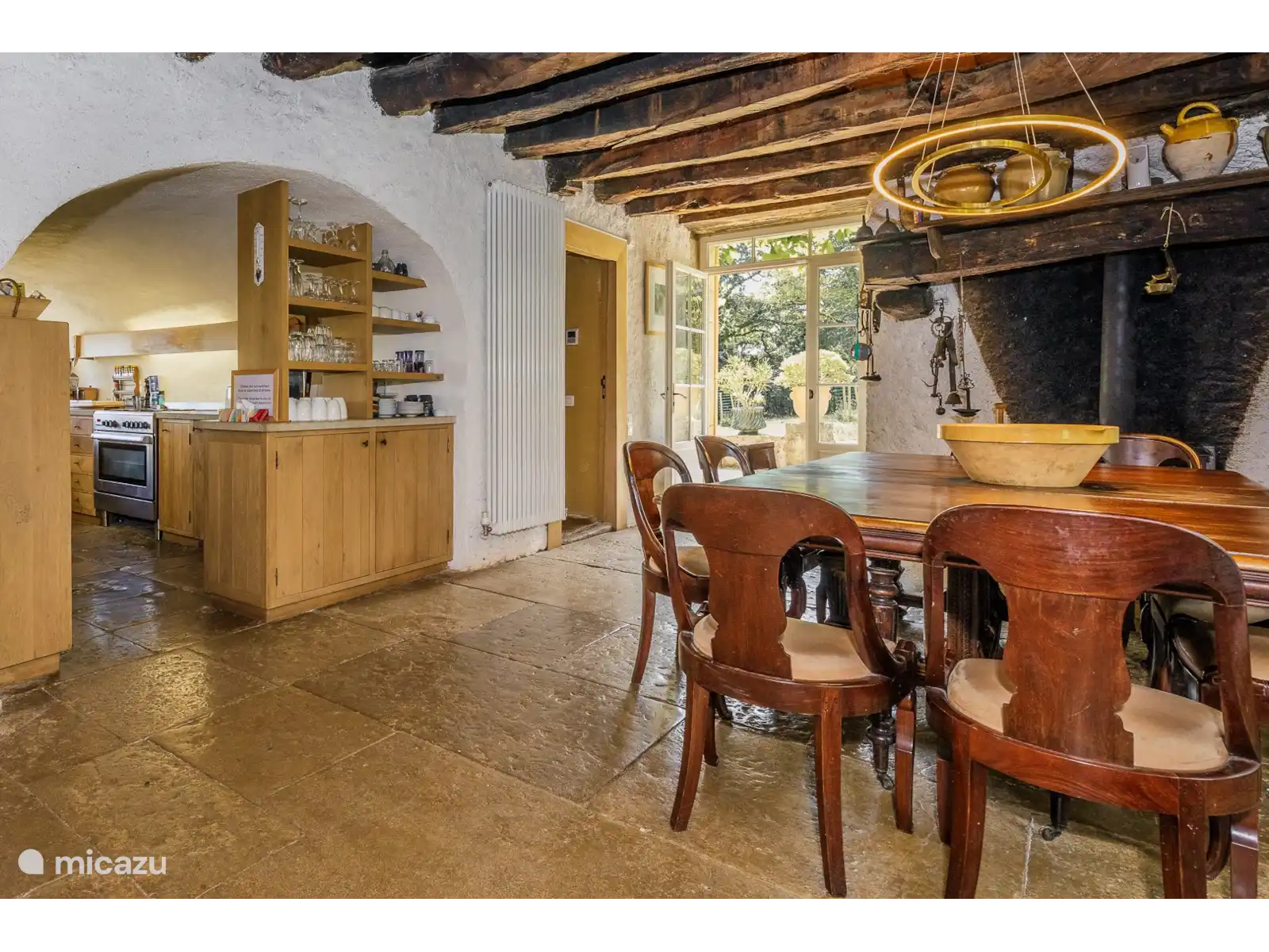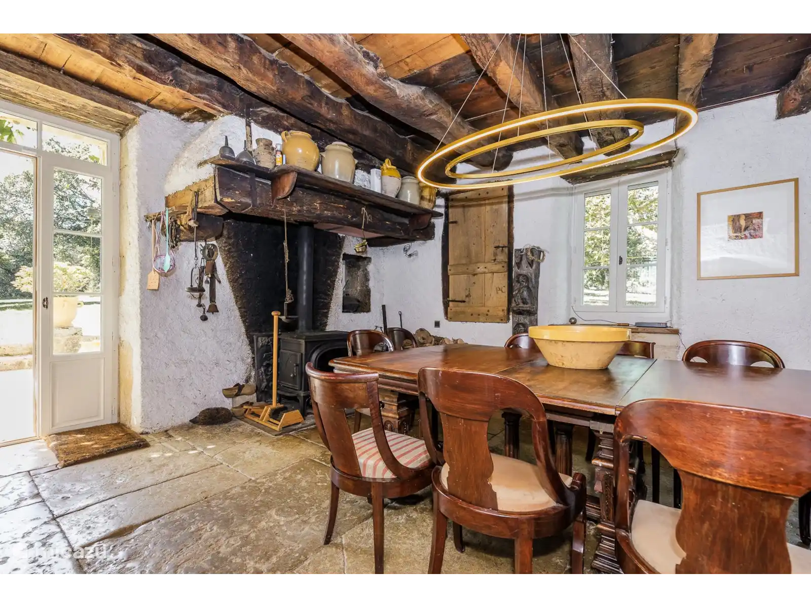 - Een traditionele eetkamer met een prachtige originele plavuizen vloer, een houtkachel en de nog originele eiken balken aan het plafond.