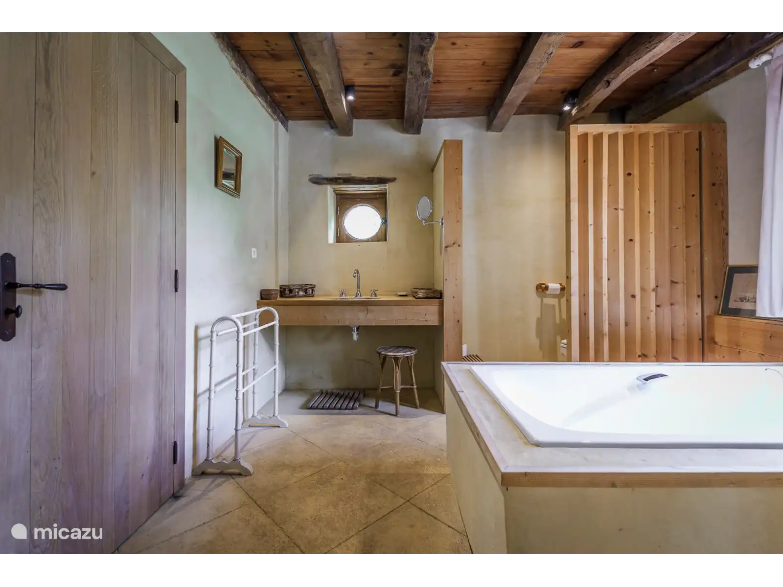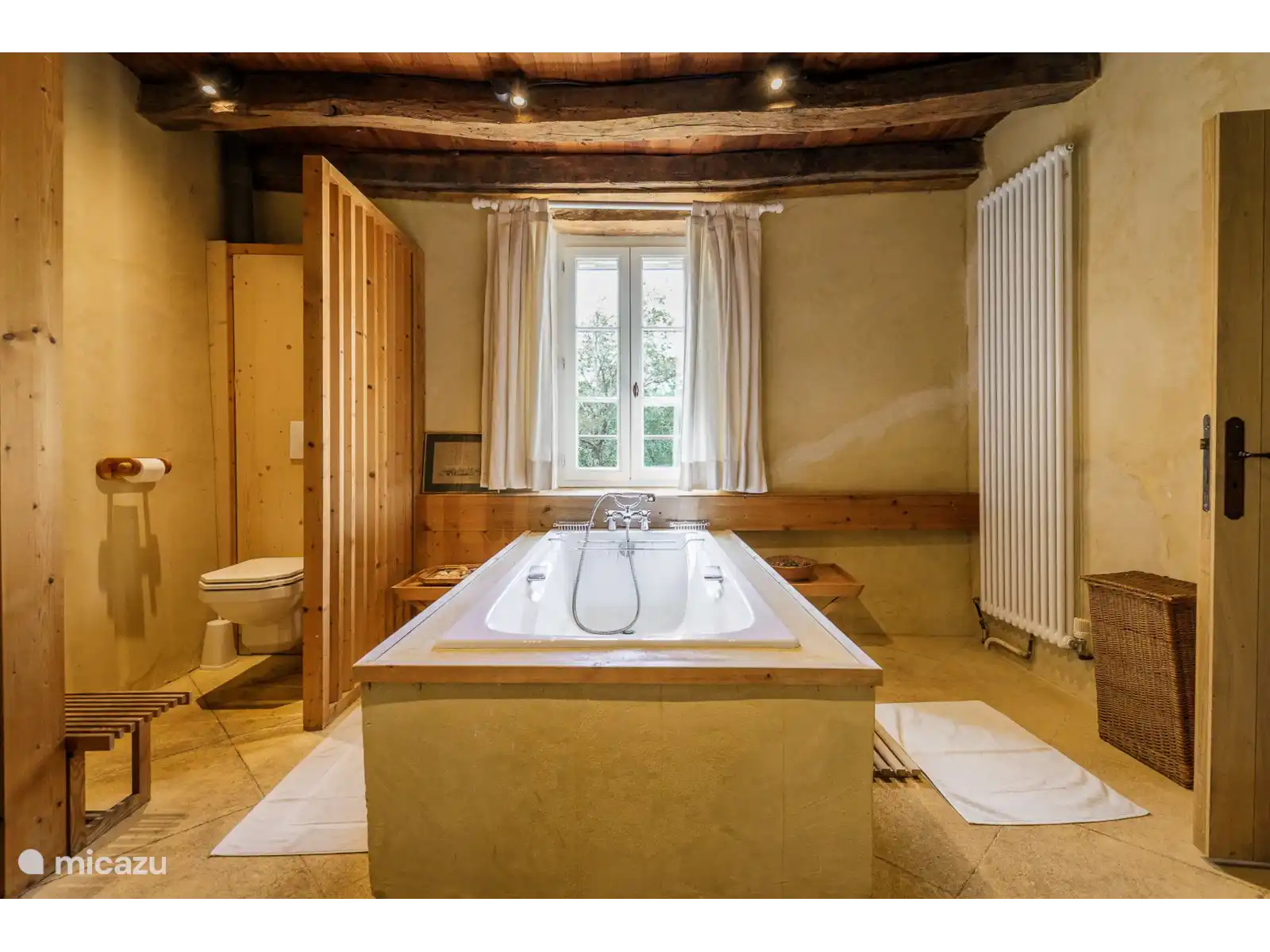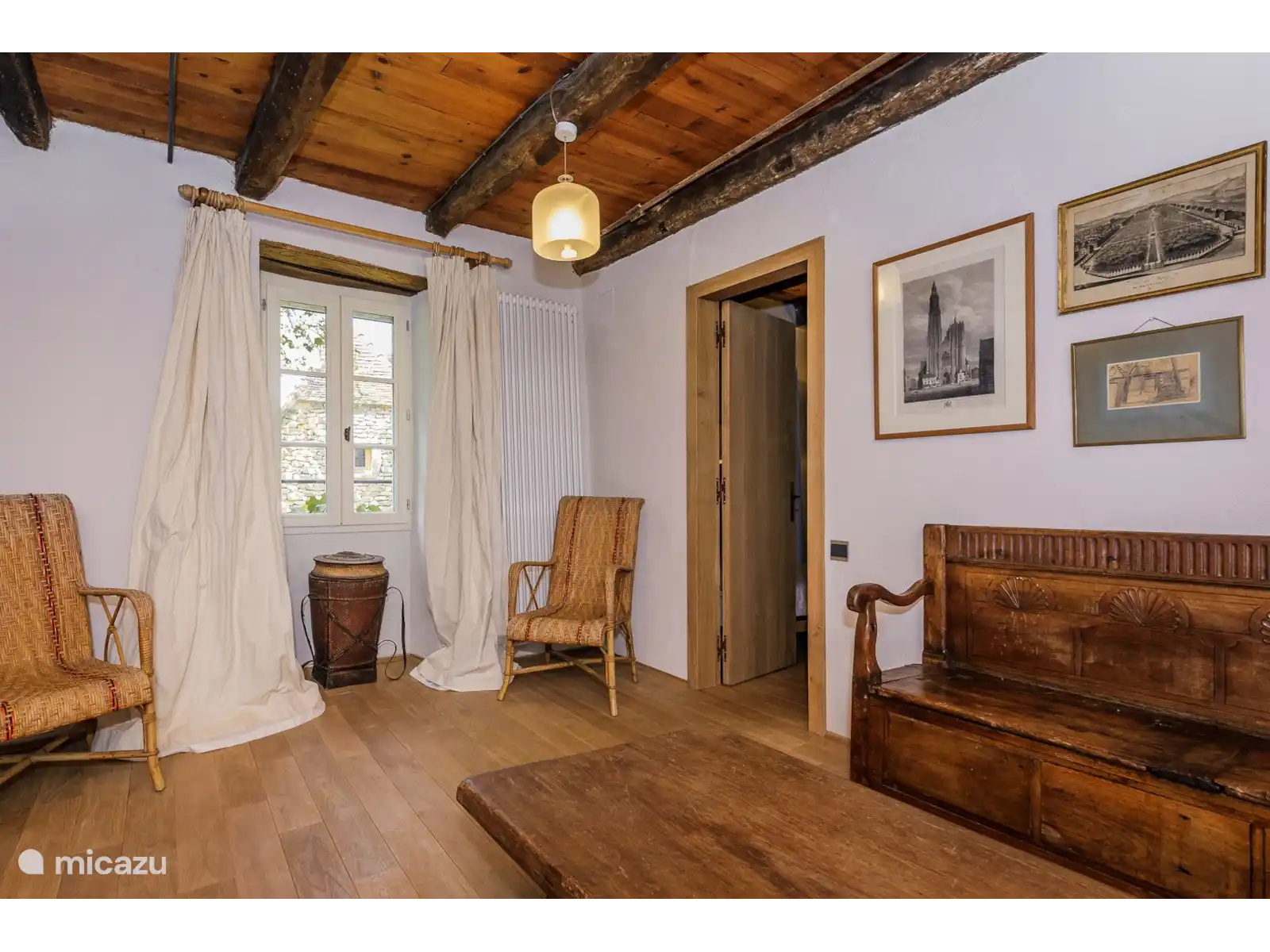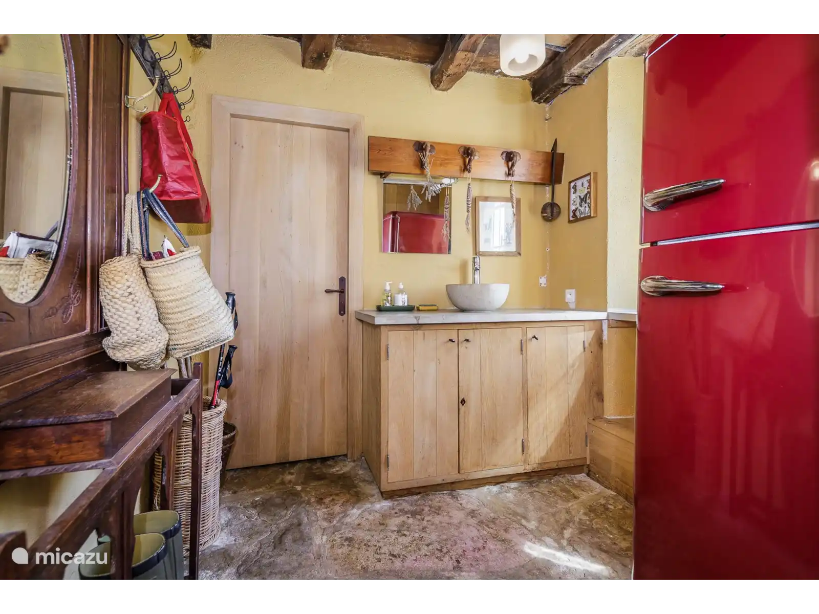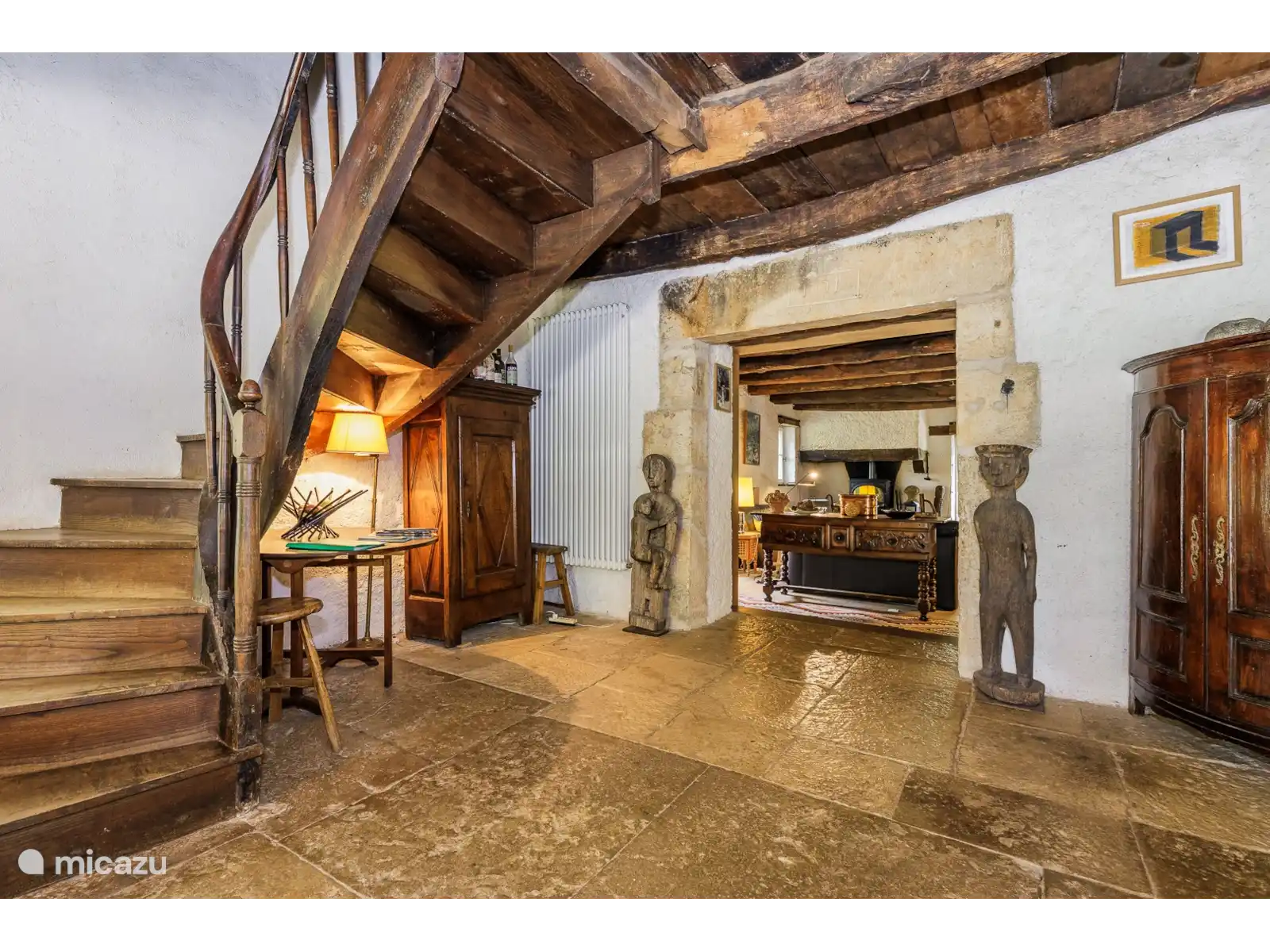 - Een traditionele eetkamer met een prachtige originele plavuizen vloer, een houtkachel en de nog originele eiken balken aan het plafond.