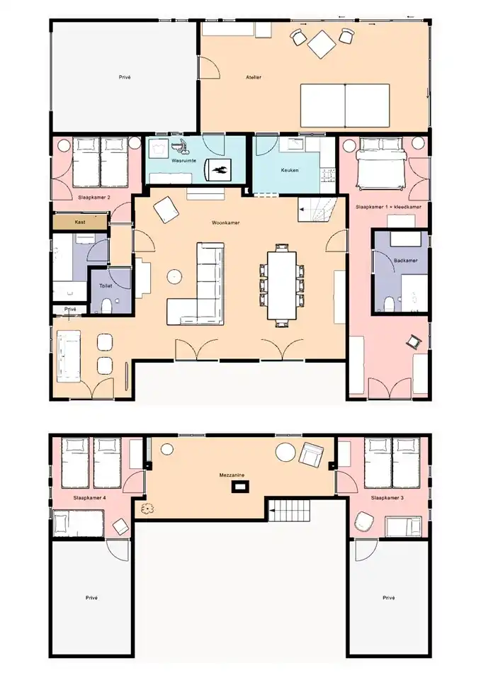 Op de bovenverdieping zijn twee slaapkamers (beiden 13 m2). Een kamer heeft 3 bedden van 90×200, de andere is voorzien van 2 bedden van 90×200 en een ledikant.