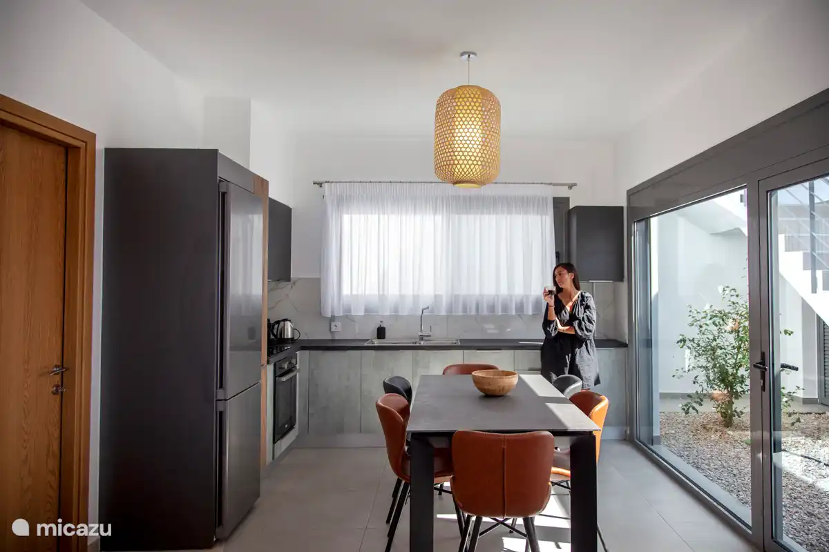 Villa Petalouda, verspreid over één begane grond, bestaat uit 3 slaapkamers en 3 badkamers. Bij binnenkomst in de accommodatie loop je de open woonkamer binnen, die bestaat uit een eetkamer en een volledig uitgeruste keuken. Aan de andere kant is de ruime lounge die door de raamdeuren met natuurlijk licht wordt gevuld die uitkomen op het privézwembad.