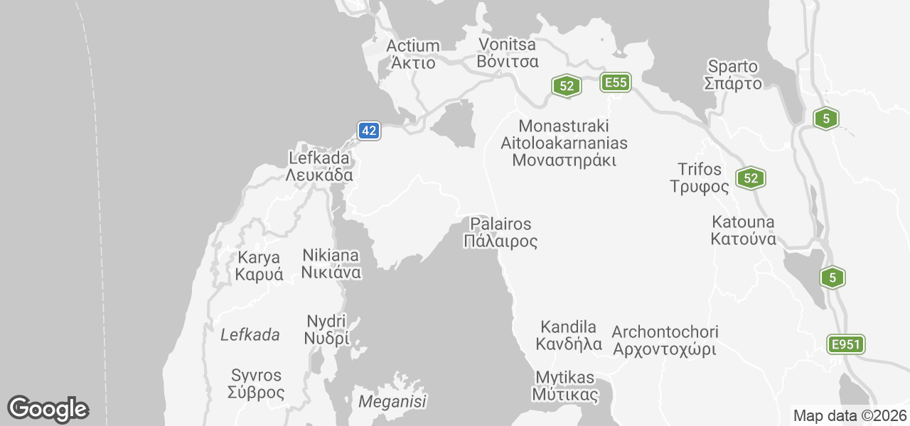 Lefkada-eiland, verbonden met het vasteland via een brug, is gemakkelijk bereikbaar met de auto en de stad Preveza is op ongeveer 40 minuten rijden.