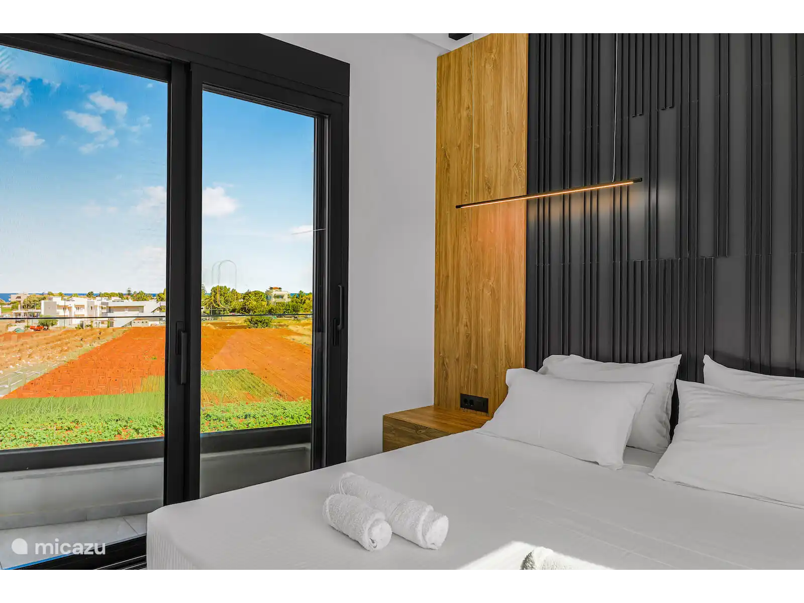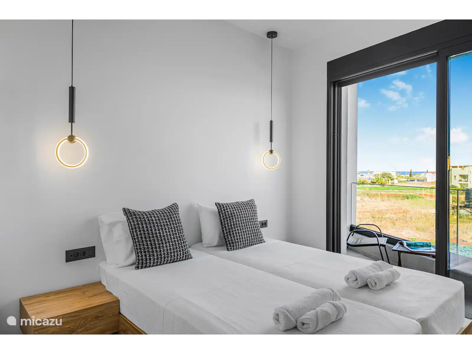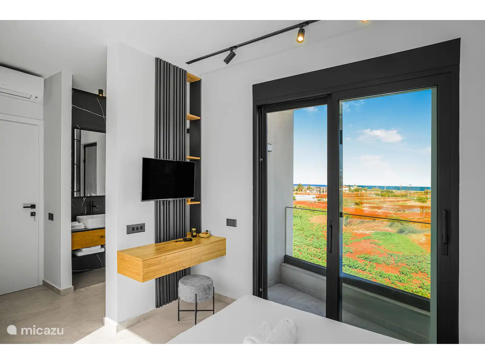 Twee slaapkamers komen uit op privébalkons met een prachtig uitzicht, waarvan er één ook door een groot raam uitzicht op de bergen heeft. Een andere slaapkamer heeft een groot panoramaraam met ononderbroken zeezicht, waardoor de villa de hele dag door wordt gevuld met natuurlijk licht en een serene sfeer.
