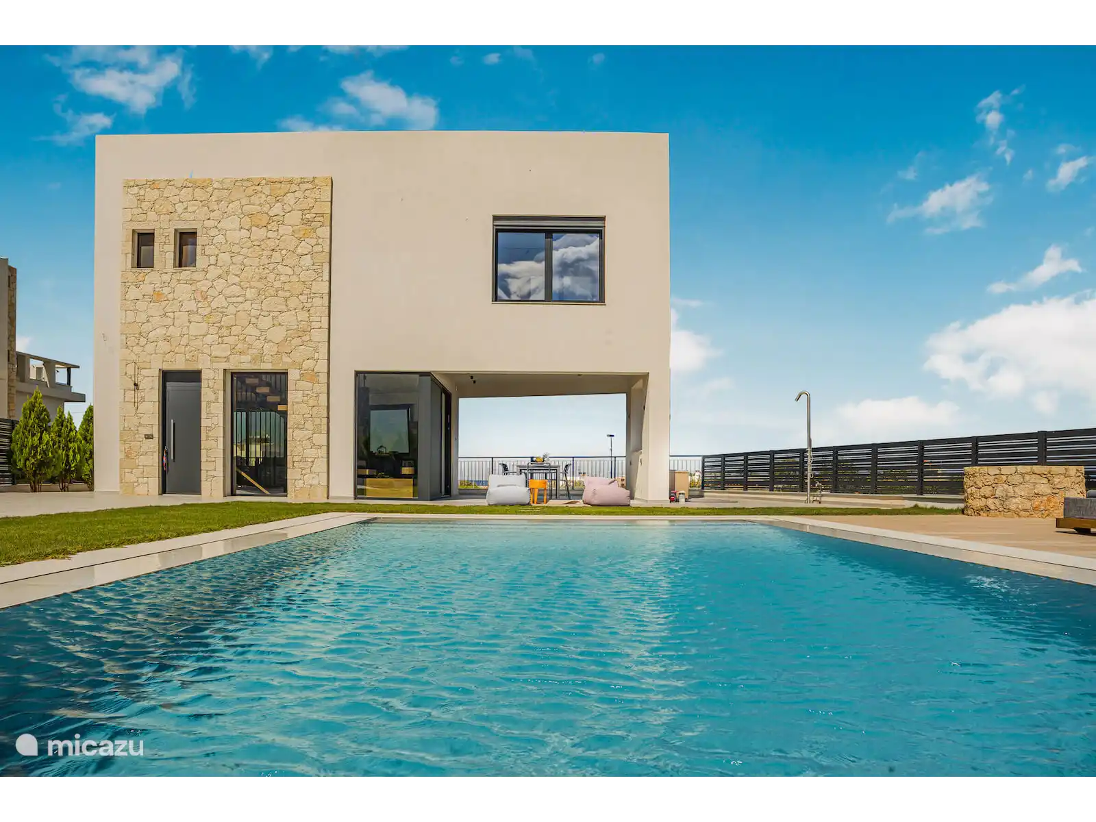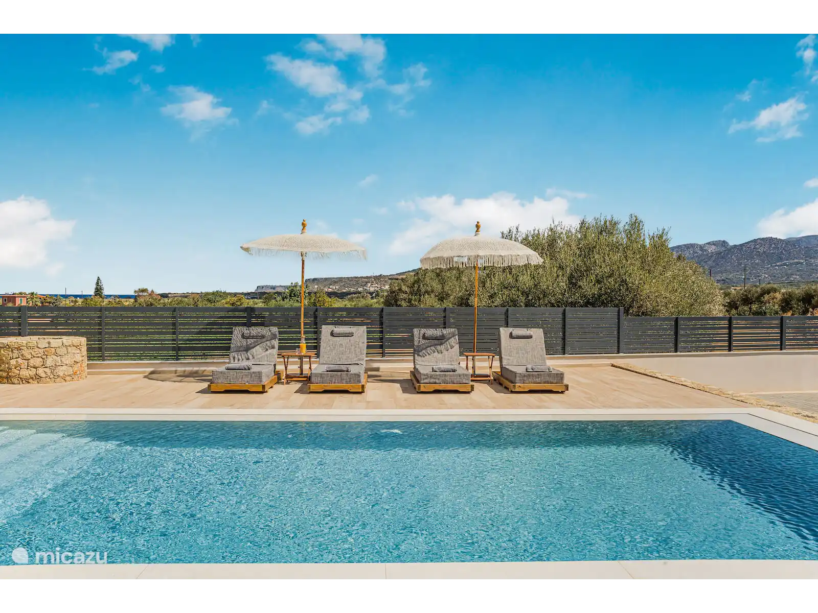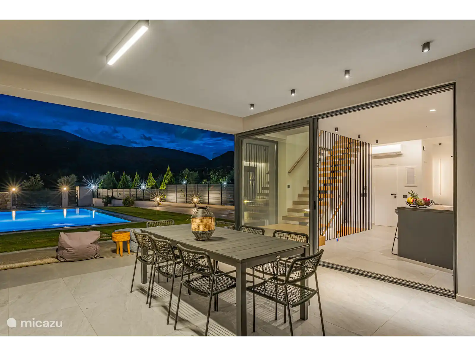 Stap naar buiten naar je privézwembad van 40 m², omringd door ligstoelen en een ruime terras. Het buitenterras biedt een grote eettafel met plaats voor maximaal 12 gasten, ideaal voor maaltijden in de buitenlucht terwijl je geniet van panoramisch zeezicht en gedenkwaardige zonsondergangen.
