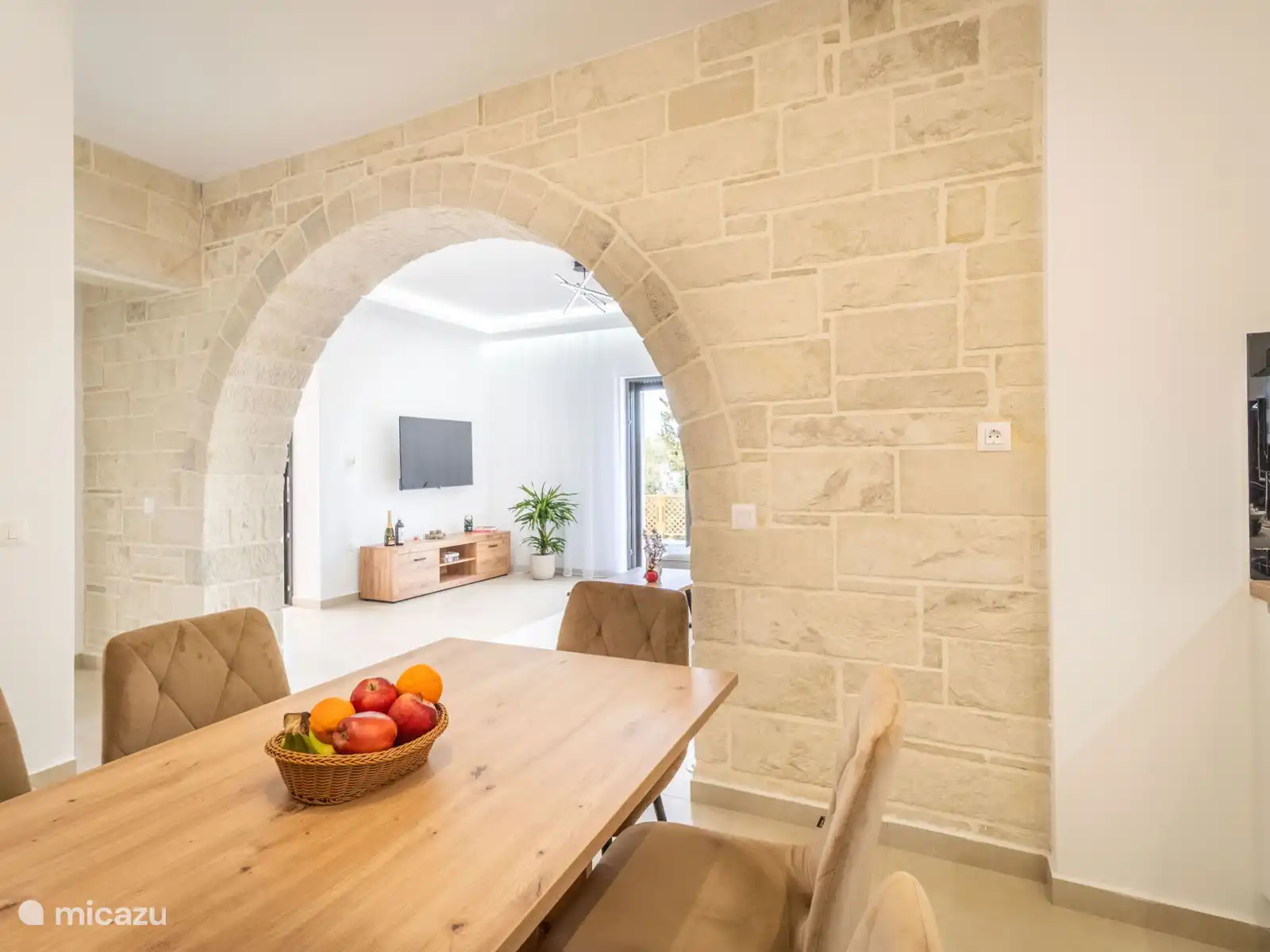 Deze stijlvolle villa verwelkomt gasten in een licht en modern interieur, ontworpen voor maximaal comfort. Op de begane grond bevindt zich een ruime woonkamer met eethoek en een volledig uitgeruste keuken met een kookplaat, oven, koelkast, vriezer, vaatwasser, magnetron, broodrooster en een Amerikaans koffiezetapparaat. Op deze verdieping vindt u ook een tweepersoonsslaapkamer met airconditioning en een badkamer met douche.