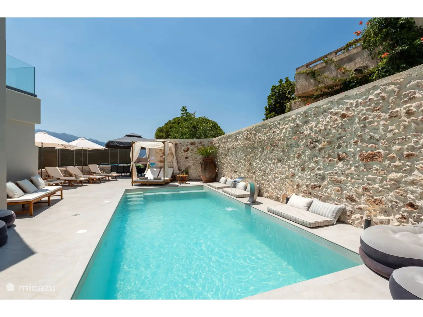 Buiten kunnen gasten genieten van een panoramisch terras met uitzicht op zee, een privézwembad (7 x 3,5 meter; diepte: 1,4 meter), een barbecueplek en voldoende ruimte om te dineren en te ontspannen in de buitenlucht.