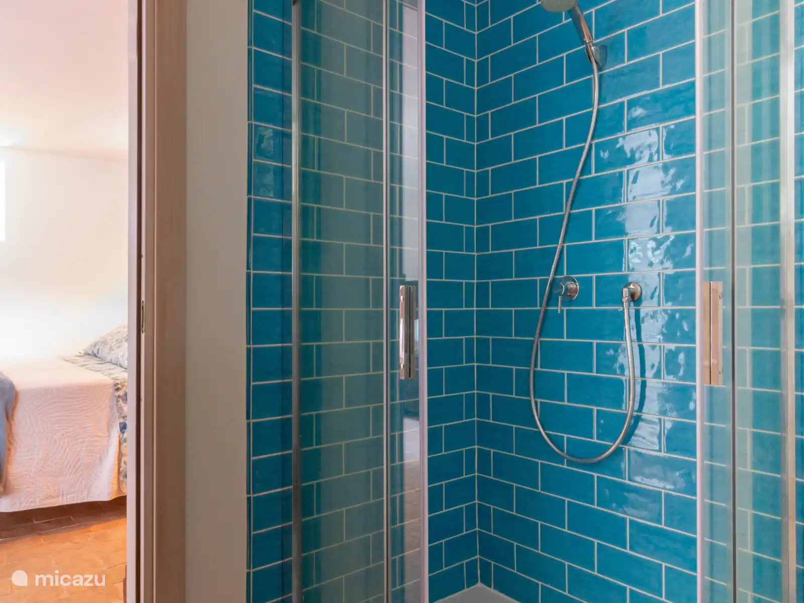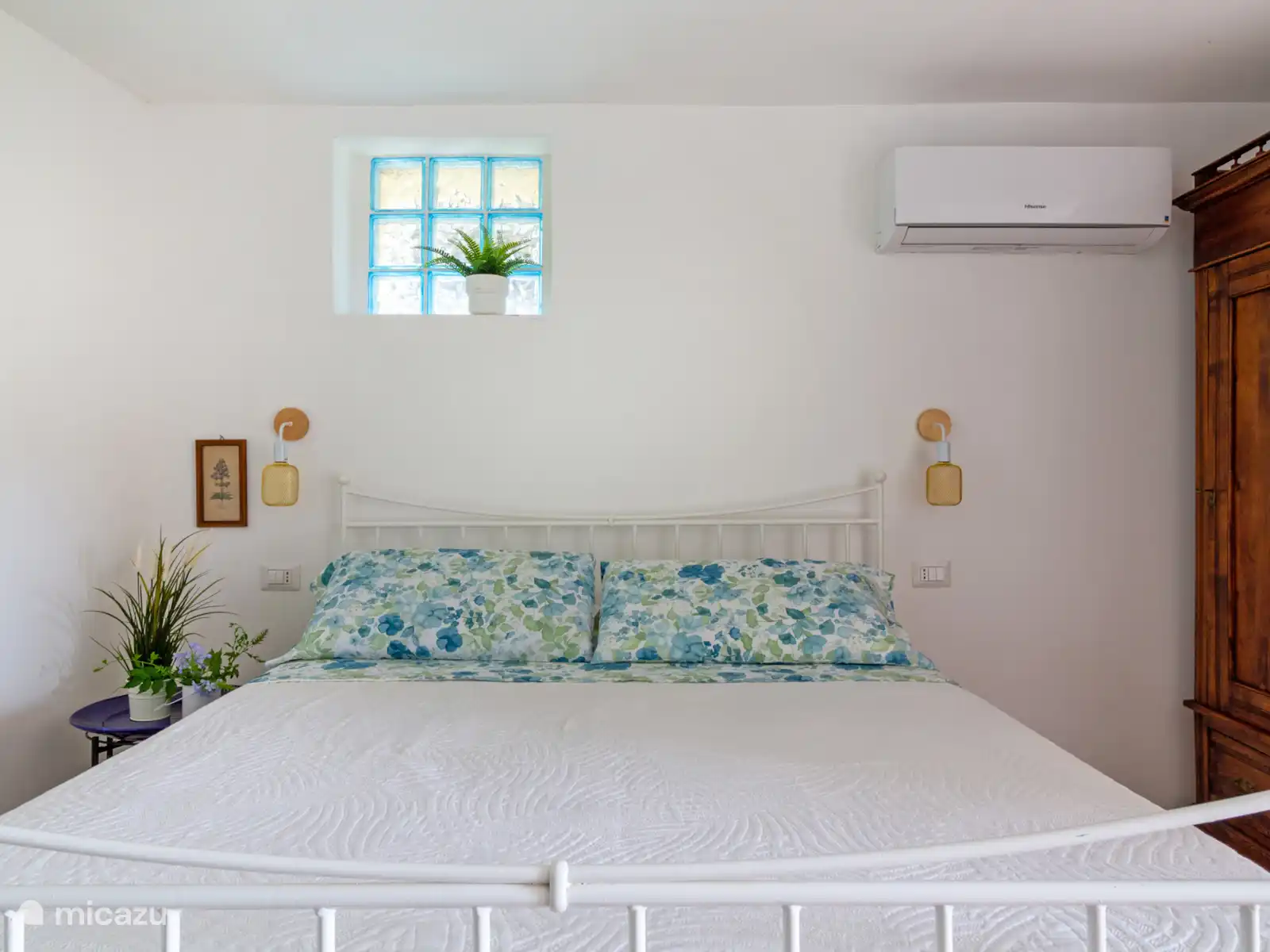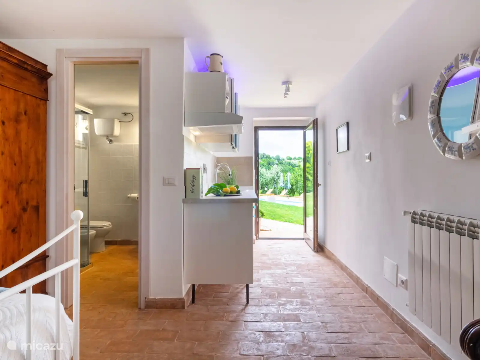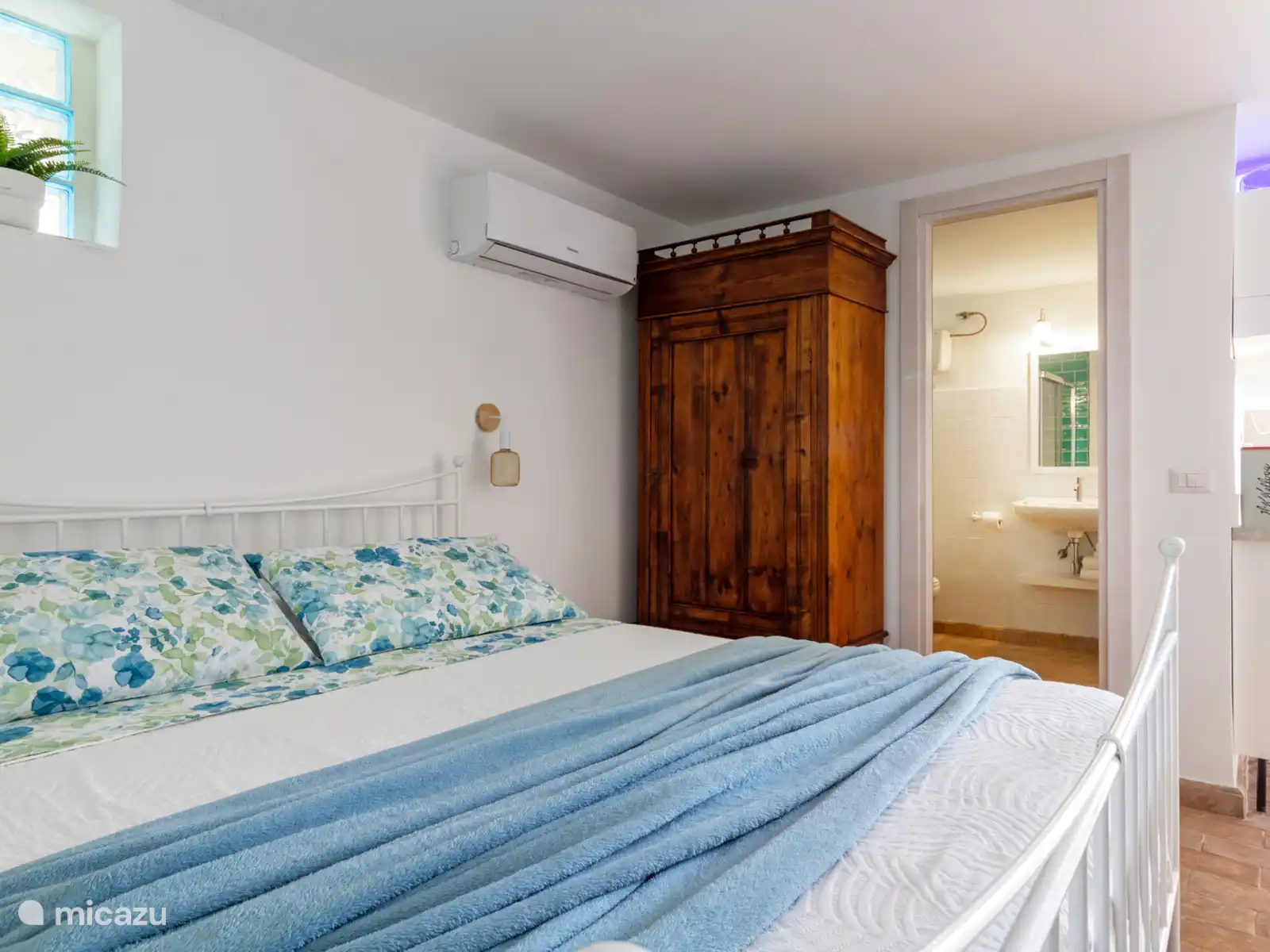 Vanuit de tuin loop je naar de benedenverdieping waar zich een charmant studio-appartement bevindt – met eigen badkamer, keukenblok en een fijn bed. Ideaal wanneer bijvoorbeeld grootouders meegaan, je met meer gezinnen gaat en je net wat meer privacy zoekt.