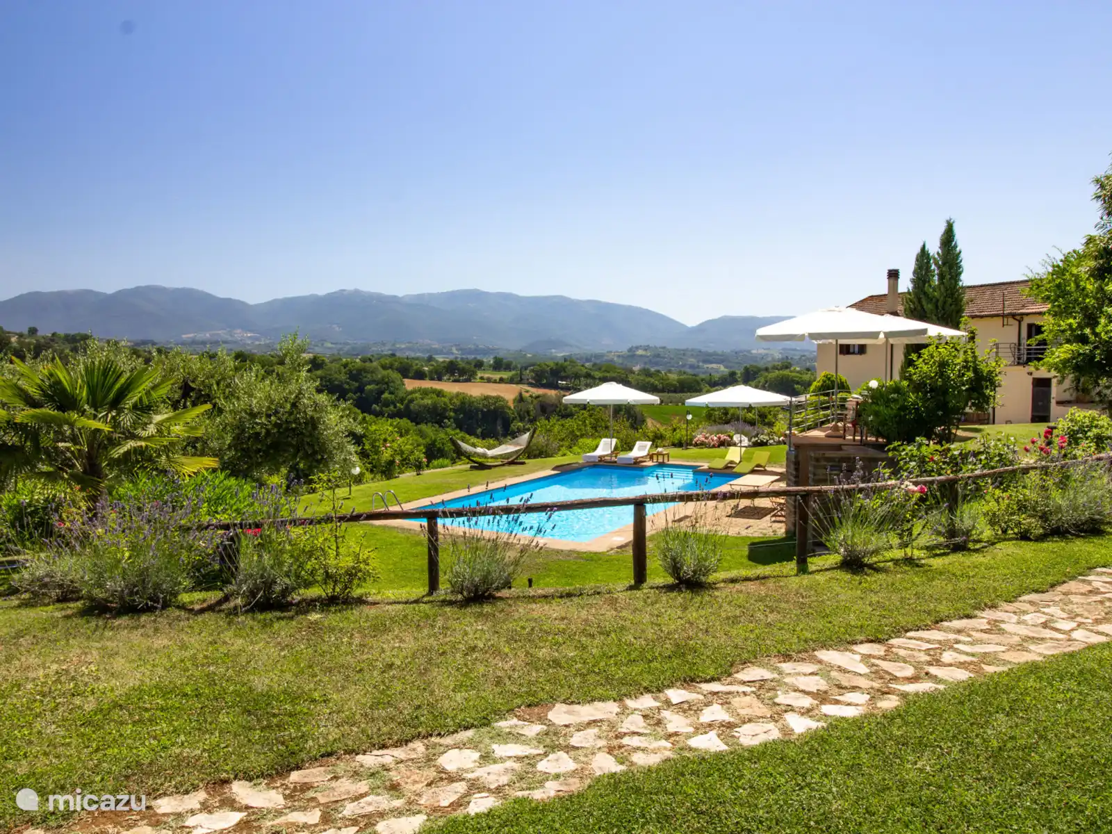 De tuin is royaal en liefdevol aangelegd, met bloemen, bomen en schaduwrijke plekjes waar tafels en stoelen je uitnodigen om te zitten, te lezen, te eten, te dromen. Ligstoelen staan klaar rond het zwembad; perfect voor lange middagen in de zon of een dutje na de lunch.