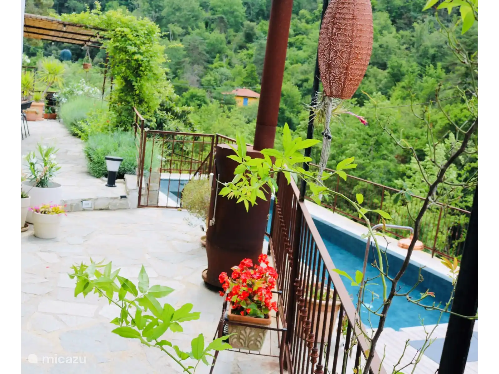 Vanuit de tuin omringd door olijf- en fruitbomen heeft u zicht op de prachtige beboste bergen en hoort u het kabbelende water van de rivier onderaan het huis.