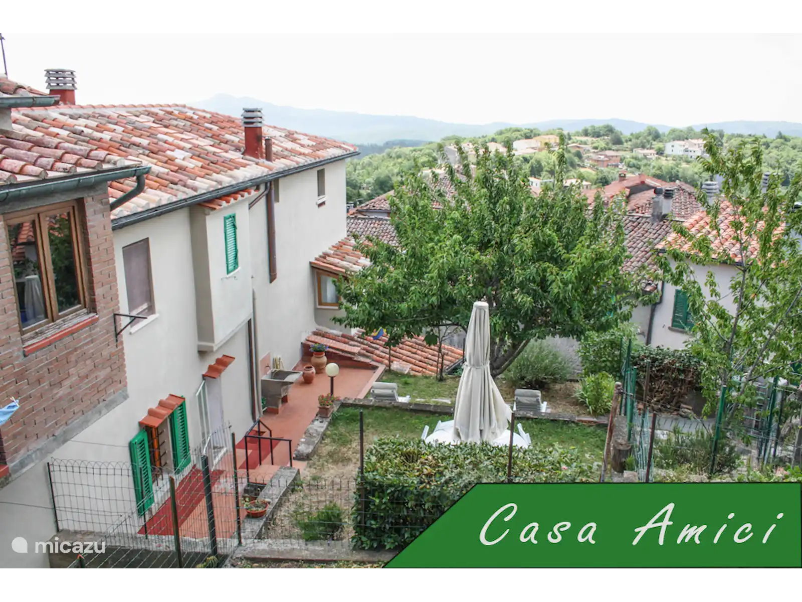 Via het trappenhuis bereik je de eerste verdieping en de voordeur. Op deze verdieping heeft het huis een woonkamer met slaapbank, twee slaapkamers met maximaal 6 bedden, een badkamer en een deur in de lange gang met toegang tot de eigen tuin aan de achterkant. Het is een dorpstuin met zitje die een Toscaanse sfeer ademt door het groen, de kersenboom, de omliggende rode pannen daken en de heuvels in de verte. Achter de tuin liggen een aantal kleine stukjes grond van de buren rondom. Een heerlijke plek om een boek te lezen of te genieten van het dineren al fresco met op de achtergrond soms typisch Italiaanse burengeluiden. De tuin is helemaal met muurtjes en een hek afgesloten dus geschikt voor honden.