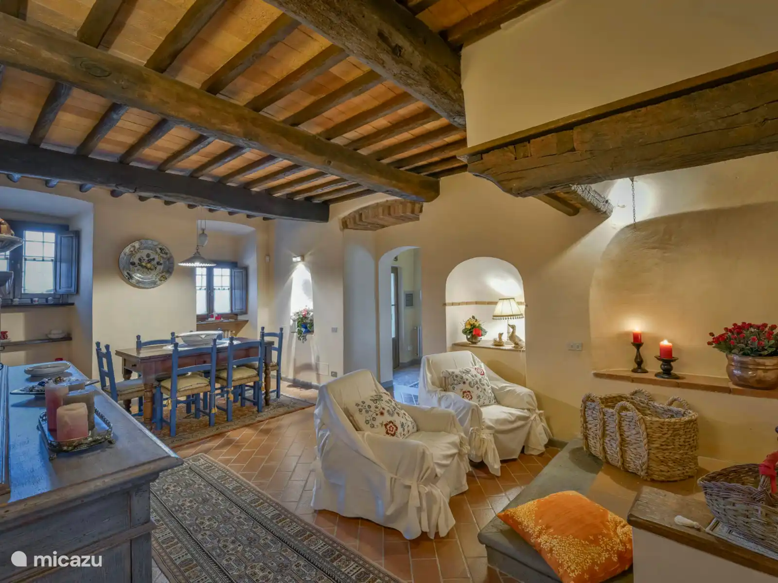 De eerste verdieping, die zowel van binnen als van buiten toegankelijk is, beschikt over een woonkamer met een bruikbare open haard en piano, een volledig uitgeruste keuken, een tweepersoonsslaapkamer met een en-suite badkamer (bad en douche), een slaapkamer met twee eenpersoonsbedden (om te bouwen tot een tweepersoonsbed) en een extra tweepersoonsslaapkamer met eigen badkamer. Alle slaapkamers zijn voorzien van airconditioning en ingericht met houten balken, zachte tinten en traditionele Toscaanse charme.